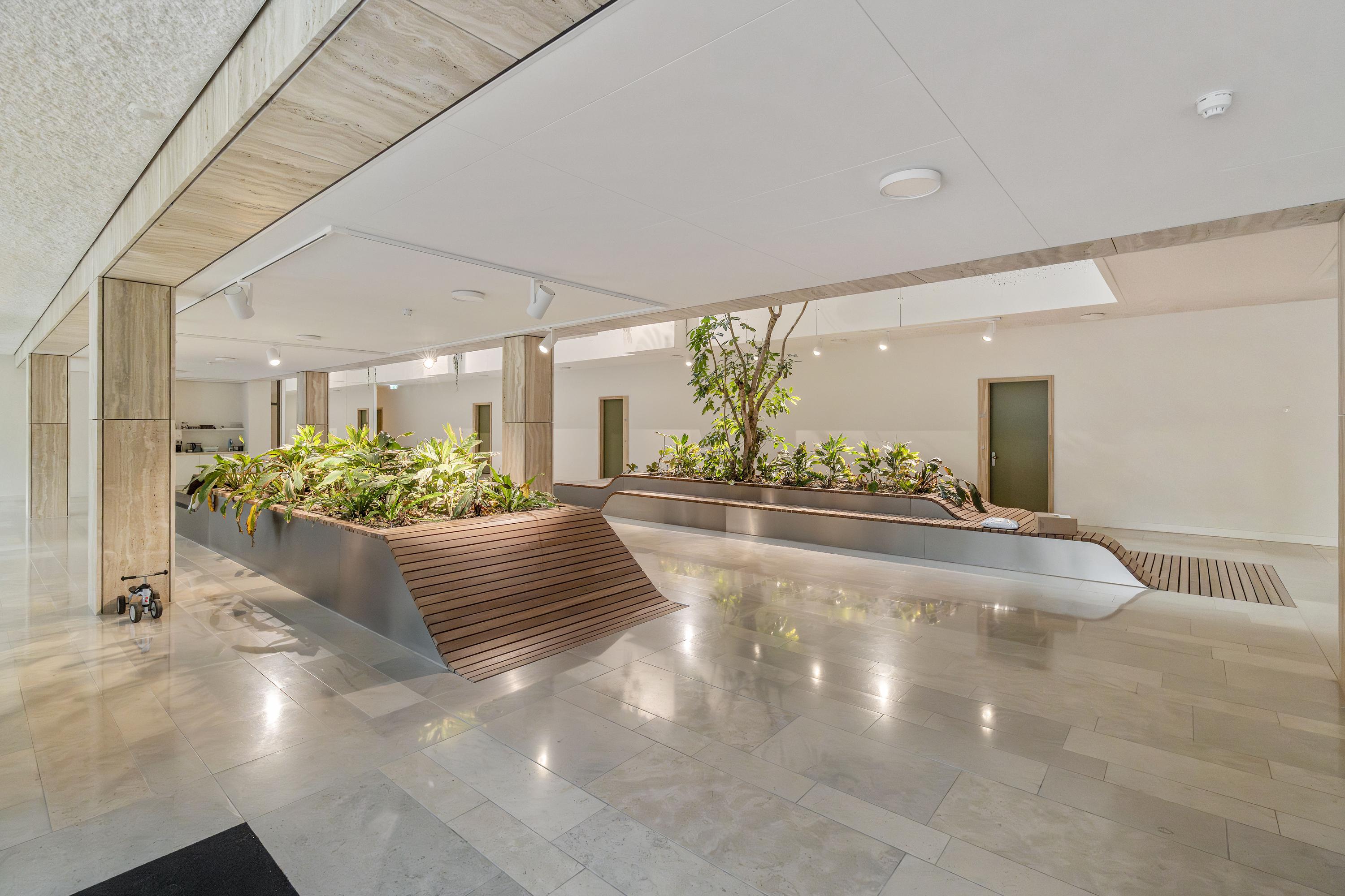 Uniek aan The Cube is het hotelsuiteconcept: de entree en het indrukwekkende atrium zijn ontworpen als een warme, lichte ontmoetingsplek met veel groen, natuurlijke materialen en zitgelegenheden. Hier loopt buiten en binnen naadloos in elkaar over. De gevels zijn bekleed met Portugees travertin, en de daken zijn voorzien van zonnepanelen en groene beplanting.