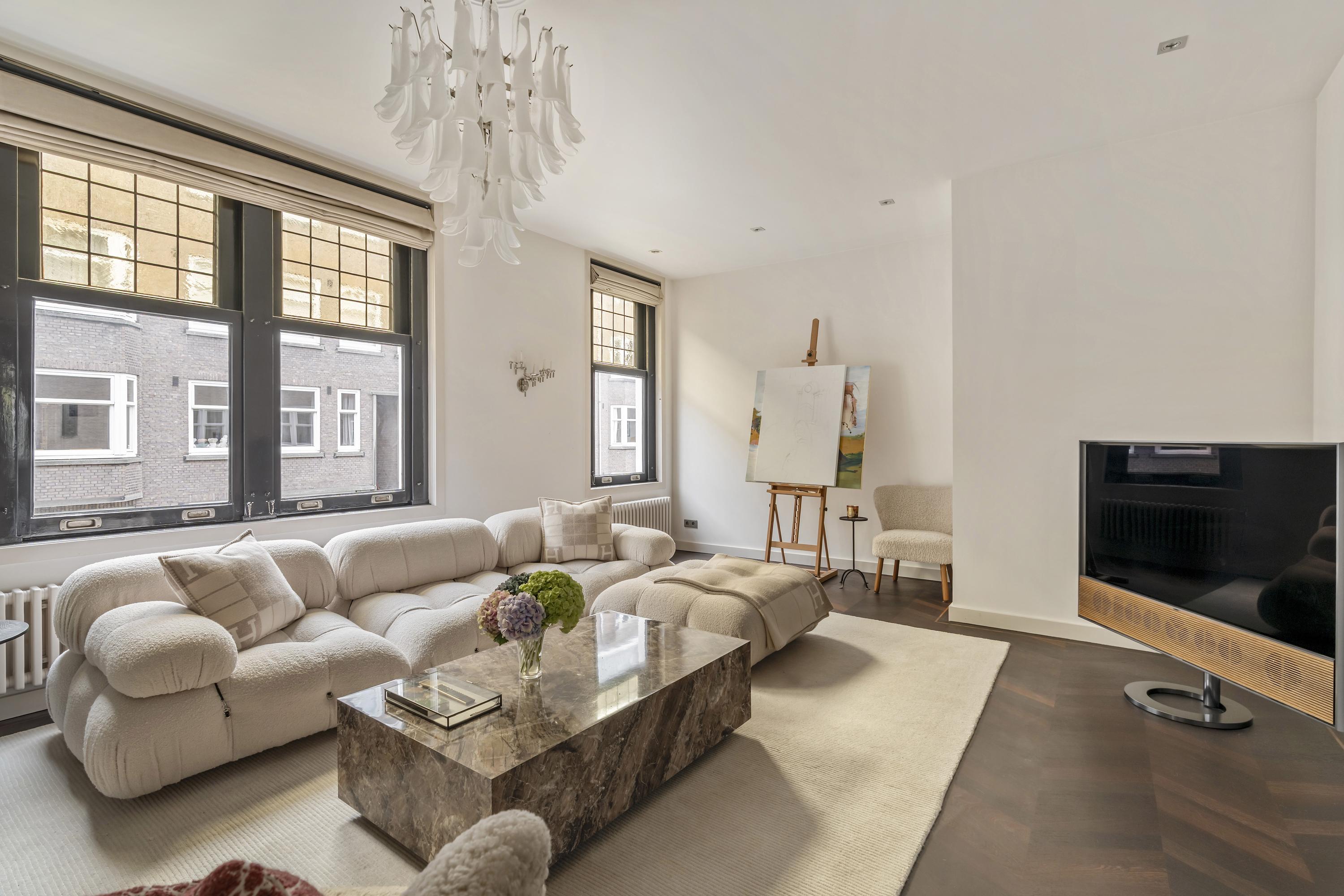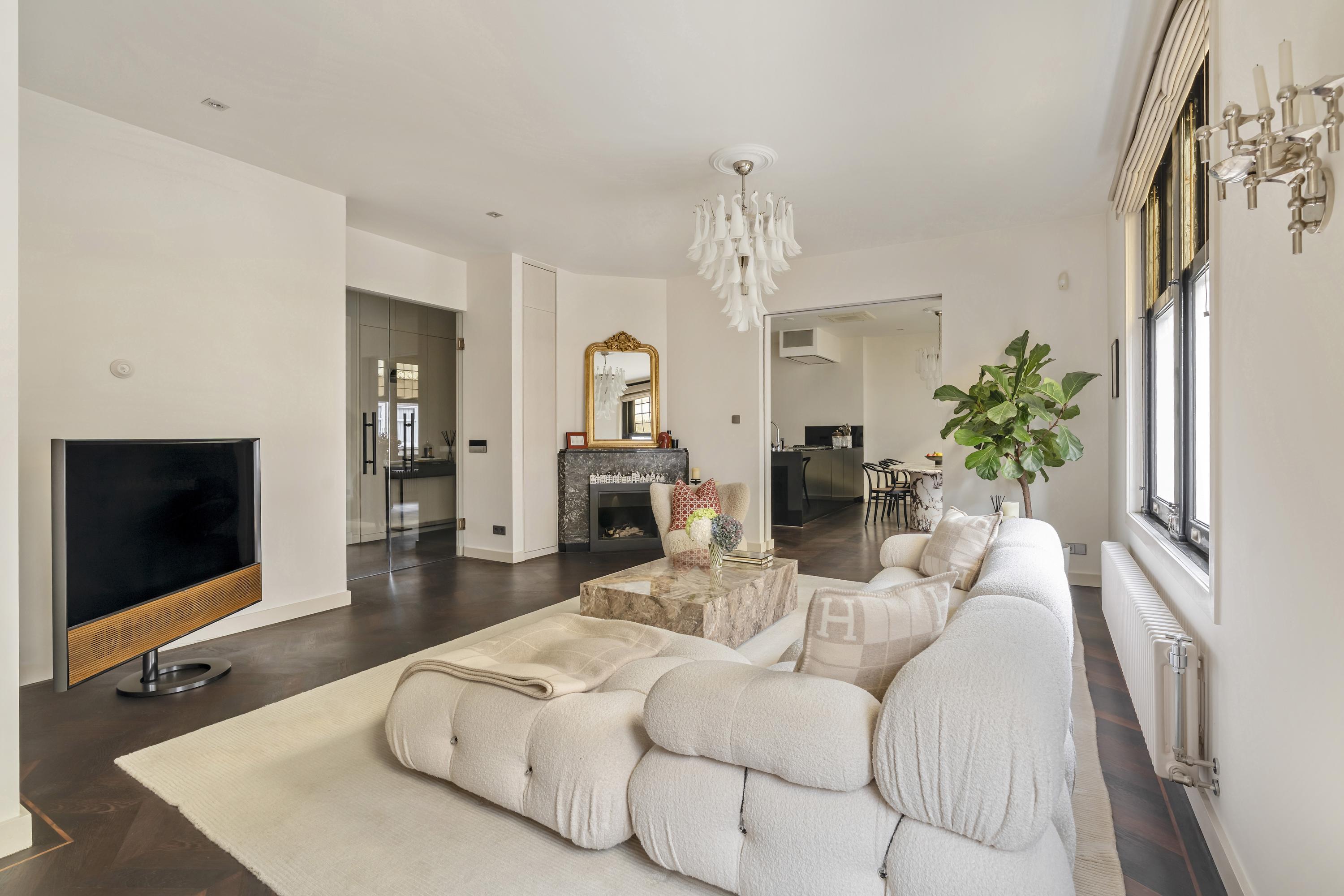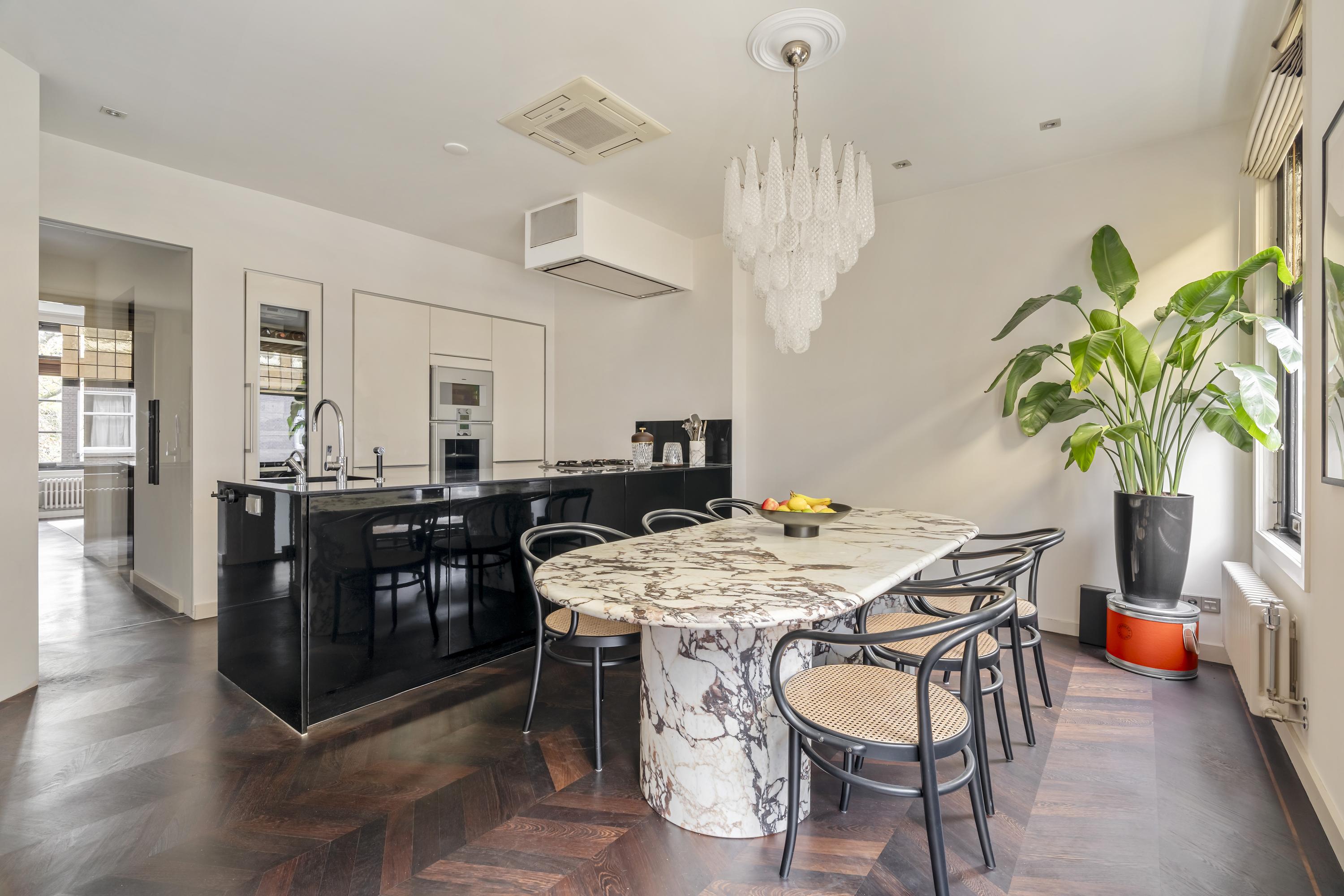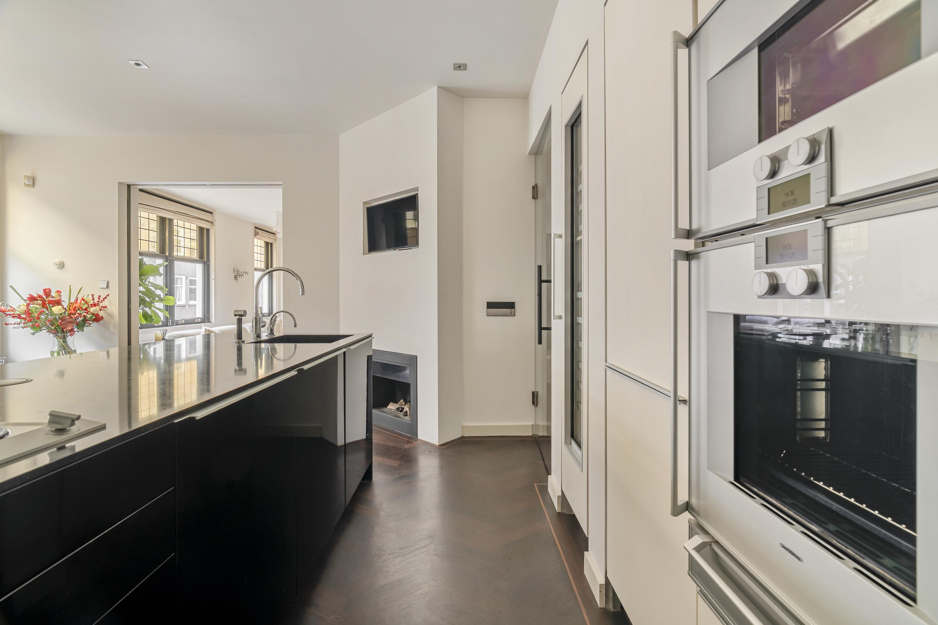 Het appartement wordt betreden via een open portaal dat direct toegang geeft tot de woning. In de hal vallen de hardhouten inbouwkasten direct op: praktisch én stijlvol, met ruimte voor onder andere de wasmachine en droger. Hier bevindt zich ook een separaat toilet met fonteintje. Aan de voorzijde ligt de royale living, een uitnodigende ruimte met een sfeervolle gashaard en karaktervolle glas-in-loodramen. De elektrische openslaande deuren en de schuifdeuren richting de keuken, beide voorzien van subtiele designverlichting, zorgen voor een vloeiende overgang tussen de woon- en kookruimte. De woonkeuken, ontworpen door Poggenpohl, vormt het hart van het huis. De keuken is uitgerust met topapparatuur van Gaggenau, waaronder een bordenverwarmer, stoomoven, oven, twee koelkasten, een wijnklimaatkast, een 3-pitsgasfornuis met Teppanyakiplaat, vaatwasser en tot slot een Quooker. Daarnaast is in de woonkeuken een airco-installatie aanwezig. Een tweede gashaard en een ingebouwde tv maken dit niet alleen een praktische, maar ook een bijzonder gezellige plek om te koken en samen te zijn.