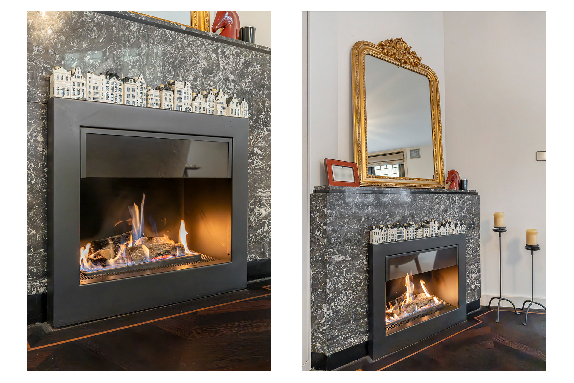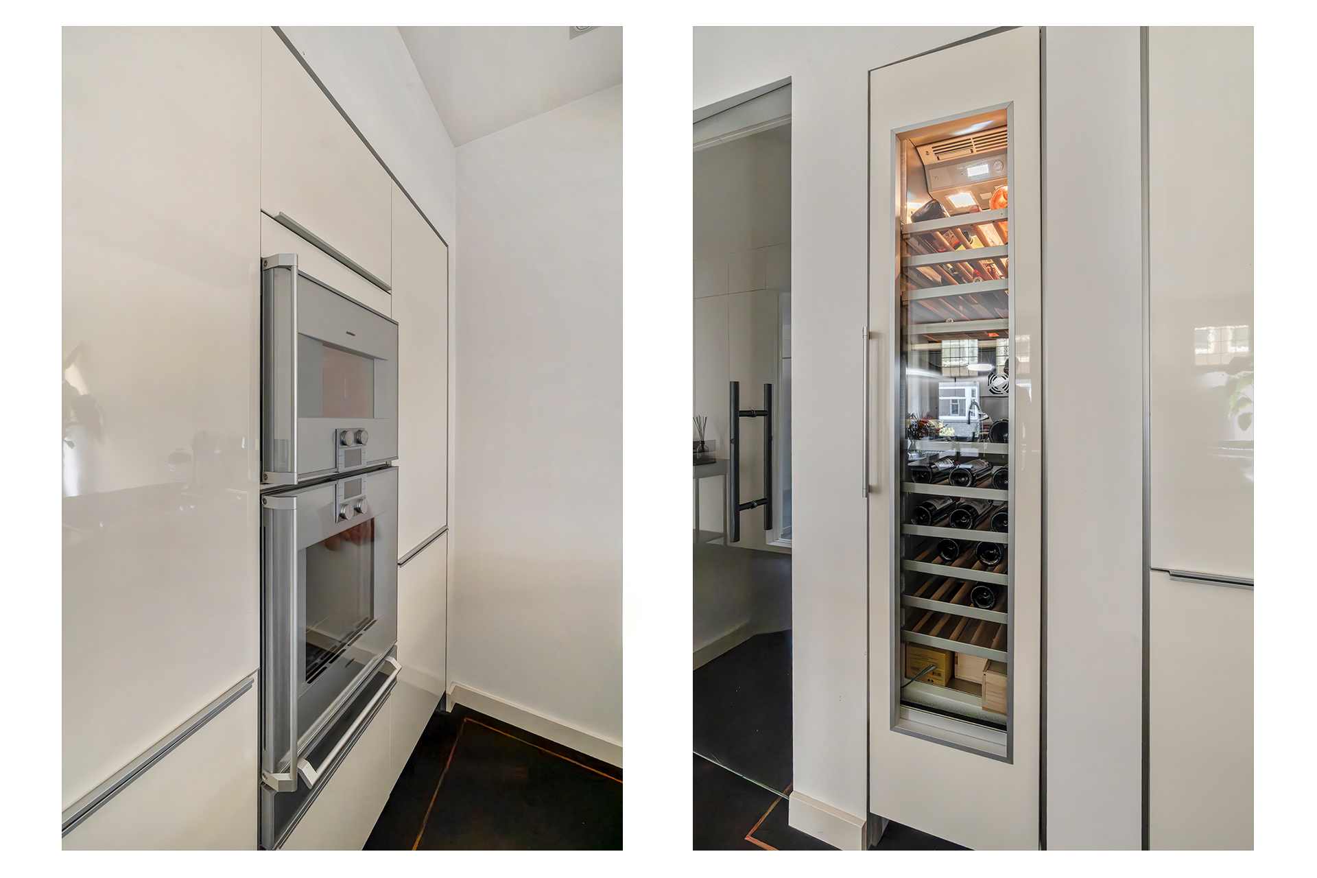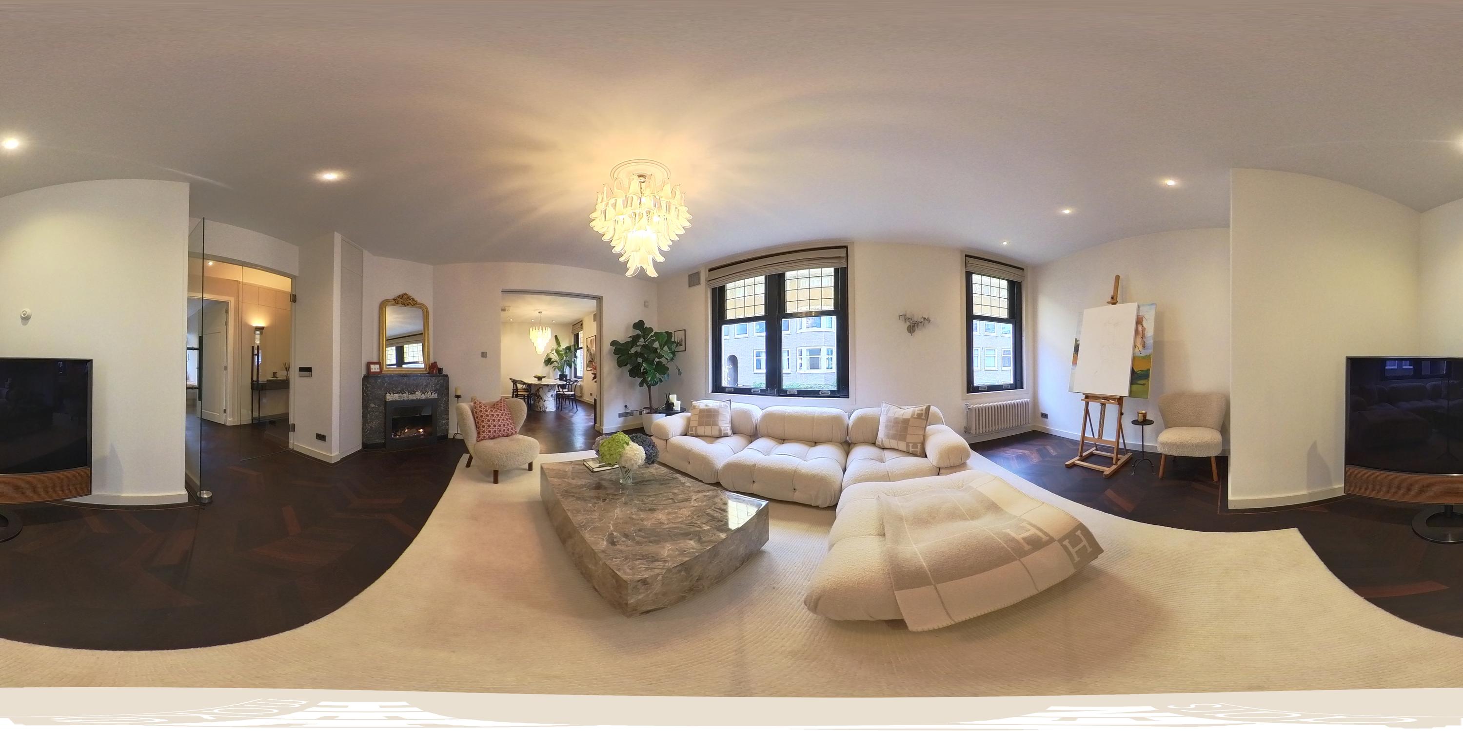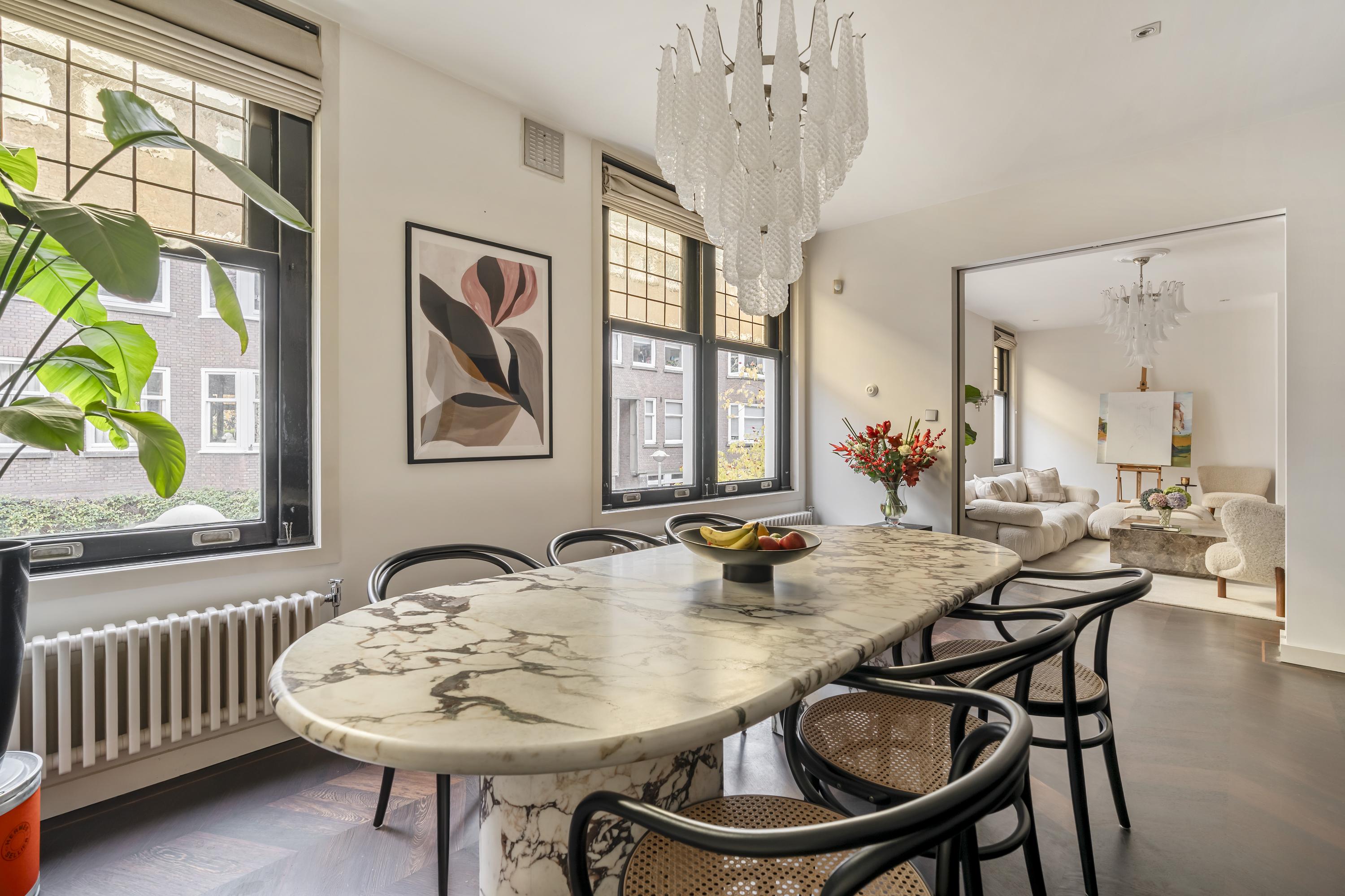 Het appartement wordt betreden via een open portaal dat direct toegang geeft tot de woning. In de hal vallen de hardhouten inbouwkasten direct op: praktisch én stijlvol, met ruimte voor onder andere de wasmachine en droger. Hier bevindt zich ook een separaat toilet met fonteintje. Aan de voorzijde ligt de royale living, een uitnodigende ruimte met een sfeervolle gashaard en karaktervolle glas-in-loodramen. De elektrische openslaande deuren en de schuifdeuren richting de keuken, beide voorzien van subtiele designverlichting, zorgen voor een vloeiende overgang tussen de woon- en kookruimte. De woonkeuken, ontworpen door Poggenpohl, vormt het hart van het huis. De keuken is uitgerust met topapparatuur van Gaggenau, waaronder een bordenverwarmer, stoomoven, oven, twee koelkasten, een wijnklimaatkast, een 3-pitsgasfornuis met Teppanyakiplaat, vaatwasser en tot slot een Quooker. Daarnaast is in de woonkeuken een airco-installatie aanwezig. Een tweede gashaard en een ingebouwde tv maken dit niet alleen een praktische, maar ook een bijzonder gezellige plek om te koken en samen te zijn.
