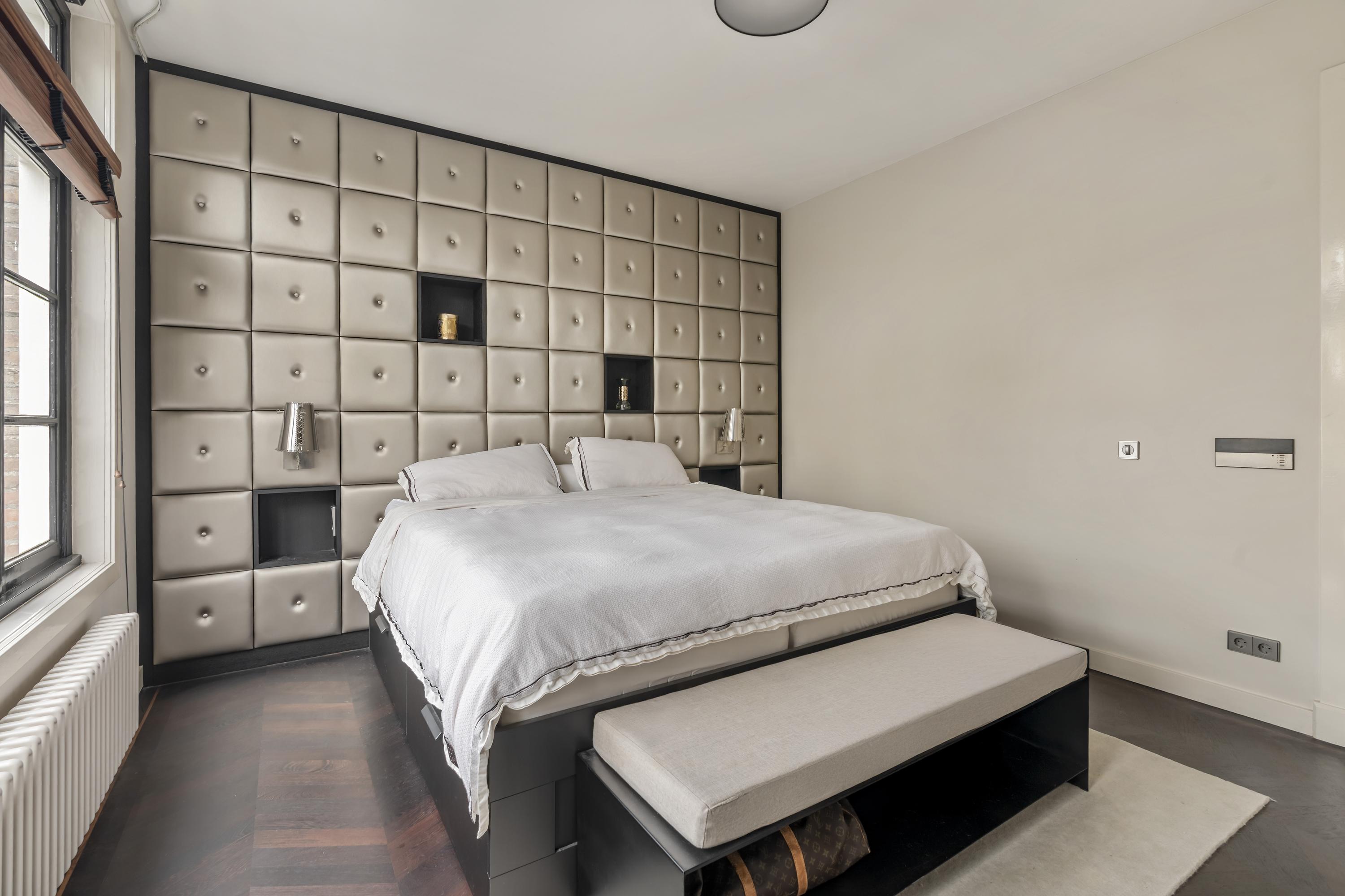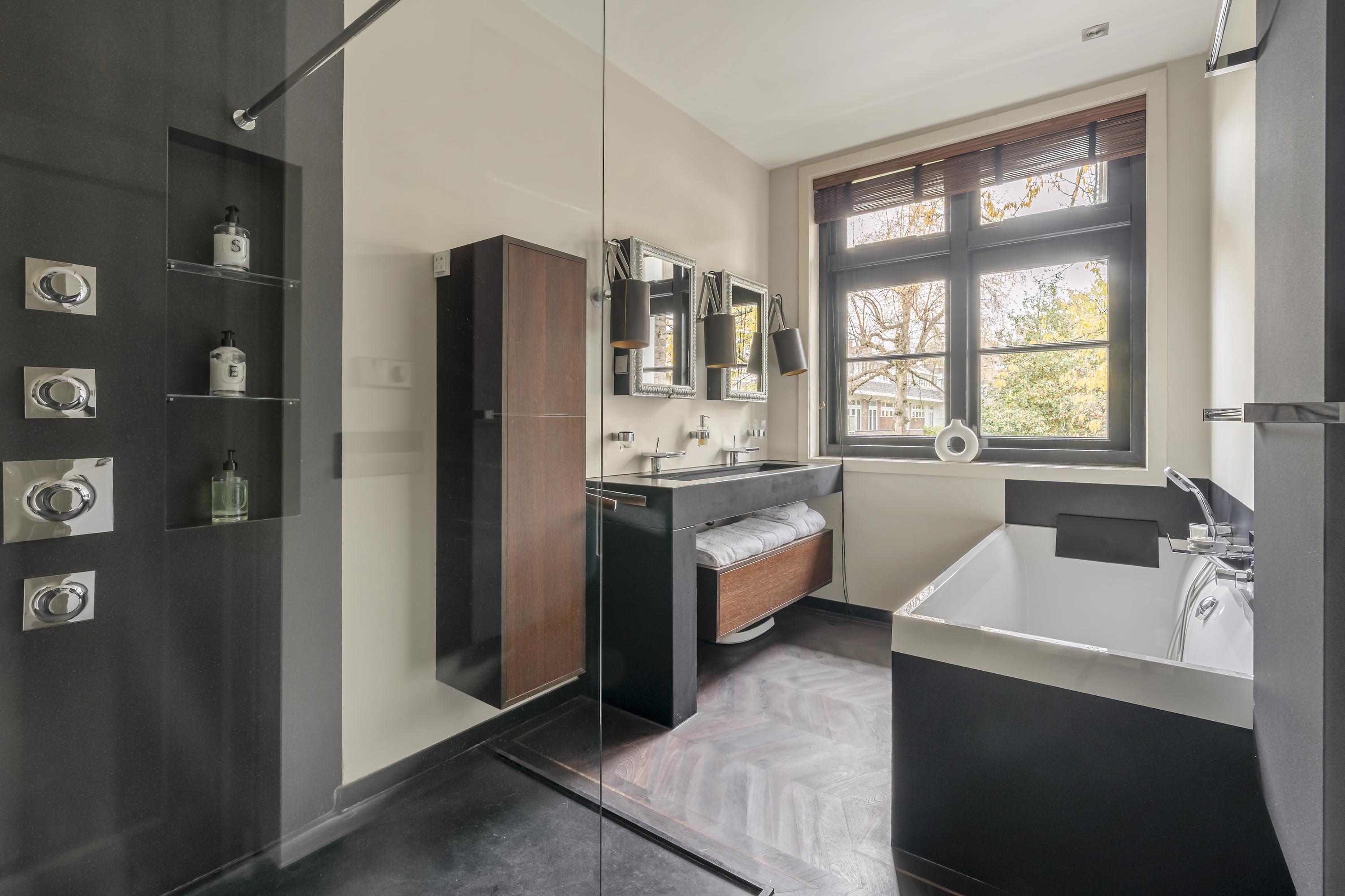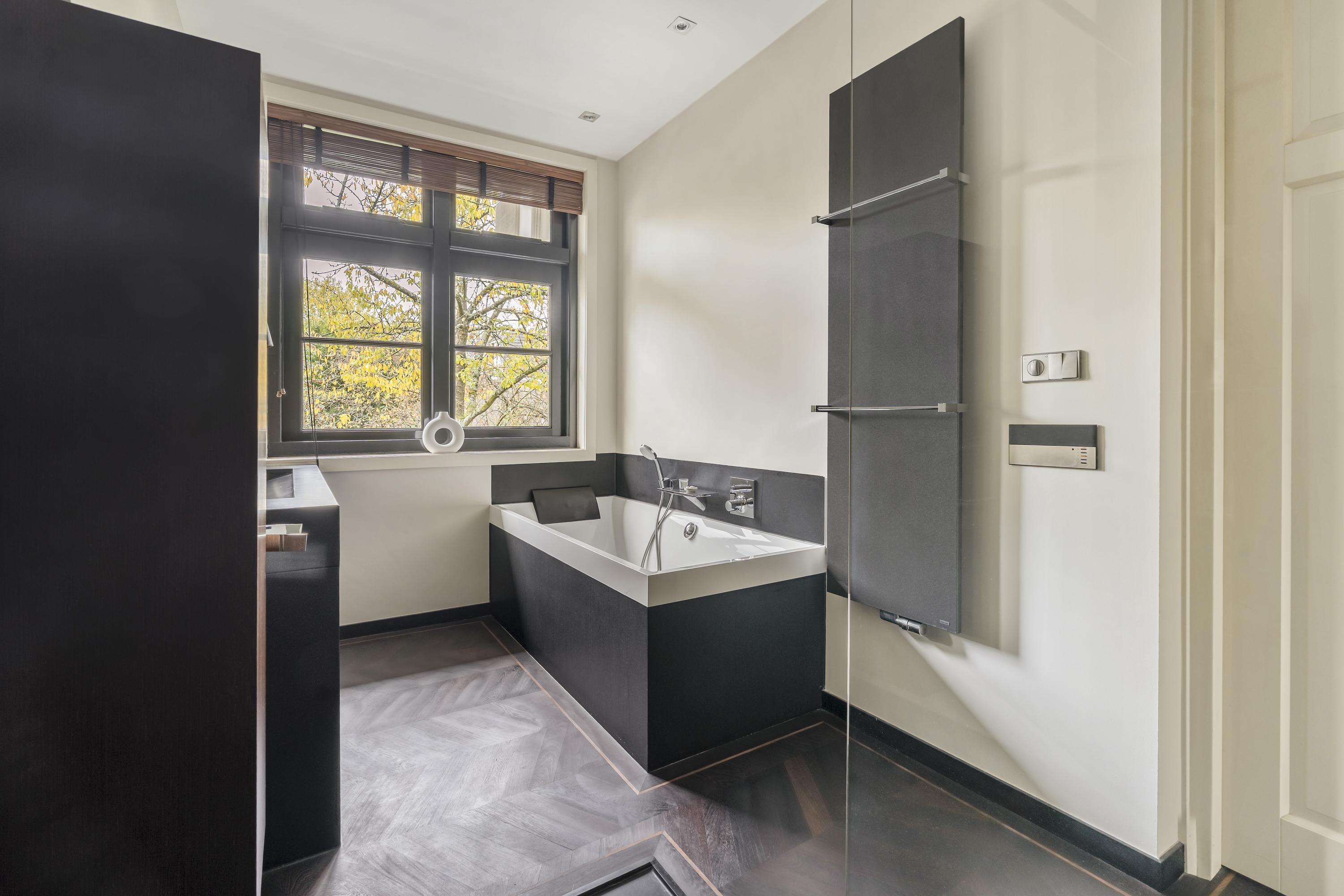 Aan de rustige achterzijde bevinden zich drie goed bemeten slaapkamers en de moderne badkamer. De hoofd slaapkamer beschikt over op maat gemaakte inbouwkasten, airco en elektrisch bedienbare ramen, die de kamer vullen met natuurlijk licht. De tweede slaapkamer, evenals voorzien van airco, is ideaal ingericht met een maatwerk hoogslaper met bergruimte en een passend bureau. De derde slaapkamer leent zich uitstekend als kinderkamer, gastenverblijf of werkruimte. Alle slaapkamers bieden toegang tot het zeer brede balkon. Een echte eye-catcher is de royale inloopkast, bereikbaar via automatisch gestuurde glazen deuren en uitgevoerd in een luxe stijl. Centraal in de woning ligt de moderne badkamer, voorzien van een ruim ligbad, een dubbele wastafel met meubel en een royale stortdouche, voorzien van kranen van Axor. De verlichting in huis wordt aangestuurd door Lutron. Het gehele appartement is voorzien van een prachtige hardhouten Wenge vloer.