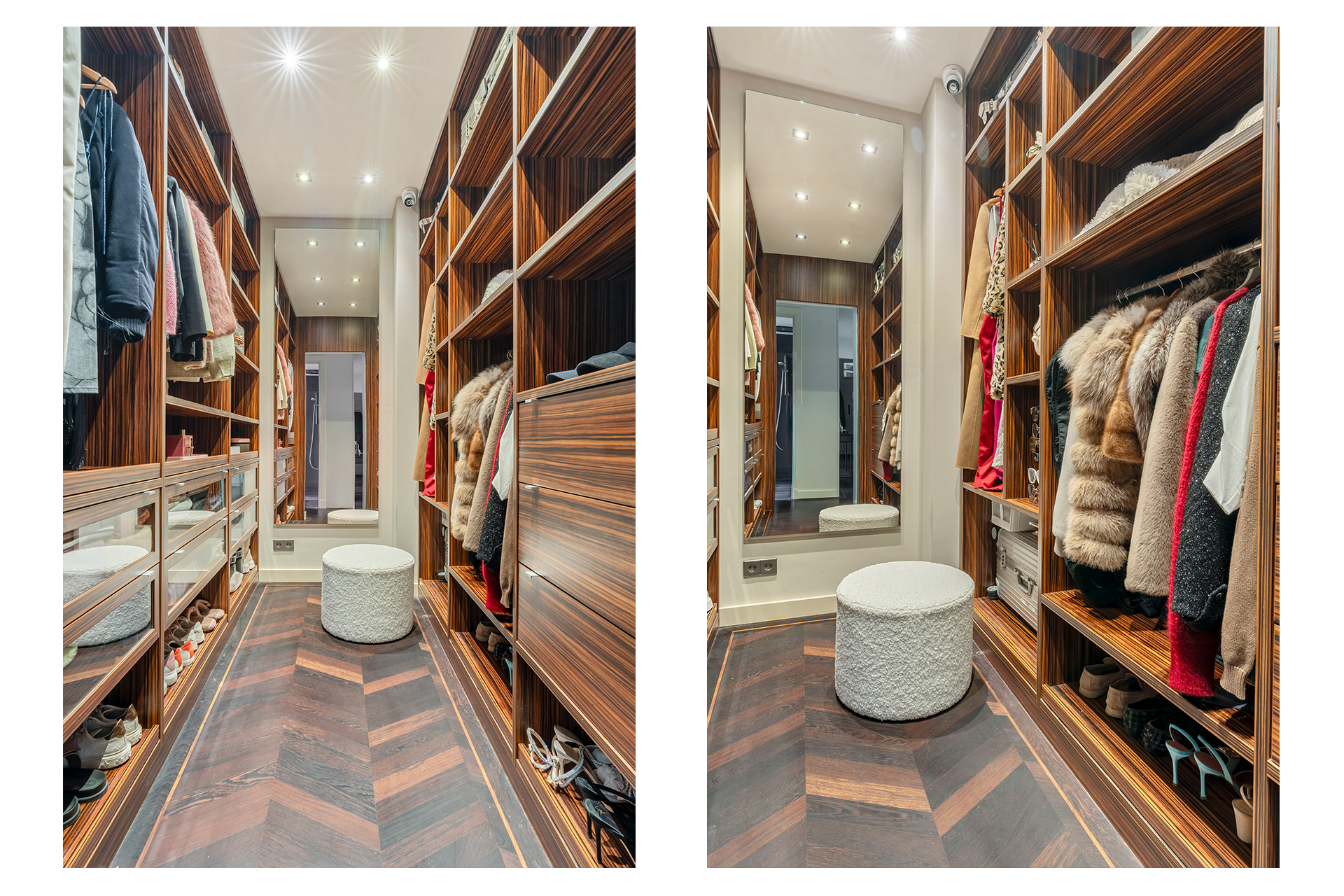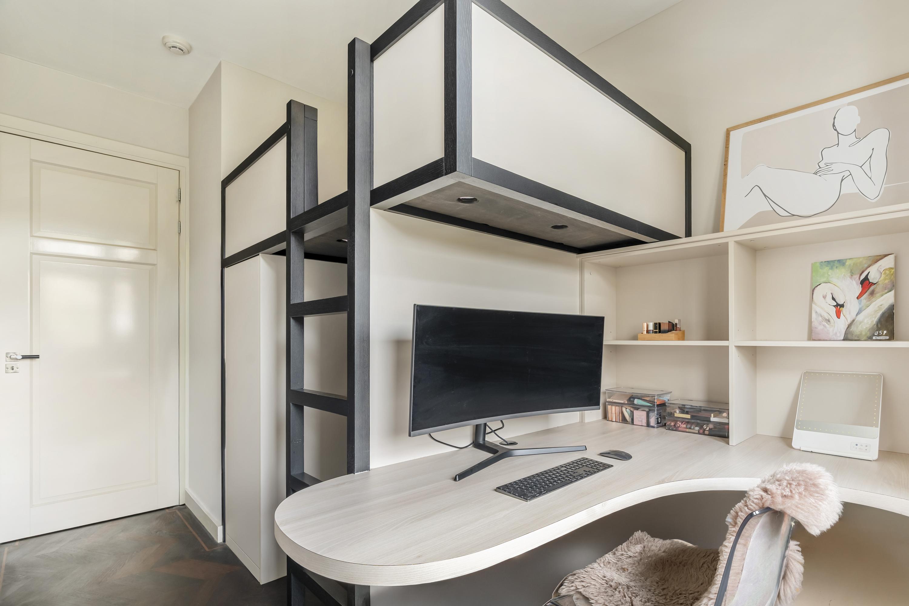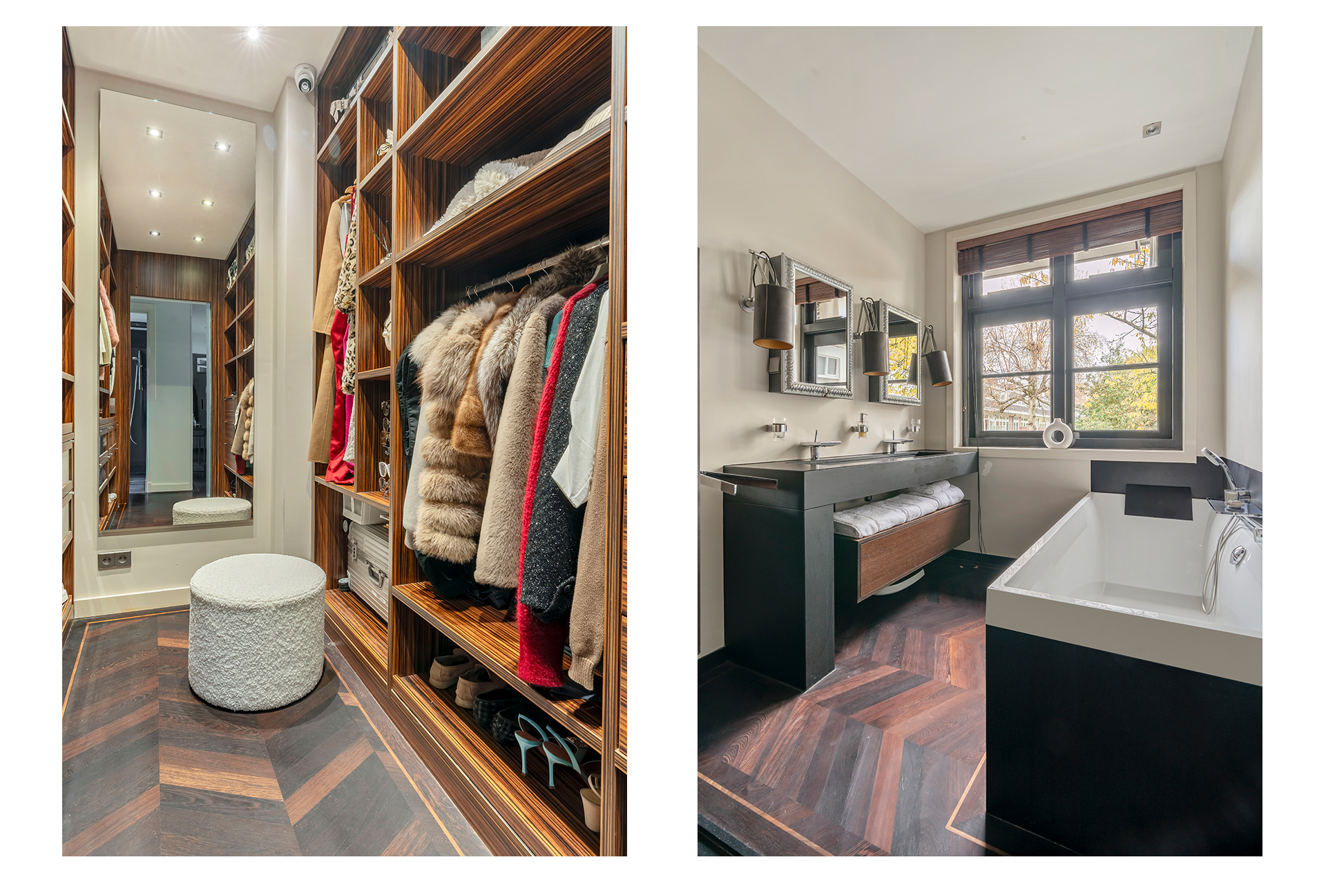Aan de rustige achterzijde bevinden zich drie goed bemeten slaapkamers en de moderne badkamer. De hoofd slaapkamer beschikt over op maat gemaakte inbouwkasten, airco en elektrisch bedienbare ramen, die de kamer vullen met natuurlijk licht. De tweede slaapkamer, evenals voorzien van airco, is ideaal ingericht met een maatwerk hoogslaper met bergruimte en een passend bureau. De derde slaapkamer leent zich uitstekend als kinderkamer, gastenverblijf of werkruimte. Alle slaapkamers bieden toegang tot het zeer brede balkon. Een echte eye-catcher is de royale inloopkast, bereikbaar via automatisch gestuurde glazen deuren en uitgevoerd in een luxe stijl. Centraal in de woning ligt de moderne badkamer, voorzien van een ruim ligbad, een dubbele wastafel met meubel en een royale stortdouche, voorzien van kranen van Axor. De verlichting in huis wordt aangestuurd door Lutron. Het gehele appartement is voorzien van een prachtige hardhouten Wenge vloer.