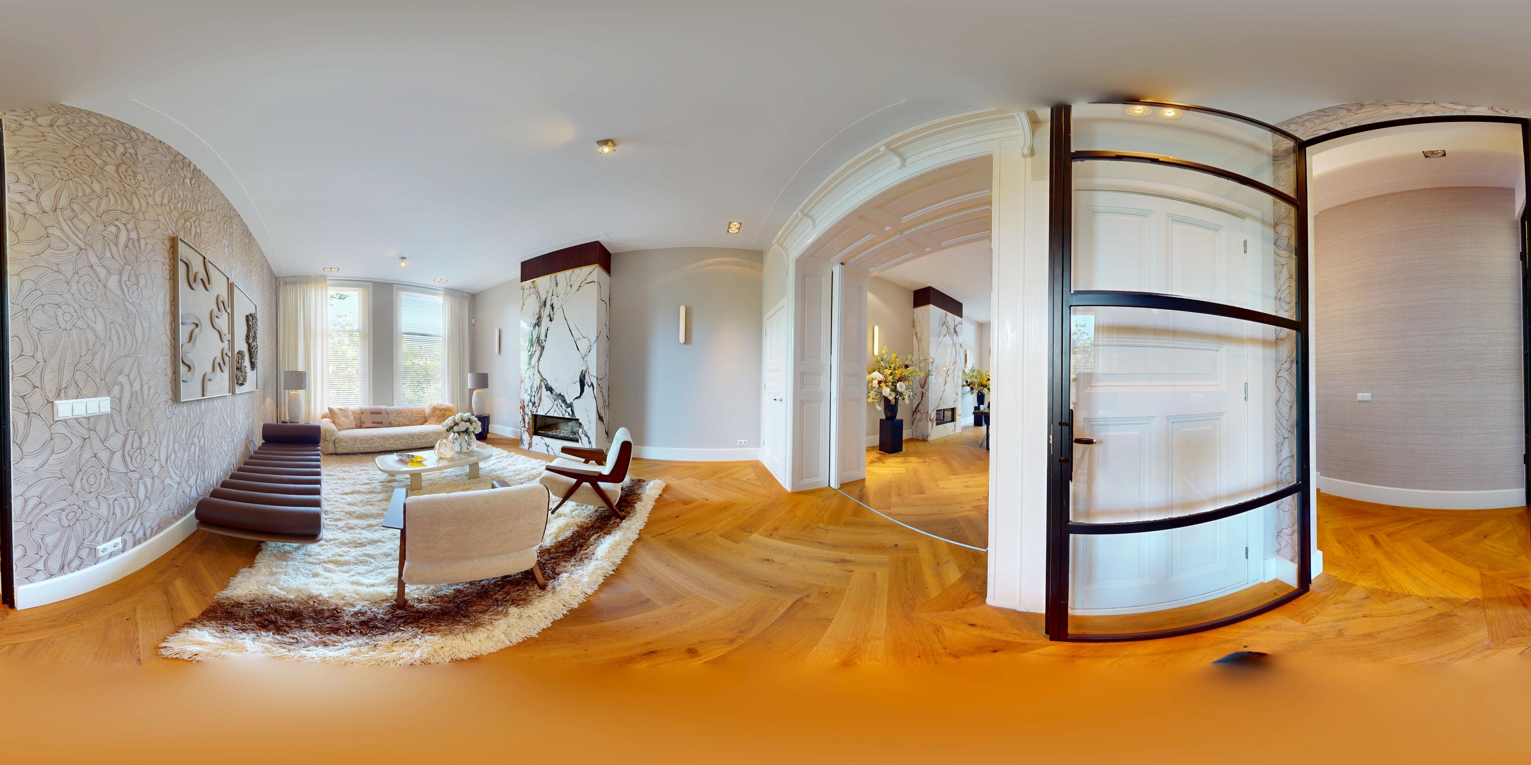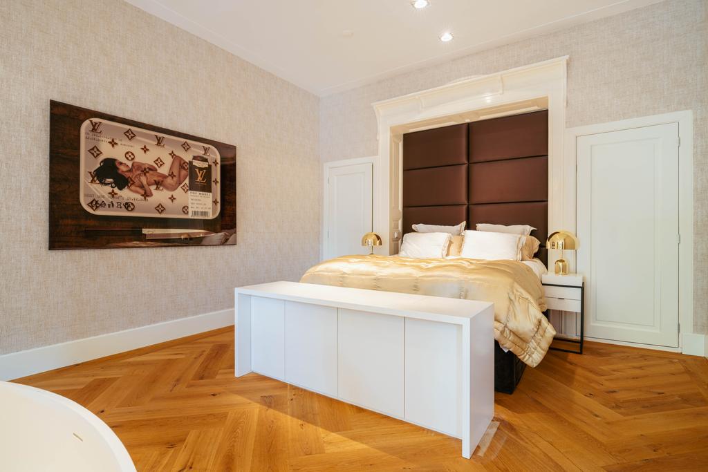 De gehele verdieping is hoogwaardig afgewerkt met stijlvol en sfeervol behang, wat de ruimte warmte en karakter geeft. Grote raampartijen aan beide zijden van de verdieping zorgen voor een uitzonderlijke hoeveelheid daglicht en benadrukken de ruimtelijkheid en luxe van het geheel.