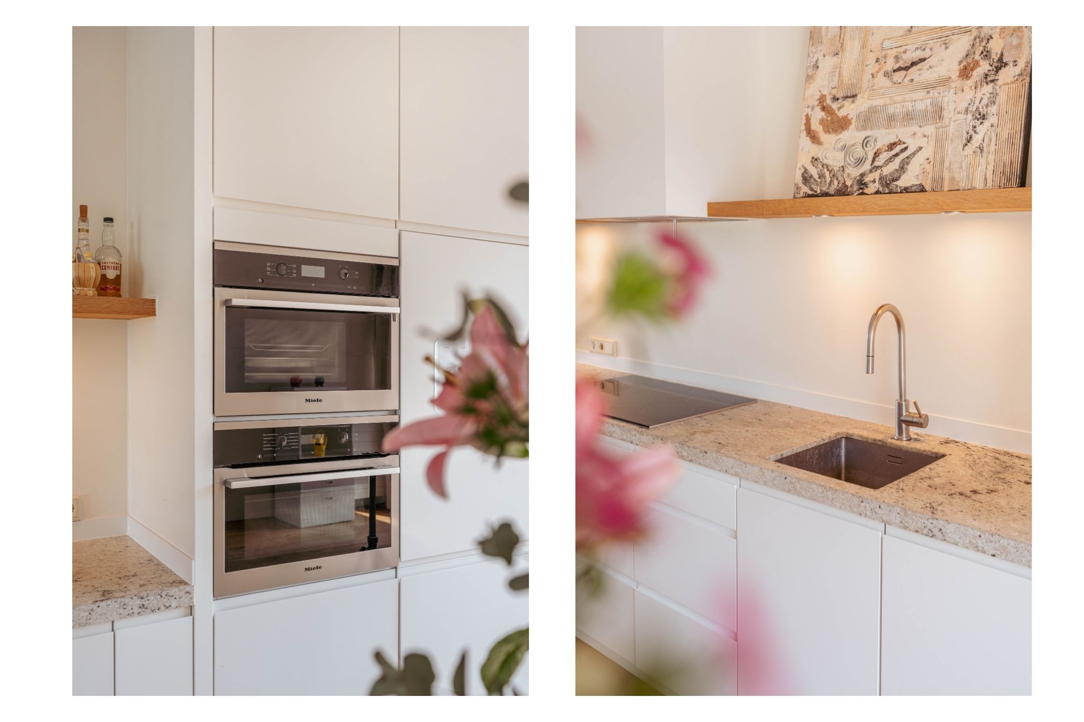 De ruime ontvangsthal leidt naar een tweede hal, die toegang biedt tot de royale living met open keuken. Dankzij de kamerbreedte en plafondhoge raampartijen aan de voorzijde geniet u hier van een fenomenaal uitzicht over het IJ. Dubbele deuren aan de achterzijde bieden toegang tot het zonnige terras van ca. 14m² gelegen op het westen - een heerlijke plek om buiten te zitten. De luxe open keuken is uitgevoerd met een stijlvol kookeiland, wijnklimaatkast en hoogwaardige inbouwapparatuur zoals een koelkast, vriezer, inductiekookplaat, vaatwasser en twee ovens. Het appartement beschikt over drie slaapkamers: twee aan de voorzijde en één aan de rustige achterzijde bij het terras. De moderne badkamer is voorzien van een ligbad, inloopdouche, dubbele wastafel en toilet. Daarnaast is er een separaat toilet met fonteintje en een ruime inpandige berging met wasmachineaansluiting, plus een tweede berging.