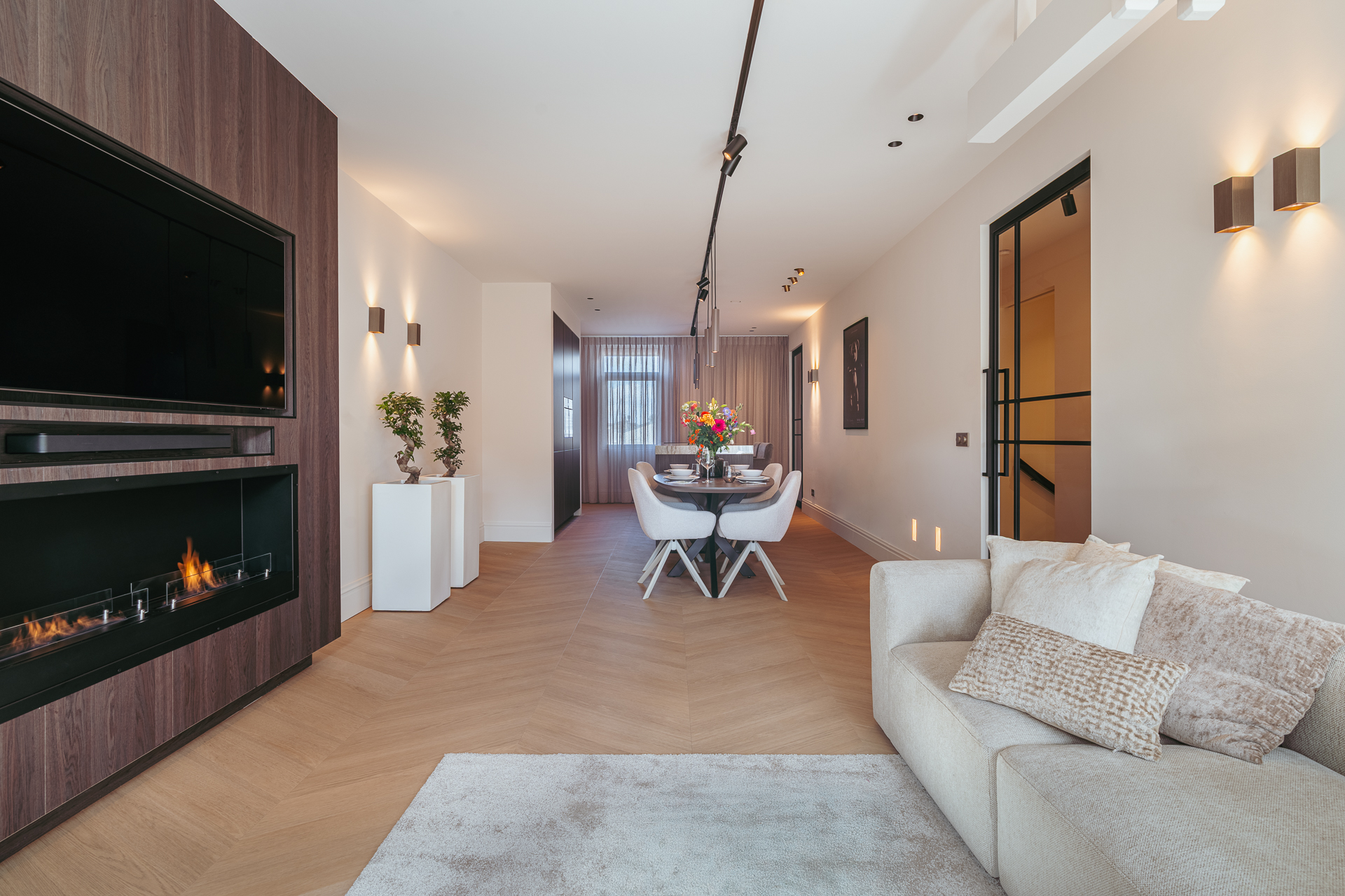 Via het gemeenschappelijke trappenhuis bereikt u de entree van de woning op de derde verdieping. Vanuit uw eigen entree leidt een nette, gerenoveerde trapopgang naar het appartement op de vierde verdieping. Bij binnenkomst valt direct de warme en stijlvolle sfeer op, mede dankzij de zorgvuldig gekozen materialen, sfeervolle verlichting en de prachtige afwerking. Het appartement is hoogwaardig en luxe gerenoveerd, waarbij veel aandacht is besteed aan details. De moderne zwarte stalen deuren in combinatie met klassieke details geven het geheel een eigentijdse uitstraling, iets wat u door het hele appartement terugziet.
