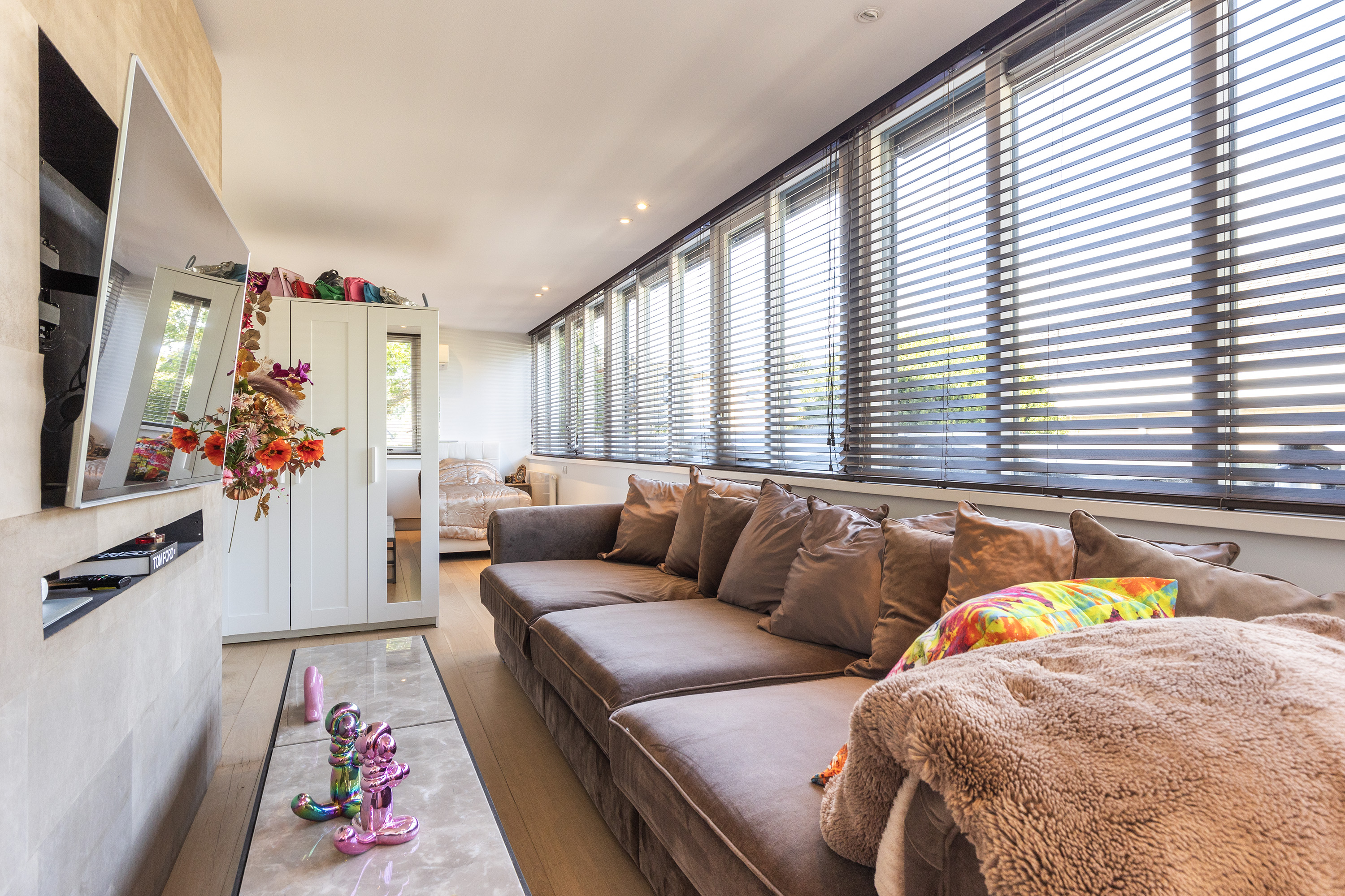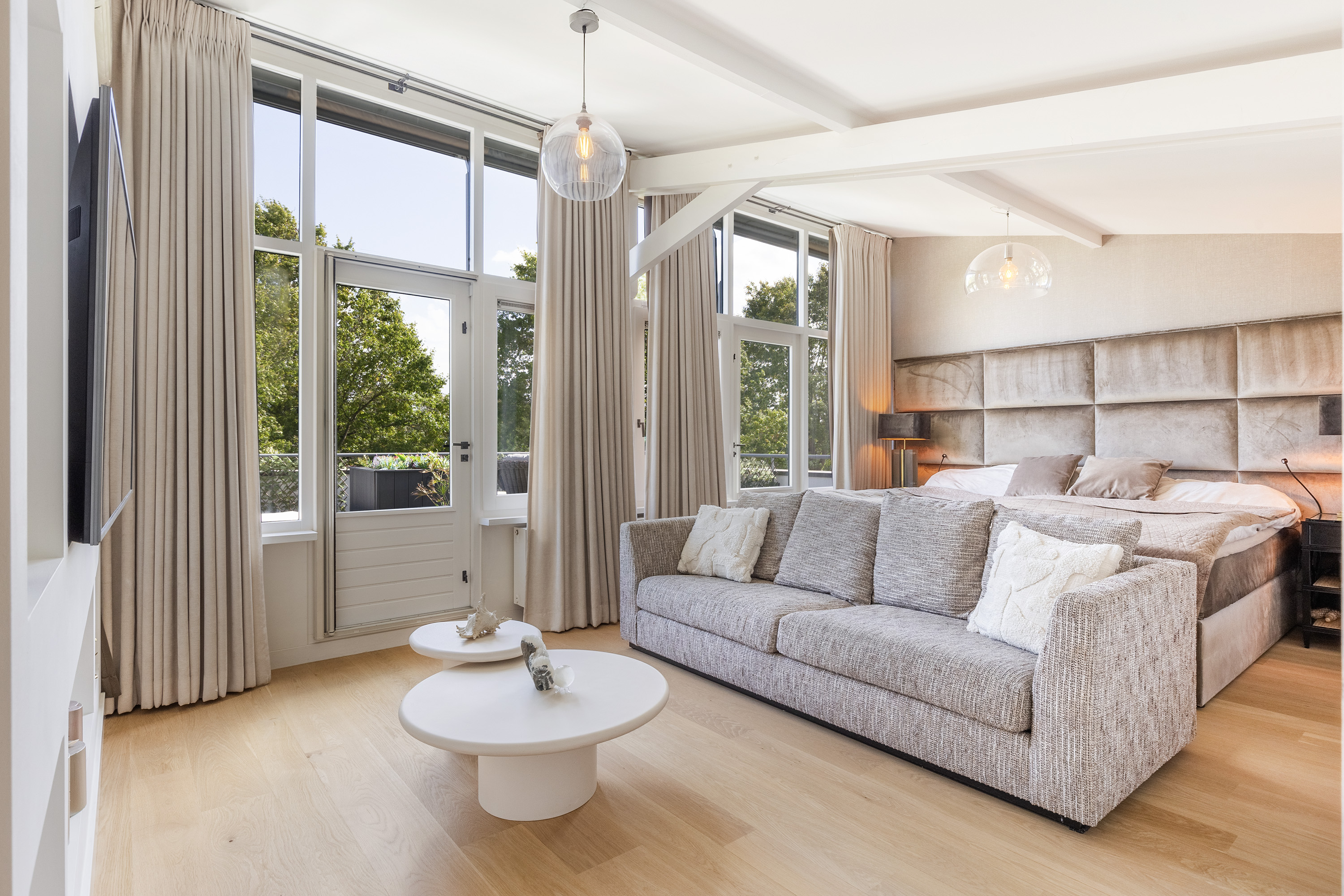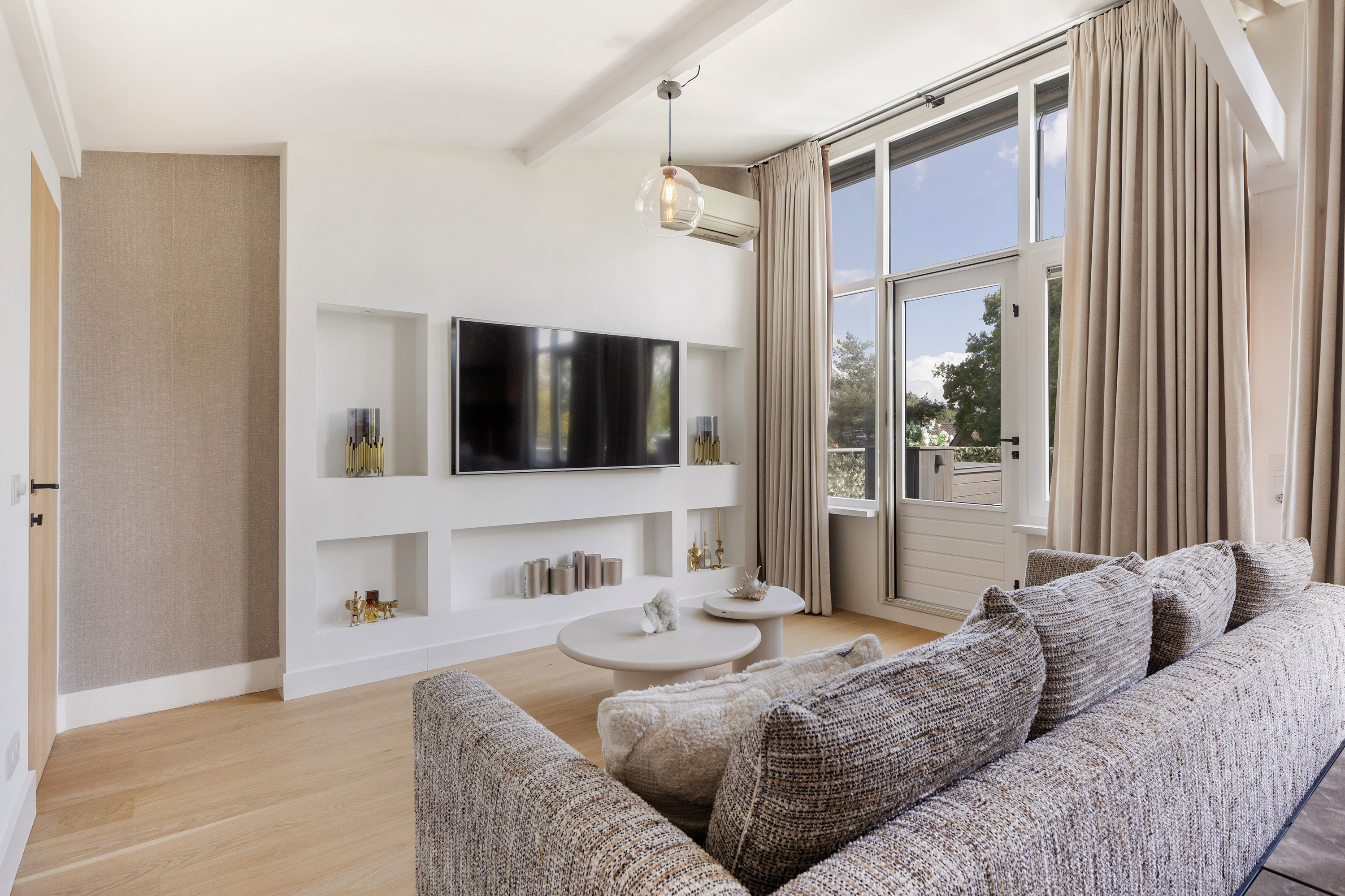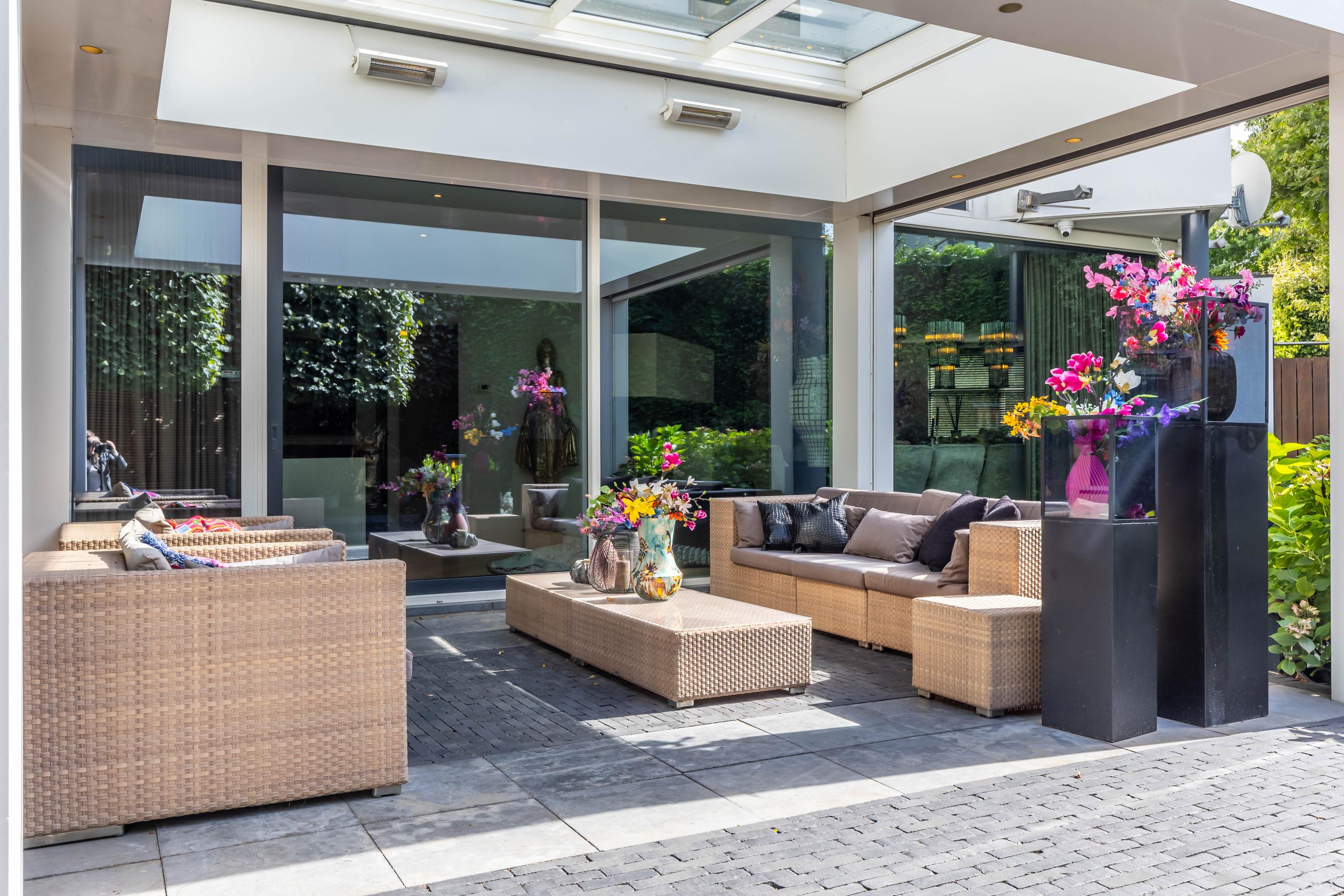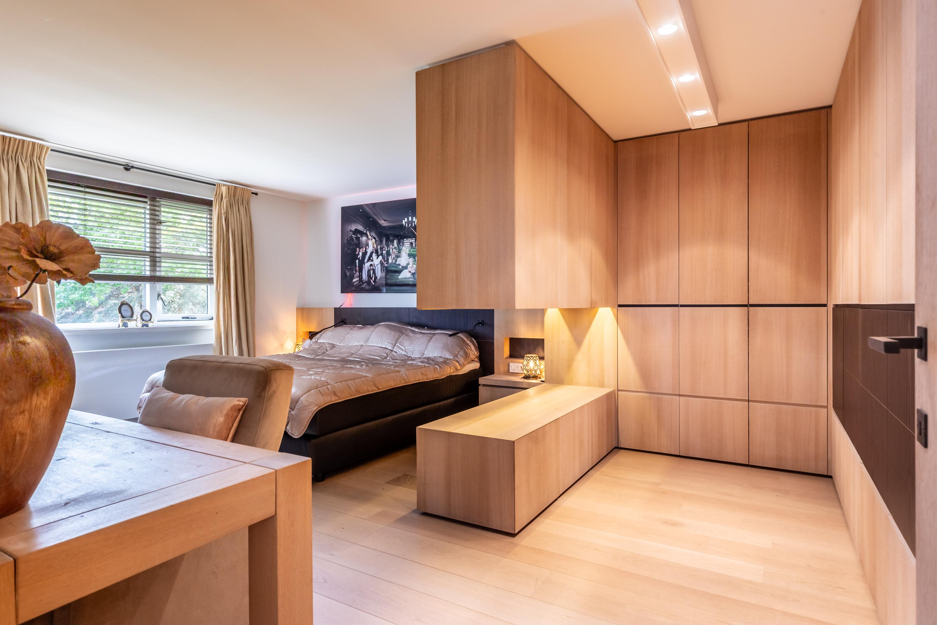 De living ademt rustige luxe, met een sfeervolle gashaard, maatwerkkasten en een geïntegreerde televisieopstelling. Grote raampartijen verbinden het interieur naadloos met de tuin; het lichtspel in huis is spectaculair.