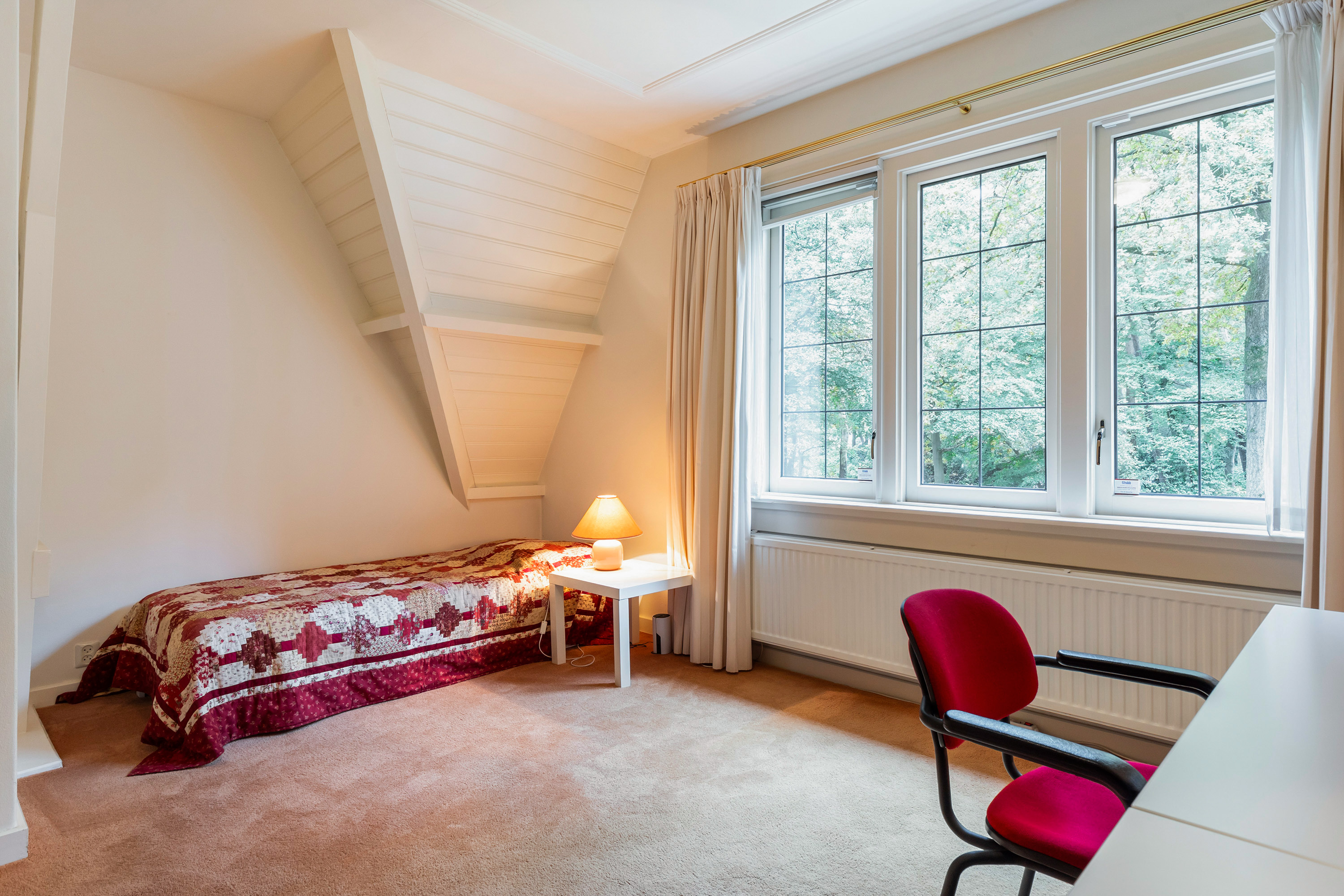 De werkkamer aan de voorzijde van de woning heeft een visgraatparketvloer met dubbele rand en bies, en biedt uitzicht op de voortuin en royale oprit. In de erker is een stijlvol maatwerkbank geïntegreerd met convectorverwarming, terwijl de zonwering aan de voorzijde het comfort vergroot. De ramen geven deze kamer een warme, klassieke uitstraling.