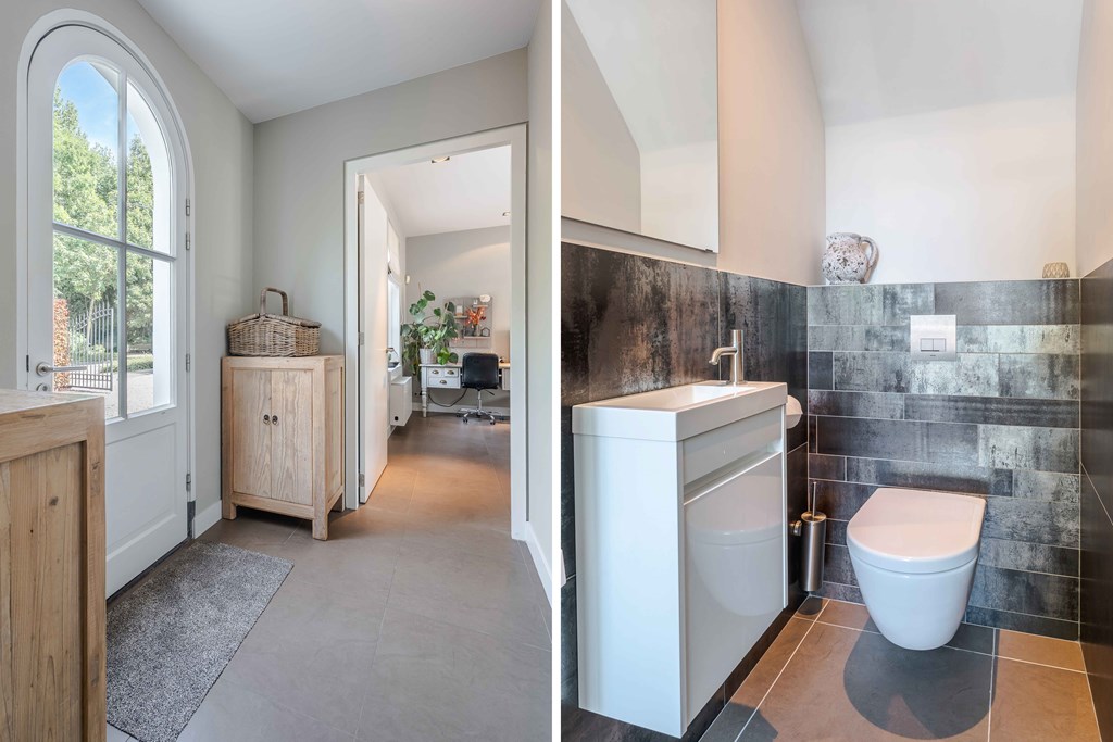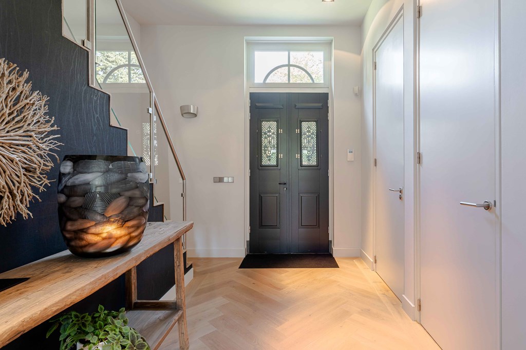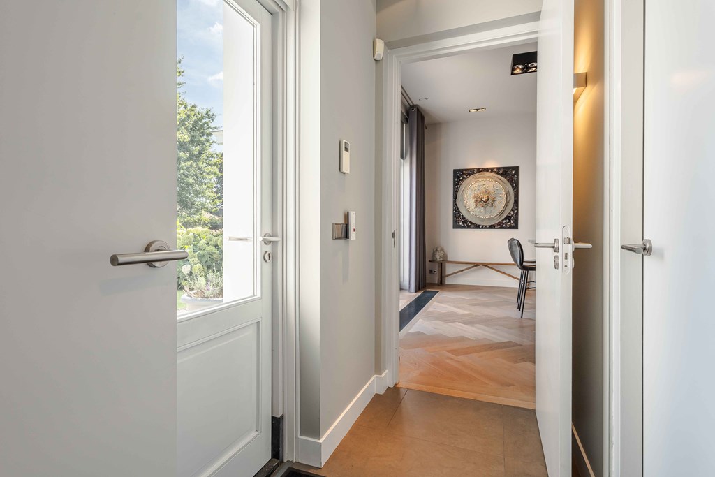 Middels de keurig aangelegde voortuin bereikt u de statige entree van de woning. Bij binnenkomst is direct duidelijk dat er goed is nagedacht over de zichtlijnen in en rond de woning. De hal is voorzien van een meterkast, een toiletruimte, een vestiaire, een trapopgang voor toegang tot de verdieping en biedt toegang tot de woonvertrekken.