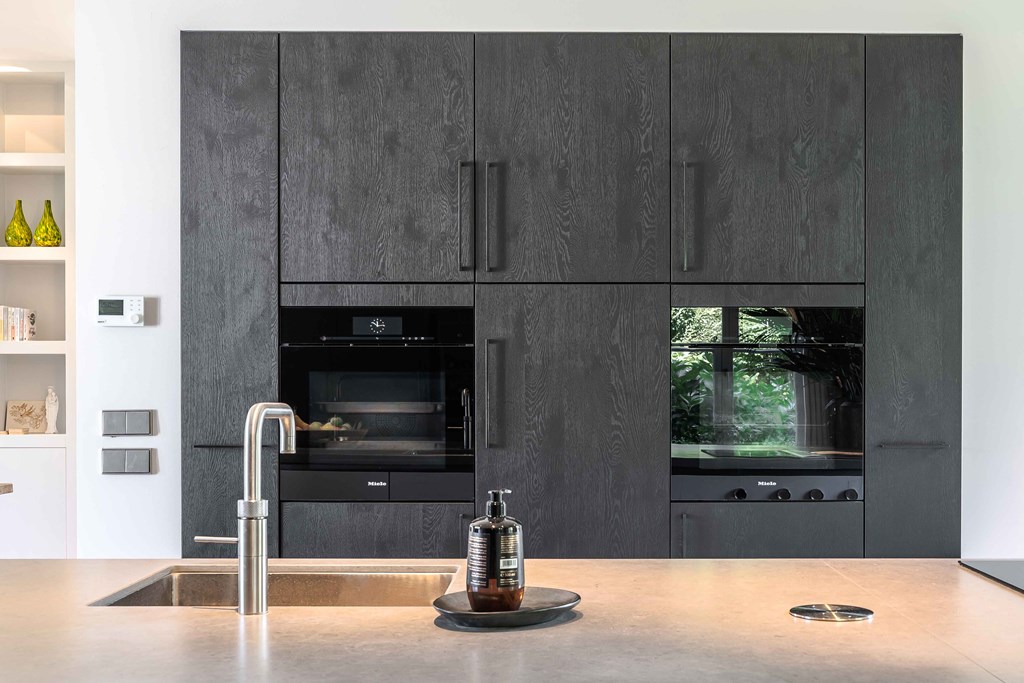De keuken is voorzien van een modulair BORA systeem met 2 inductie kookplaten, 2 interne afzuigingen en een teppanyaki plaat, een Quooker kraan, 2 koelkasten, een vriezer, een stoomoven, een bakoven, een vaatwasser en een wijnklimaatkast.