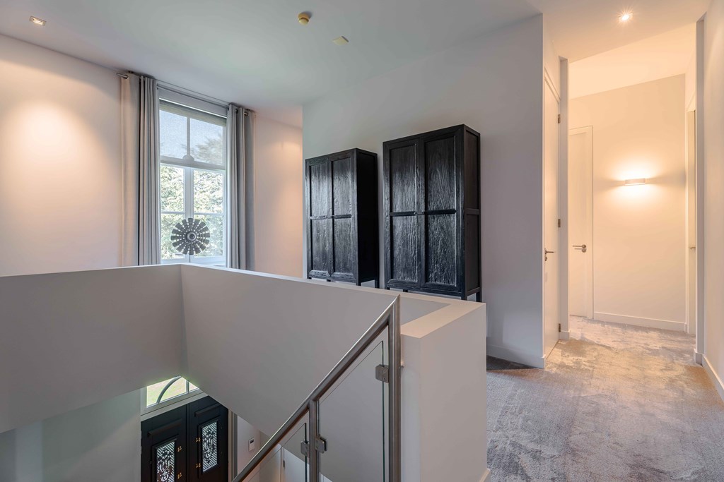 Evenals de leefruimtes beneden is de verdieping voorzien van hoge plafonds. Dit zorgt samen met de hoeveelheid daglichttoetreding voor een aangename woonbeleving op de verdieping.