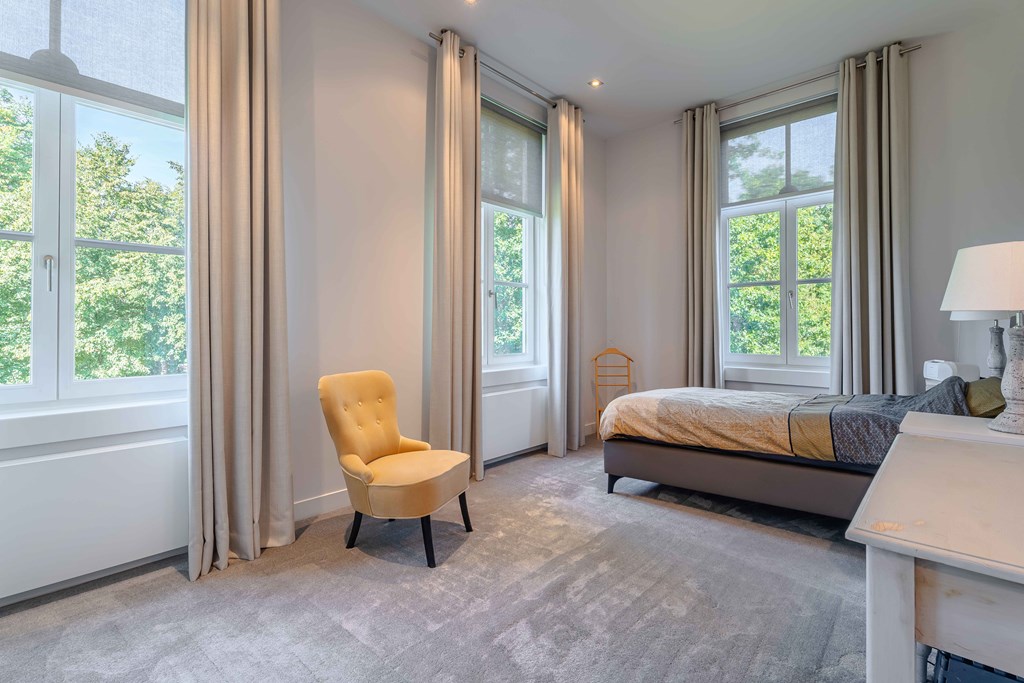 Slaapkamer 1 gelegen aan de voorzijde van de woning. Deze master suite, met doorkijkjes naar de tuin, is een oase van rust. Aansluitend heeft u toegang tot een kleedkamer en een complete badkamer met inloopdouche, een vrijstaand ligbad en 2 waskommen met meubel.