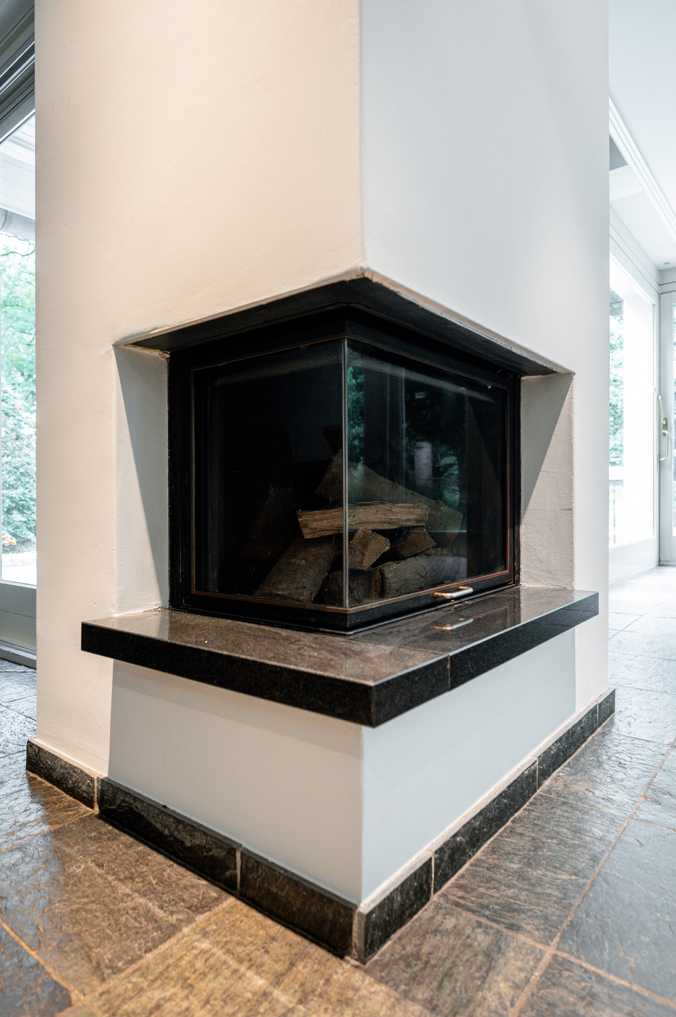Tussen de zit- en eetkamer is een sfeervolle open haard gesitueerd, welke beide vertrekken op harmonieuze wijze met elkaar verbindt.