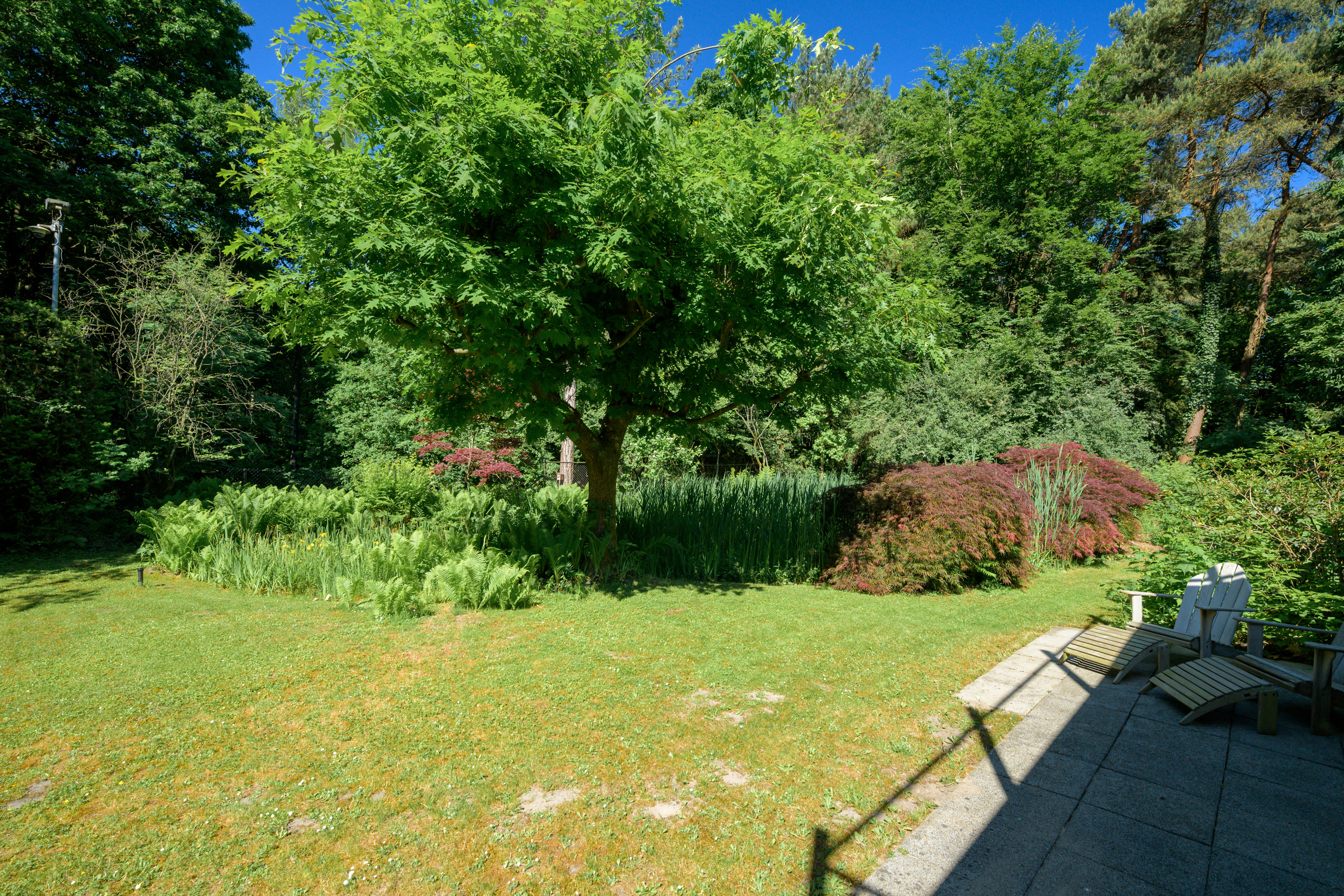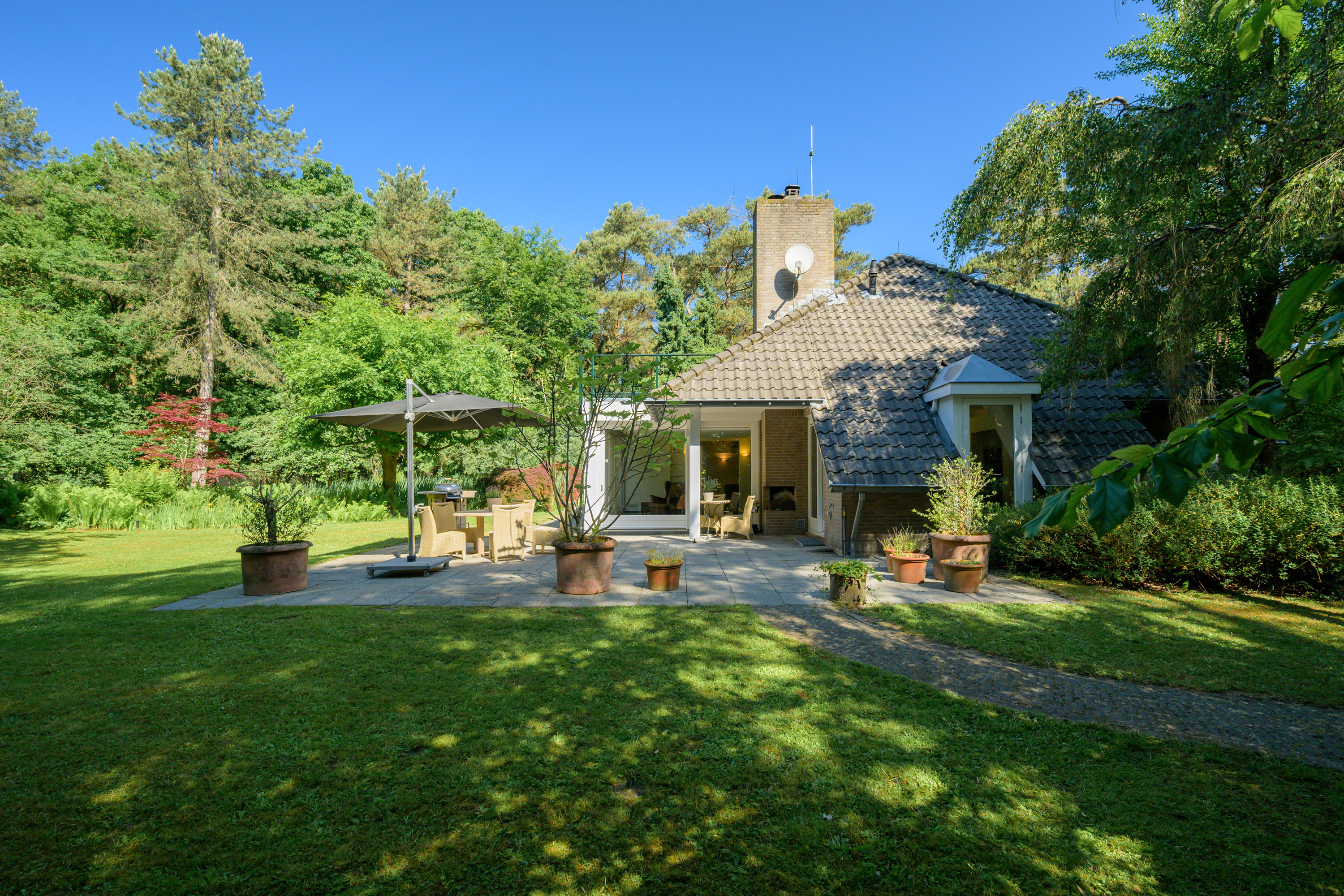 De prachtige, parkachtige (bos)tuin is rondom de woning gesitueerd en biedt ultieme privacy en het genot van het buitenleven. De ligging is uniek, een rustige, groene omgeving maar tevens nabij alle voorzieningen.