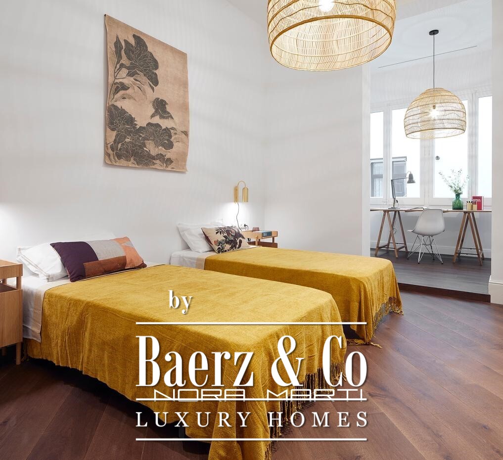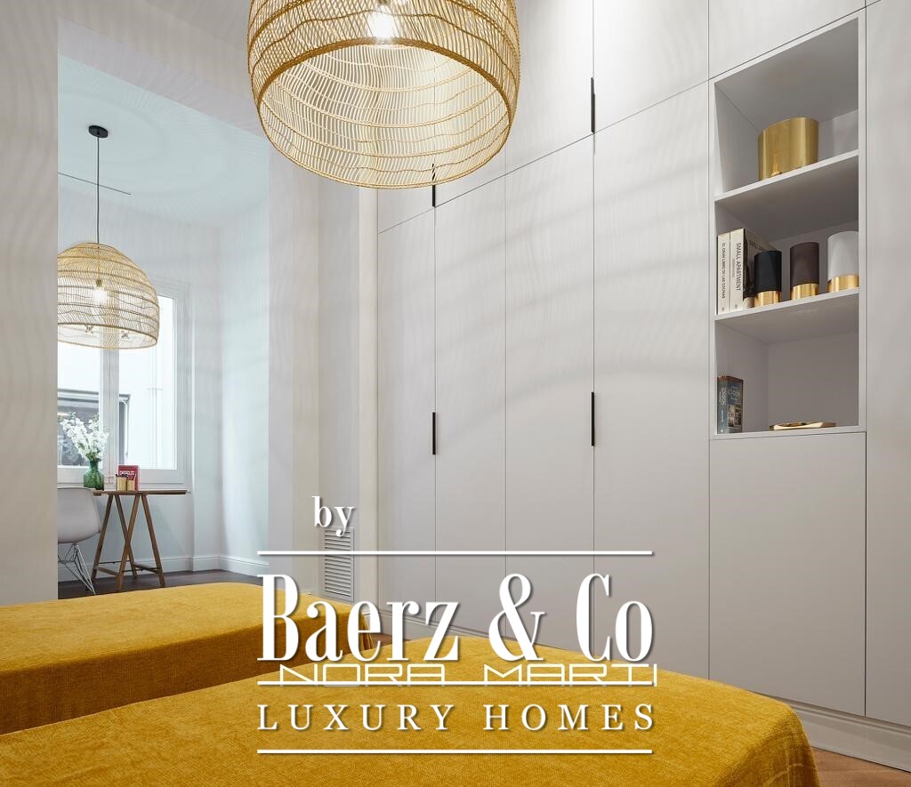 The spacious living-dining room stands out for its high ceilings, original moldings, and a carefully selected selection of furniture that combines vibrant tones with fine materials. The fully equipped kitchen and bathrooms offer top-quality finishes and a layout designed for everyday comfort.