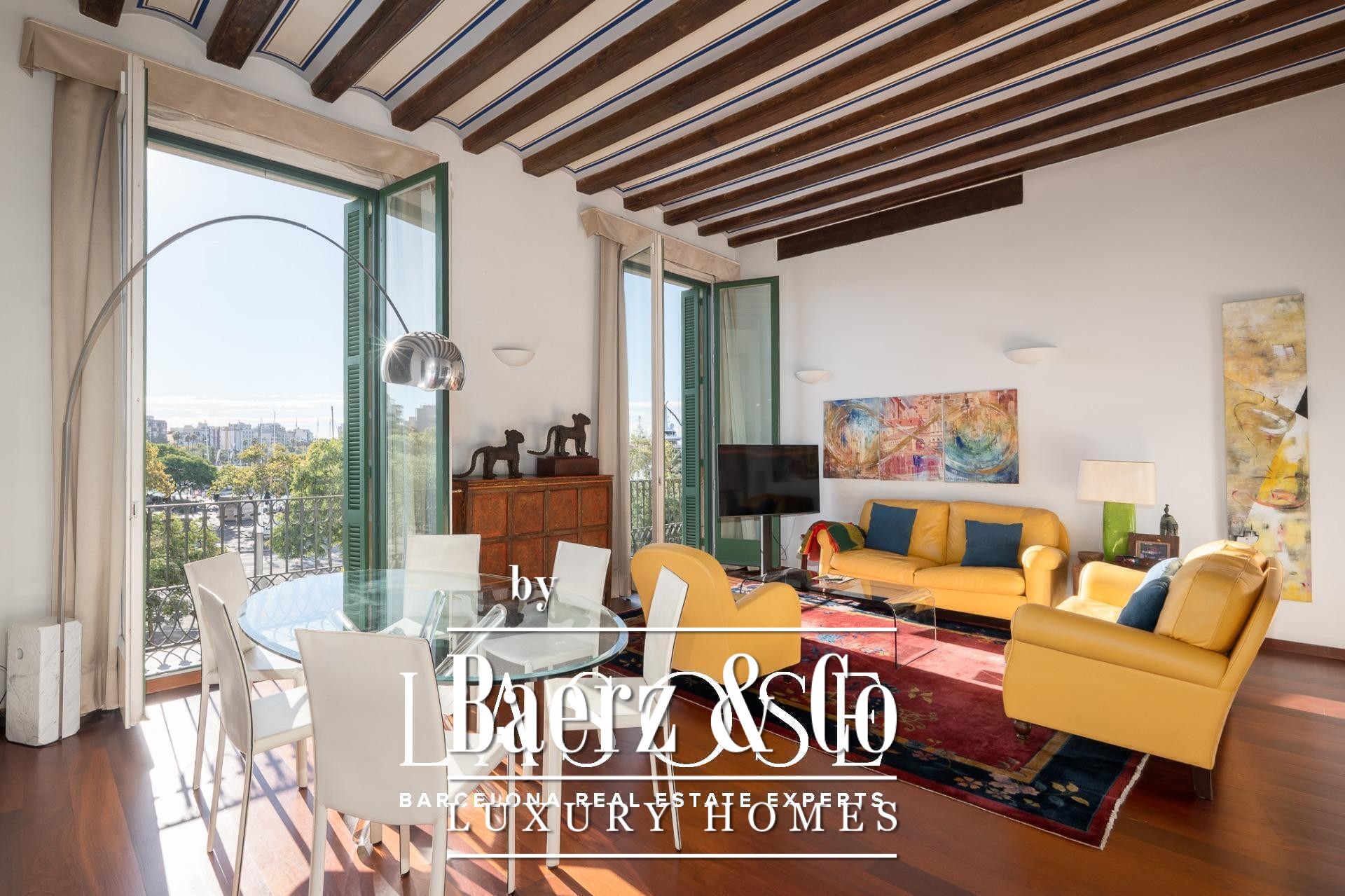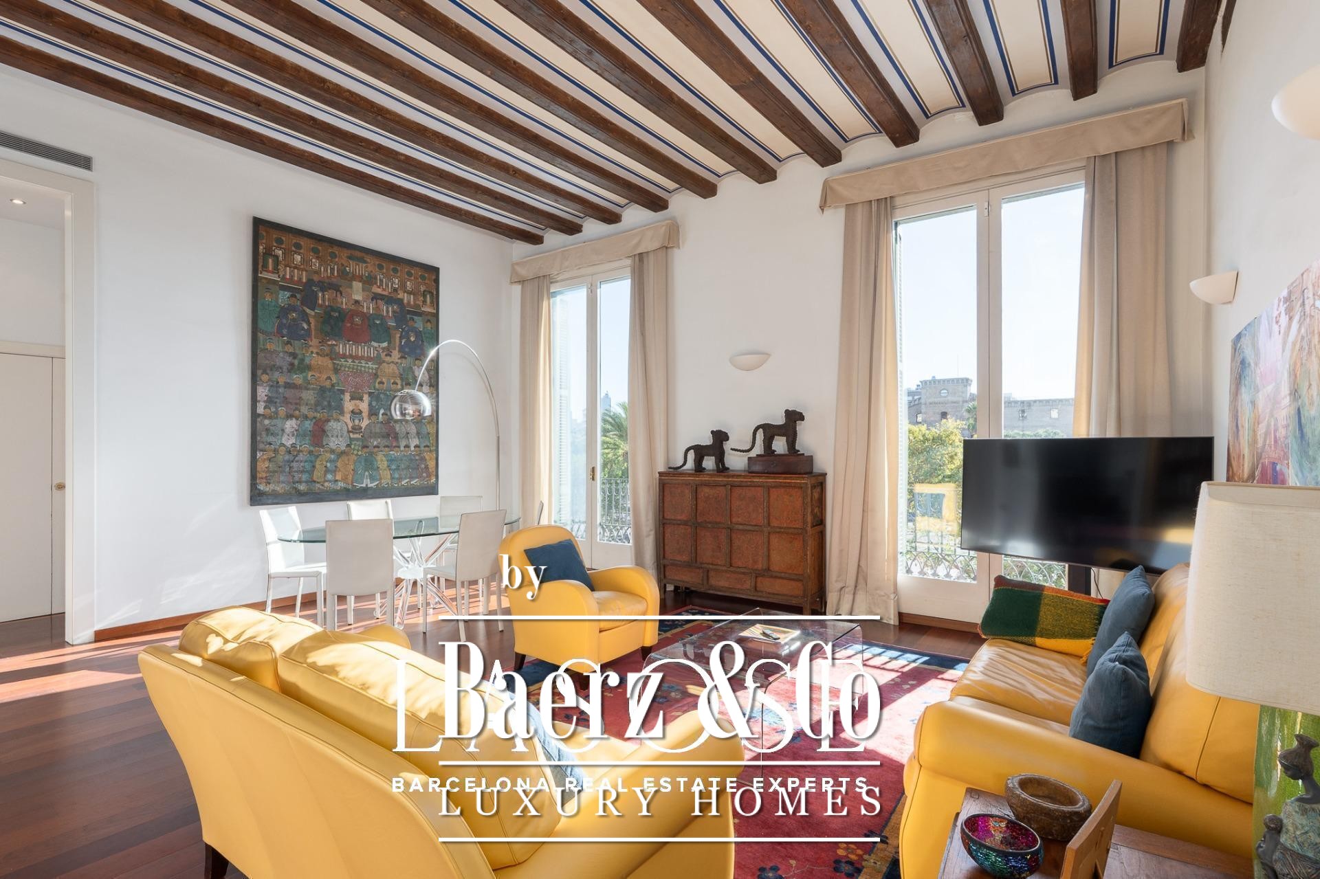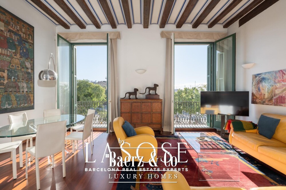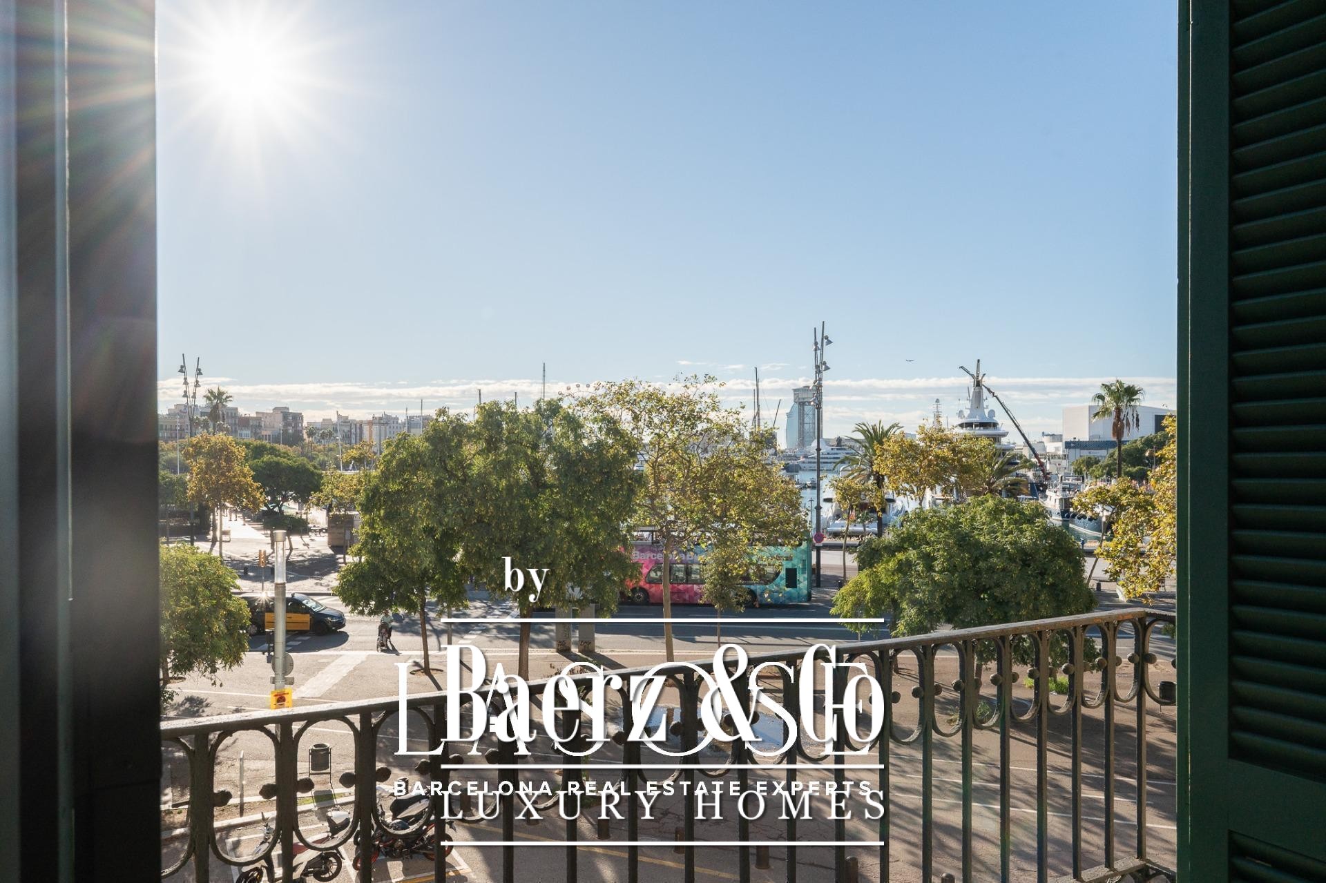 Apartment Barcelona bevindt zich in een historisch pand met uitzicht op de jachthaven van de stad. Deze woning van 122 m² beslaat een voorname locatie aan de Carrer Llauder en biedt een uitzonderlijke combinatie van karakteristiek erfgoed en hedendaags wonen. Binnen ontvouwt zich een ruimte met plafonds van 3,8 meter hoog, zichtbare houten balken en Catalaanse gewelven, verrijkt met met de hand beschilderde details. Smeedijzeren balkons omlijsten het open zeezicht en het groen van Las Ramblas de Mar, waardoor iedere kamer baadt in mediterraan licht.