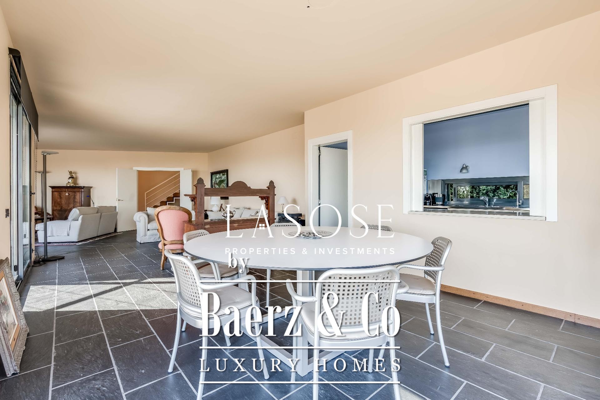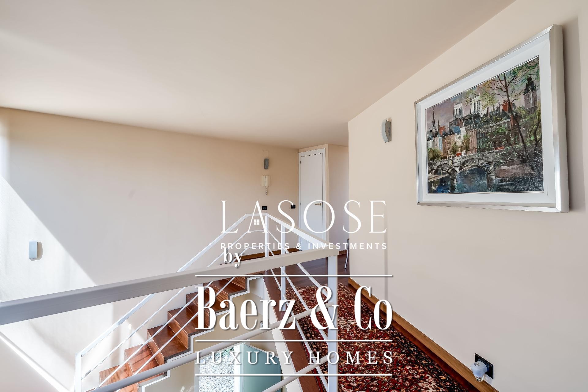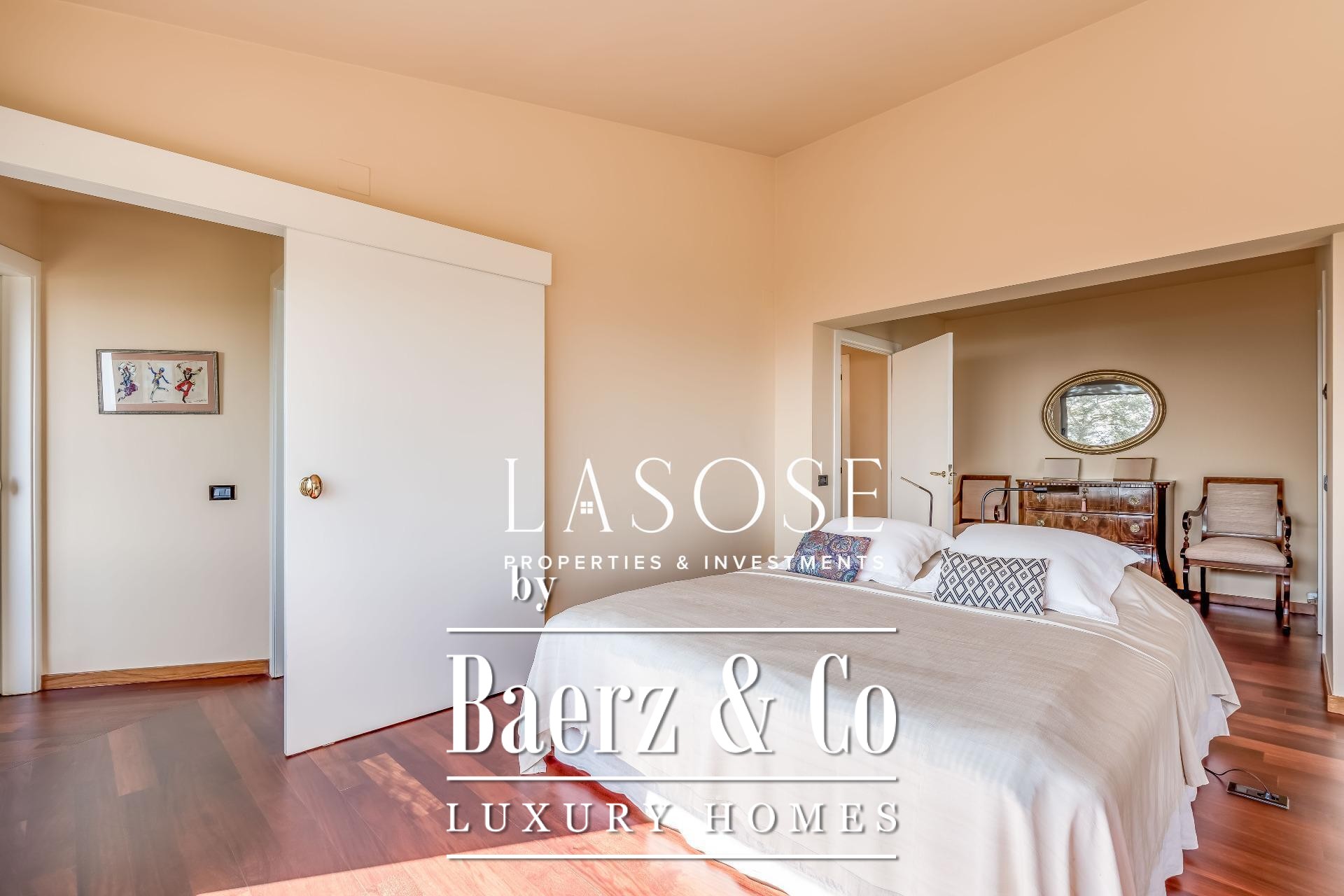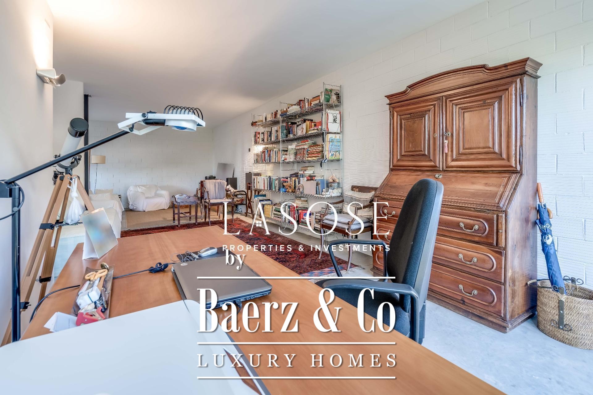 Op de verdieping bevinden zich twee ruime slaapkamers, een royale dressing en een complete badkamer. Grote ramen zorgen voor veel daglicht en het parket met vloerverwarming draagt bij aan het comfort. Op de benedenverdieping is een zelfstandig zomerappartement van 115 m² met dressing, badkamer en toegang tot de tuin. Buiten zijn een privézwembad en aangelegde tuin, alles gelegen in een discrete woonomgeving.