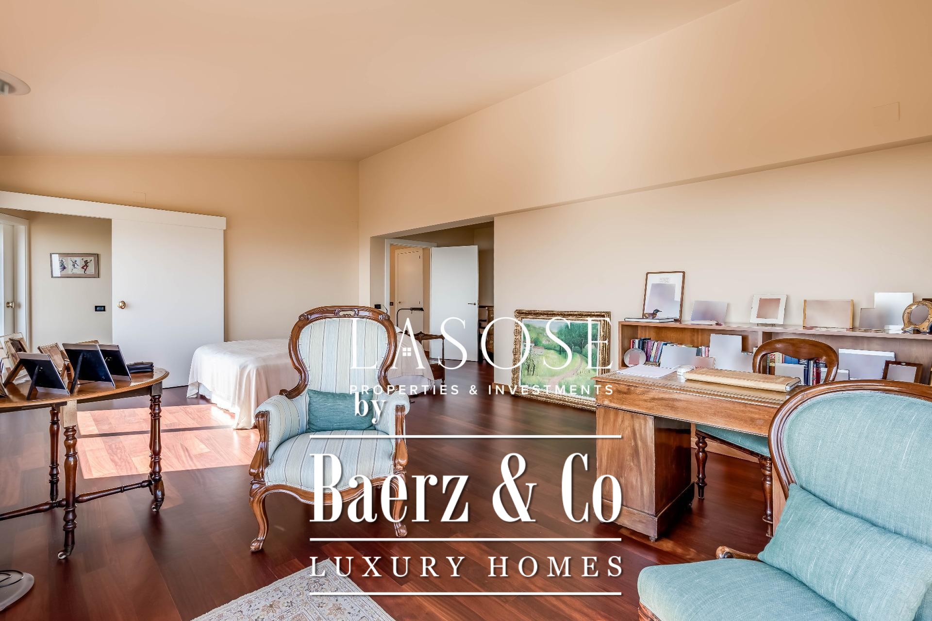 Bij binnenkomst op de begane grond leidt een royale hal naar een indrukwekkende woon- en eetkamer. Dit centrale vertrek opent naar een terras van 90 m² met onbelemmerd uitzicht over Barcelona en het Collserola Park. De onafhankelijke keuken is volledig uitgerust en beschikt over een bijkeuken en aparte wasruimte met eigen ingang. Een aangrenzende slaapkamer met badkamer biedt flexibele mogelijkheden als gastensuite of extra leefruimte. Door het hele gelijkvloerse niveau is leistenen vloerverwarming aanwezig, met directe interne toegang tot een garage voor twee auto's.