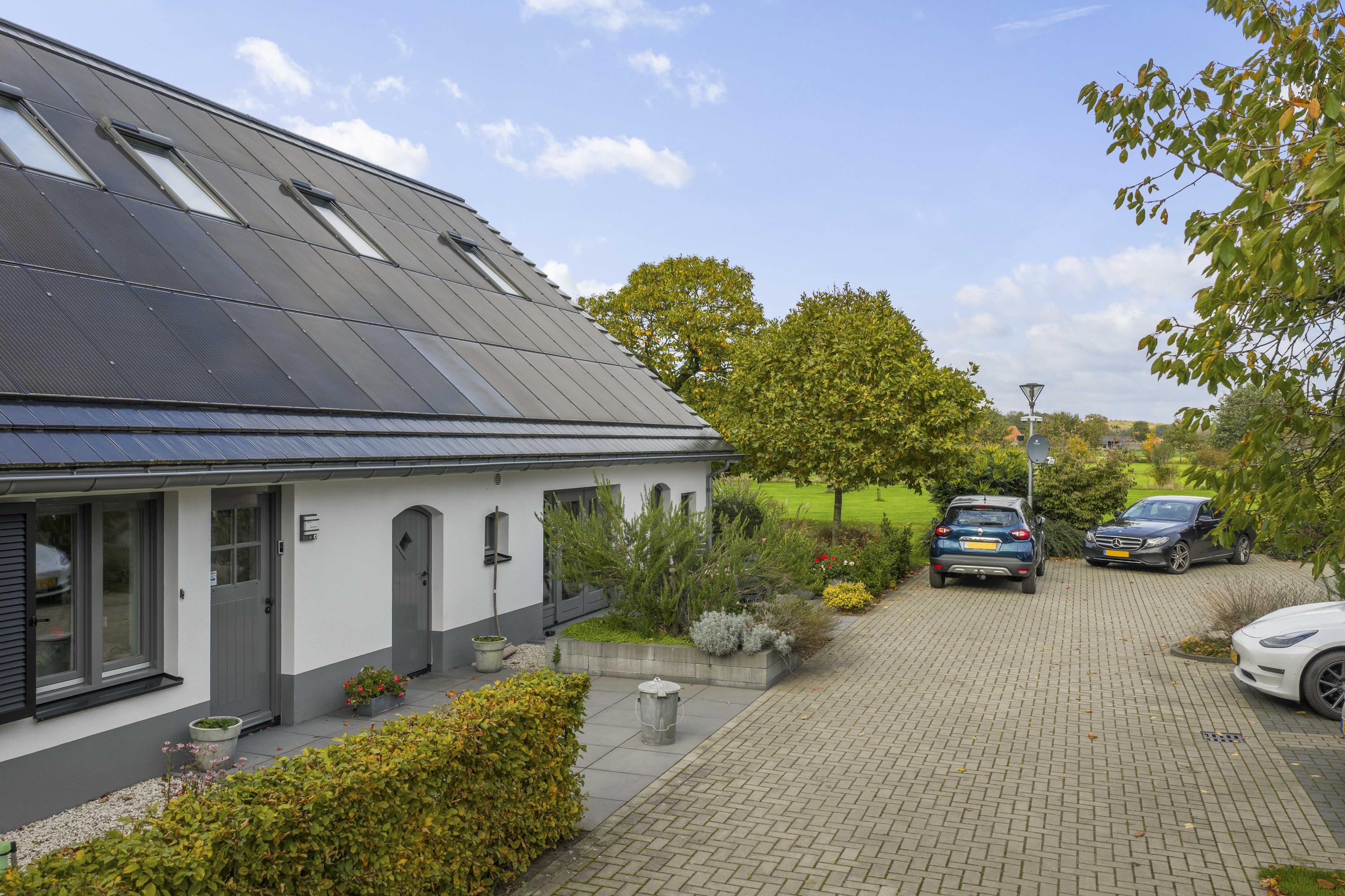 Deze magnifieke woonboerderij kreeg in 2016 haar huidige gestalte; toen werd de boerderij, die in 1924 gebouwd werd, van onder tot boven gerenoveerd. Hierbij lag de nadruk op verduurzaming; de buitenzijde werd volledig geïsoleerd met blokken styrofoam, rondom kreeg het huis nieuw HR+++-glas, er werd een water-water-warmtepomp aangelegd (die op 75 m diepte de warmte uitwisselt en ophaalt), de vloer binnen werd voorzien van een robuuste gietvloer – ideaal in combinatie met de vloerverwarming - en op de daken werden in totaal 110 (nee, dit is géén typfout) zonnepanelen gelegd. Onder de motorkap is dit huis één en al state-of-the-art technisch vernuft. Zelfs het kleurenpalet – de buitenzijde is wit gekeimd met grijs houtwerk en kraalrand – draagt bij aan het energiezuinige karakter van het huis, want waar de witte gevels het zonlicht reflecteren, absorbeert het grijs de warmte. Dit huis heeft niet alleen nul op de meter, het levert ook nog eens fiks terug! Een thuisbatterij is hier dus een prima aanvulling.