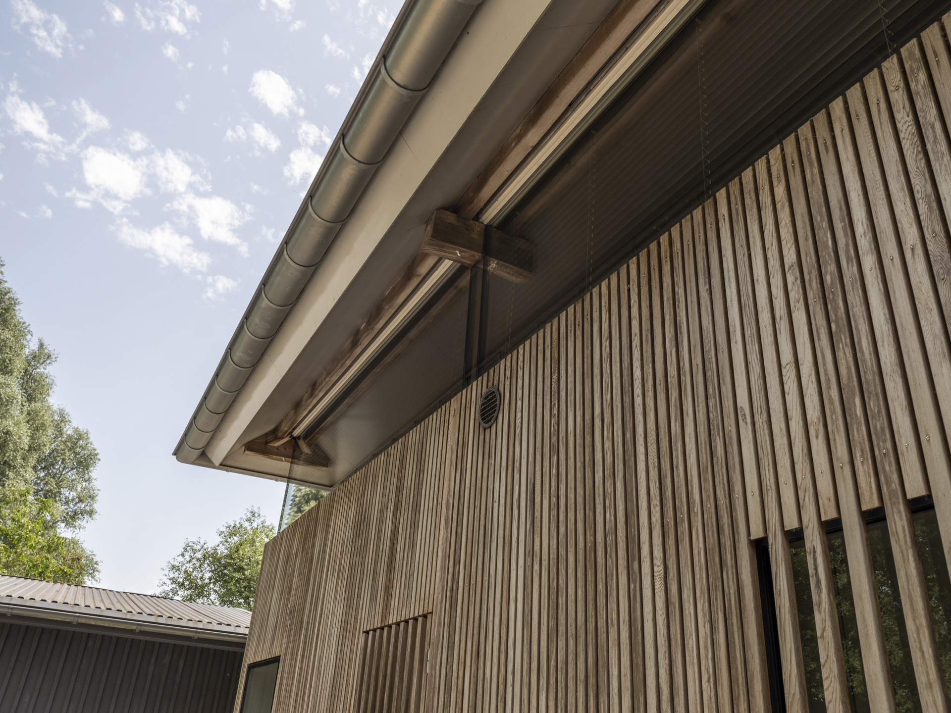 Onder leiding van architect Henri Borduin (borderarchitecture.com) is bij de verbouwing tot modern woonhuis bijzonder veel aandacht besteed aan details en lichtinval. Het oorspronkelijk karakter van de schuur is behouden gebleven, maar tegelijkertijd is deze getransformeerd tot een comfortabele, eigentijdse woning. Taps toelopende lichtkernen verbinden de ruimtes op de begane grond met het dak. Deze lichtkernen zijn zo geplaatst dat de bestaande draagstructuur en spanten een zichtbaar onderdeel van de woning vormen.