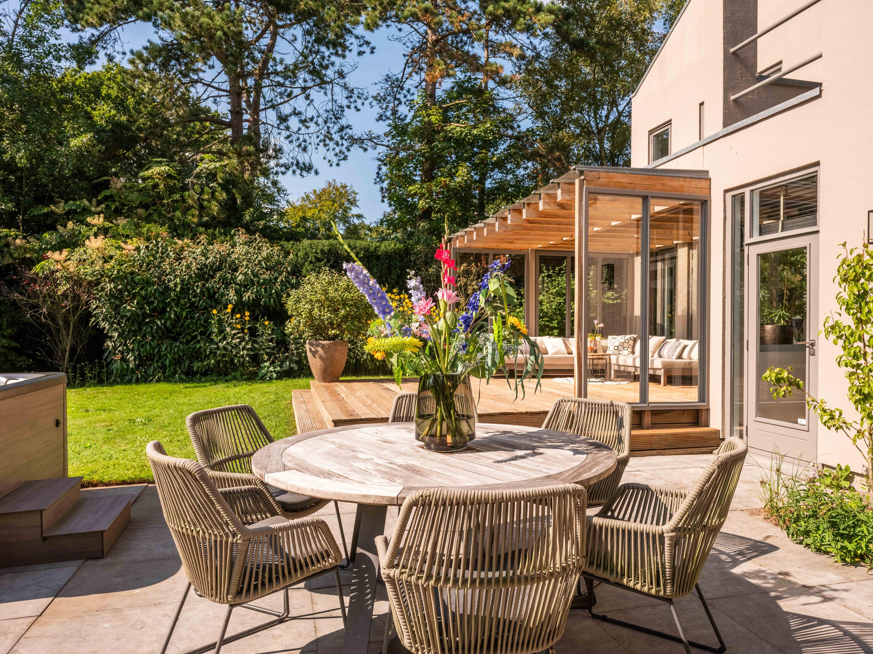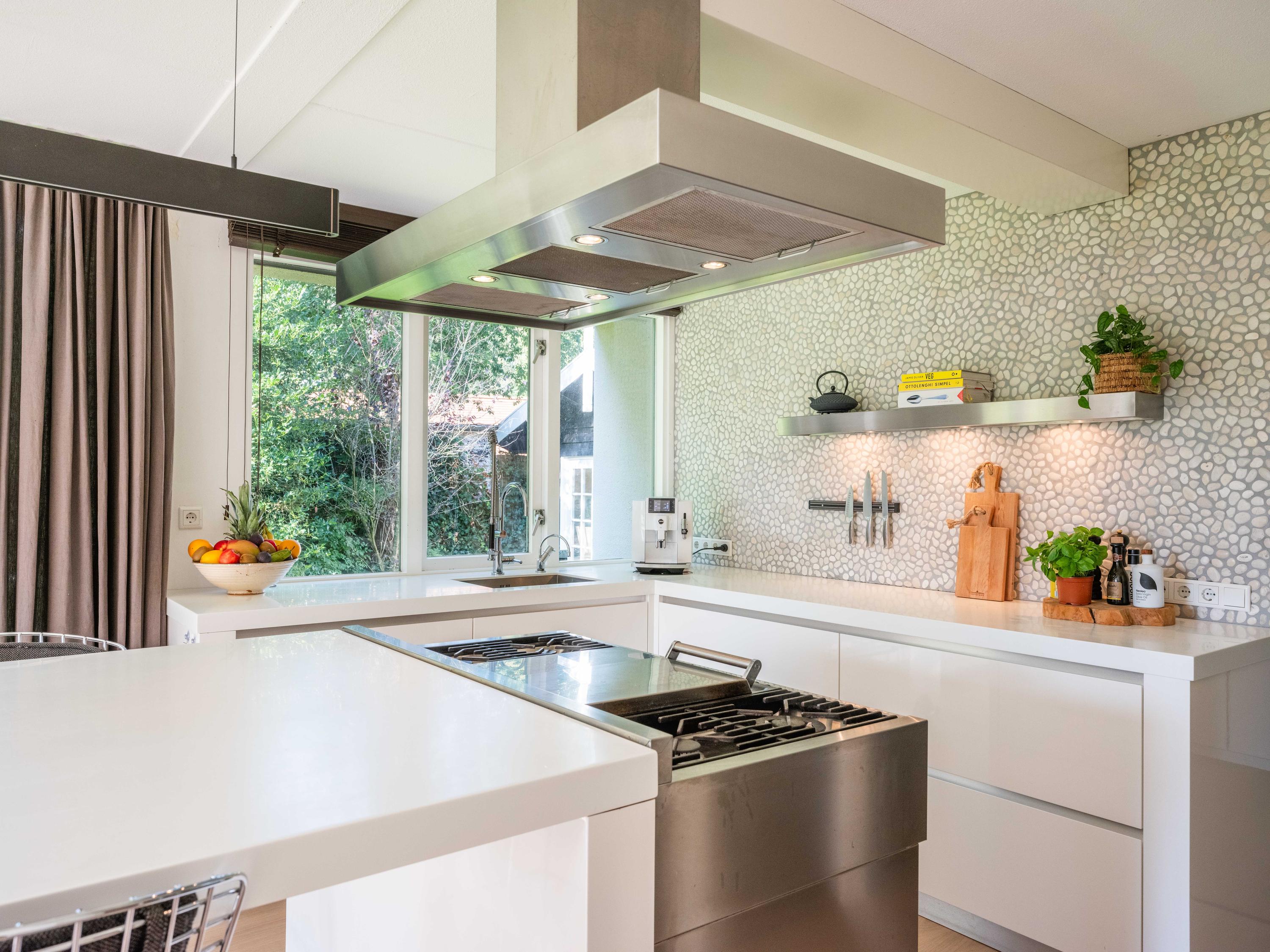 De moderne open woonkeuken is voorzien van een eiland waar men heerlijk gezamenlijk aan kan zitten. Ook van hieruit weer een prachtig uitzicht op het groen. Openslaande deuren en een overdekt verwarmd terras halen het buiten naar binnen. De keuken is voorzien van diverse inbouwapparatuur o.a. een quooker, koelkast, vriezer, stoomoven, wijnklimaatkast, warmhoudlade en vaatwasser. Kookgelegenheid is er op het grote fornuis met 4 gaspitten, een teppanyakiplaat, frituur en dubbele oven.