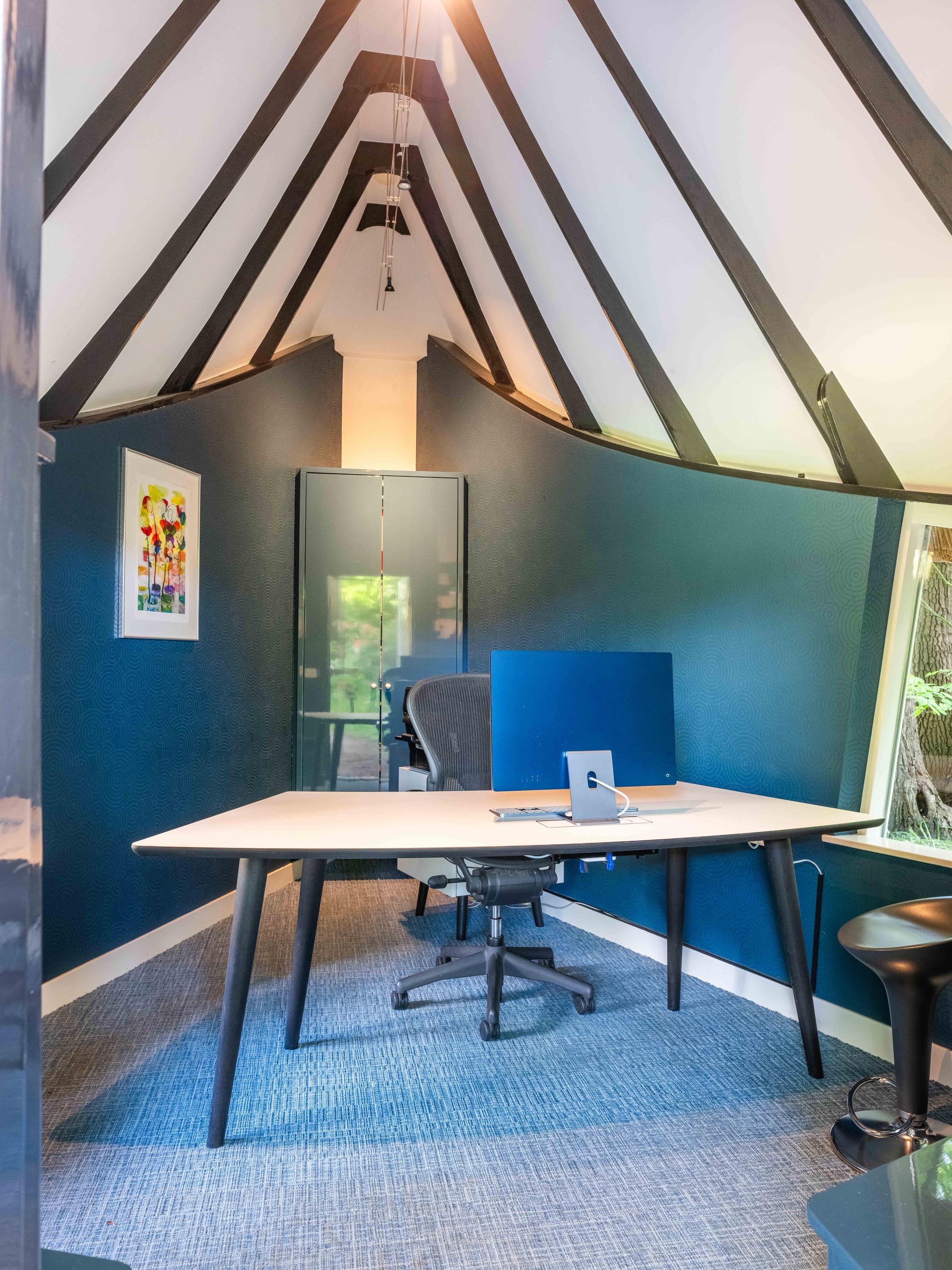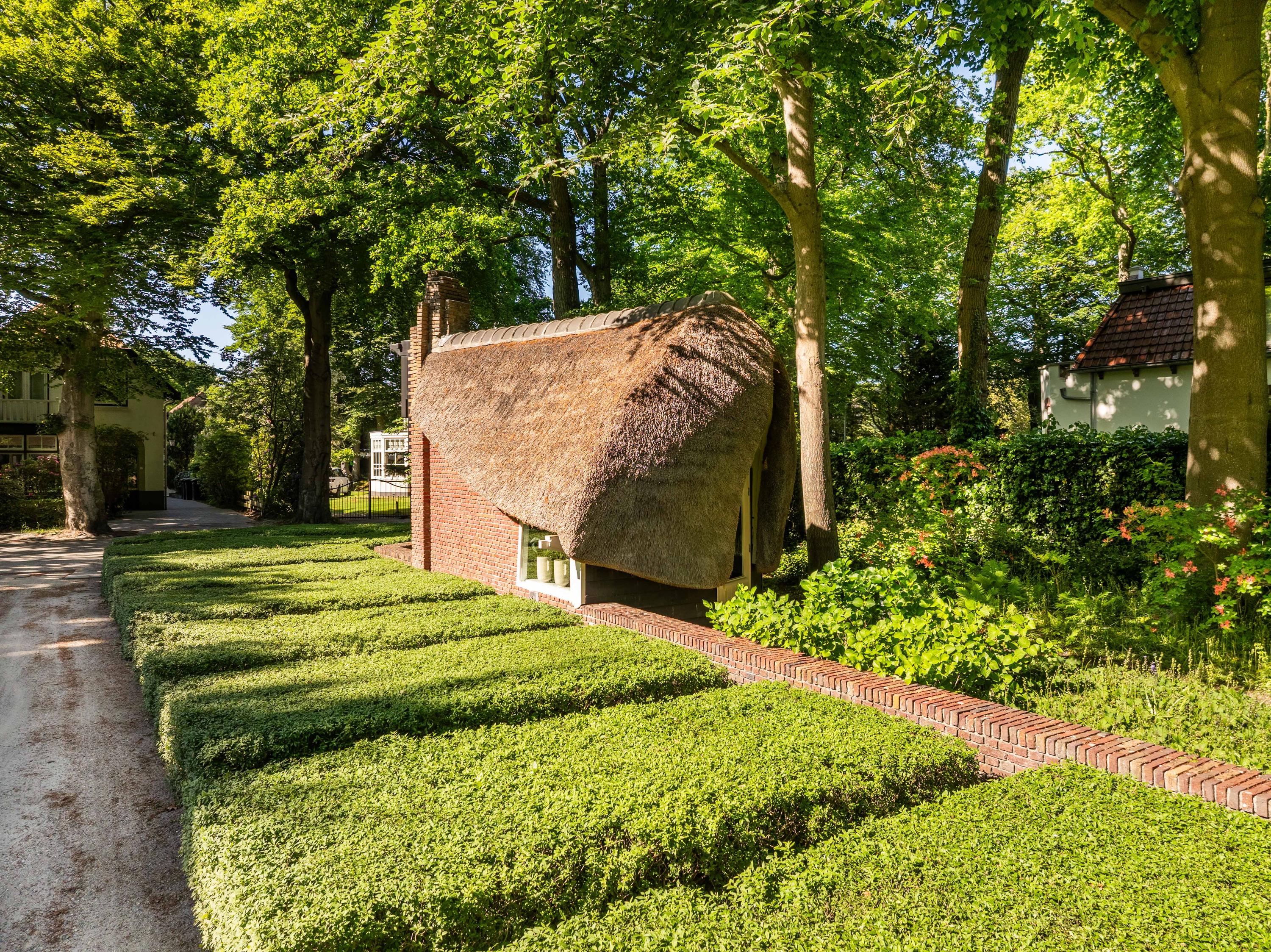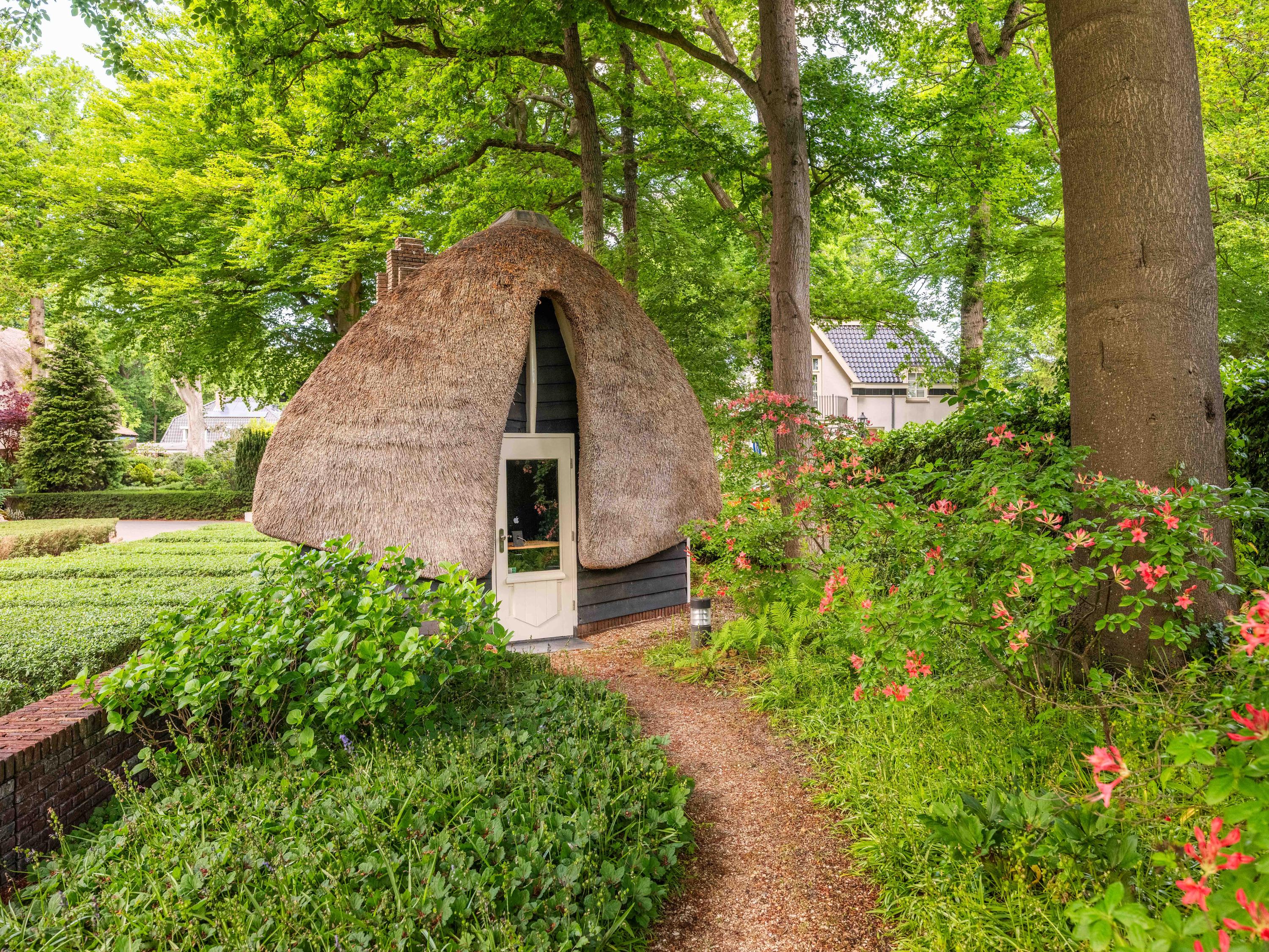 Als kers op de taart, hebben we nog het "ingangs"huisje, vooraan gelegen op het perceel, tussen de ligusterhagen. Dit karakteristieke gebouwtje met rieten kap roept het beeld op van "sloep aan het lijntje van de Ark". Een heerlijke werkplek met ook hier weer authentieke Amsterdamse School elementen.