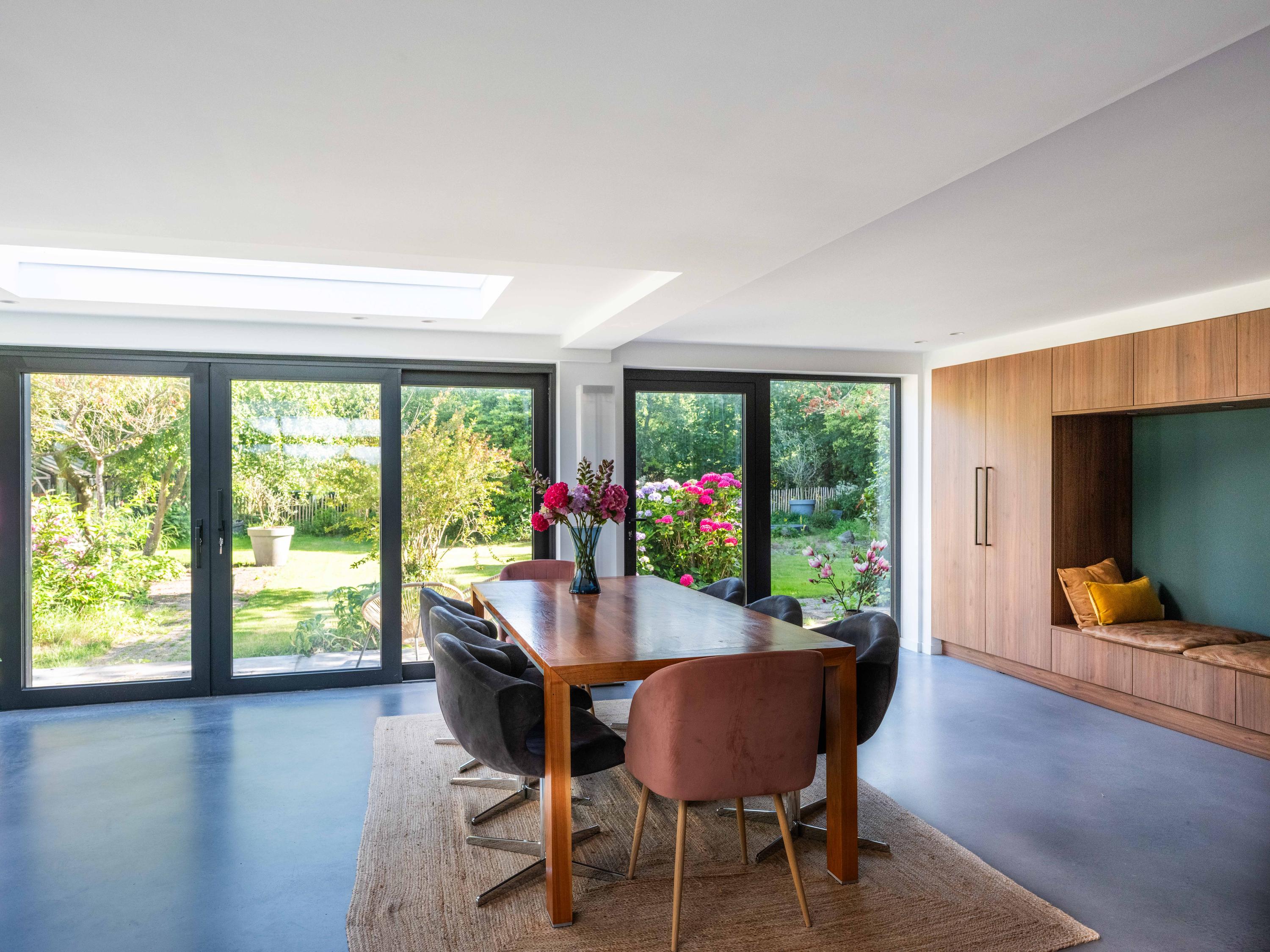 De op maat gemaakte keuken in rijk notenhout is een droom voor iedere kookliefhebber: zeer compleet, met hoogwaardige apparatuur waaronder een luxe wijn wijnklimaatkast. Een architectonisch hoogstandje is de notenhouten wand met verborgen deur; hierachter schuilt een ruimte die perfect dienst kan doen als riante bijkeuken. De zitkamer aan de voorzijde biedt een gezellige speel-/leeshoek en een panoramisch uitzicht over de polder. Aan de achterzijde vindt u de lichte eetkamer met grote dakramen, maatwerkkasten en openslaande deuren naar de tuin.