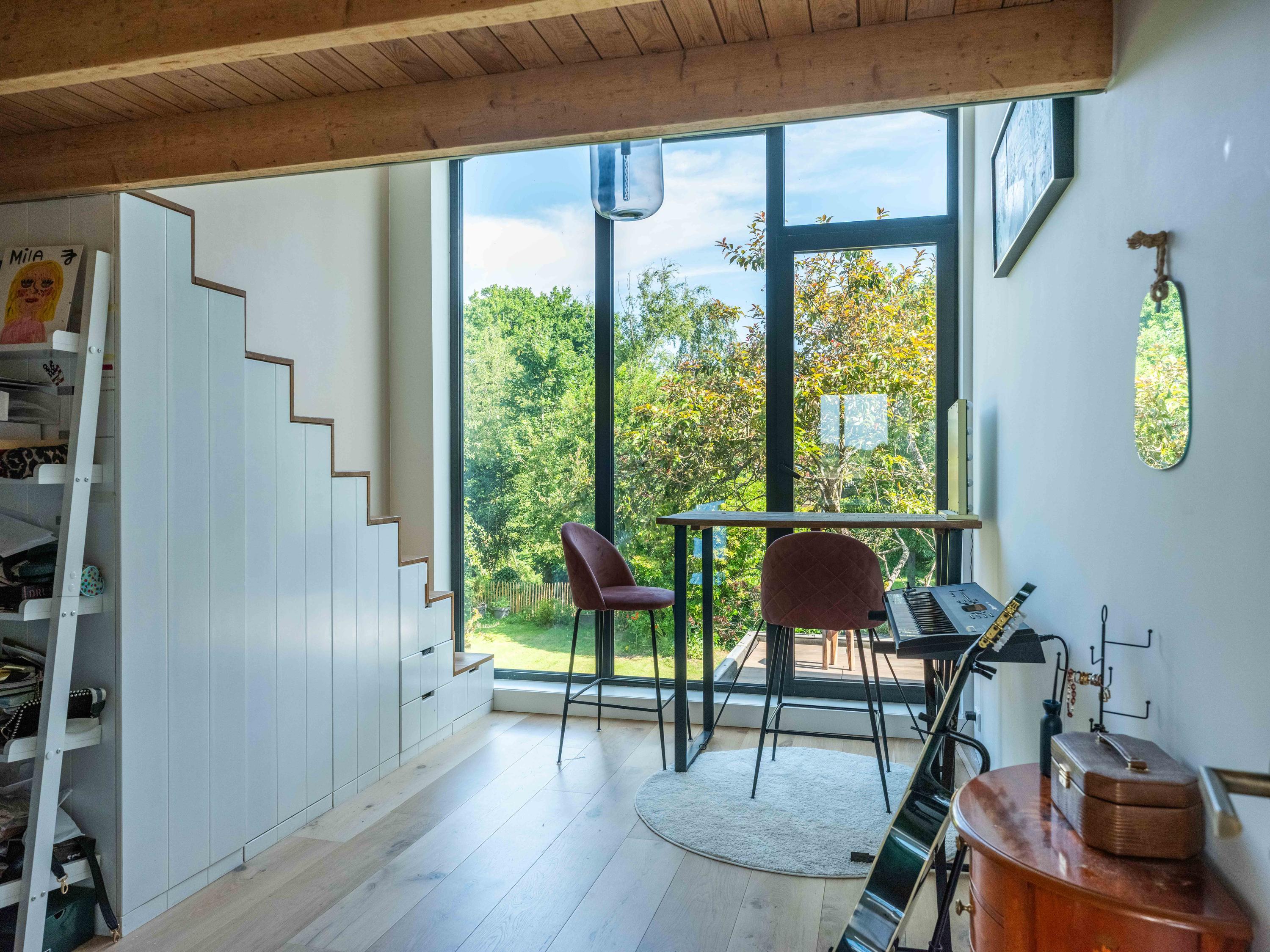 De bovenverdieping is het domein voor de kinderen en hobby's. Naast drie fijne slaapkamers, een tweede badkamer met grote inloopdouche, separaat toilet, en wasruimte, vindt u hier verrassende extra’s. Denk aan een inspirerende werkkamer met weids uitzicht, een serene yogaruimte en een speelse vide waar u zich terugtrekt met een goed boek.