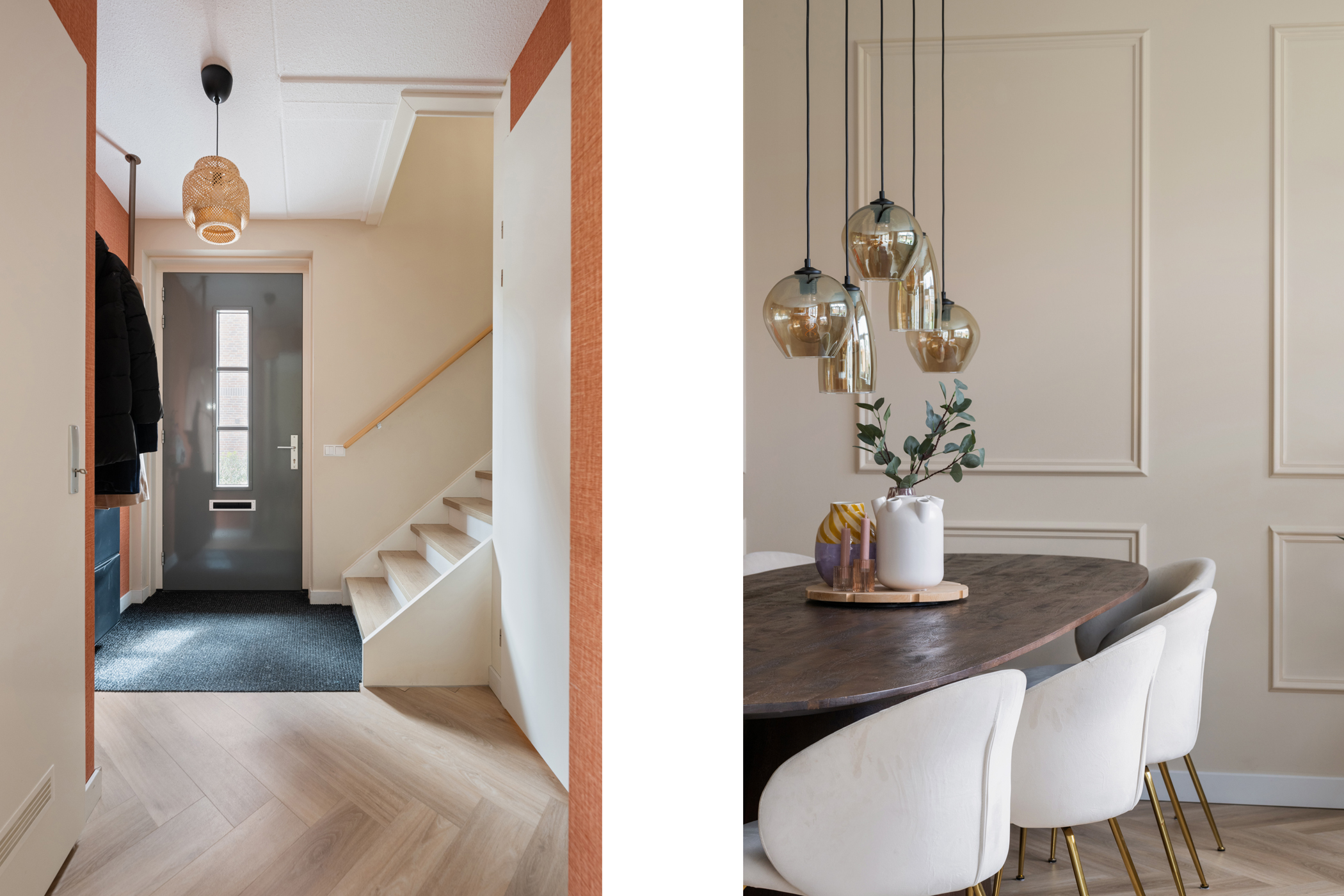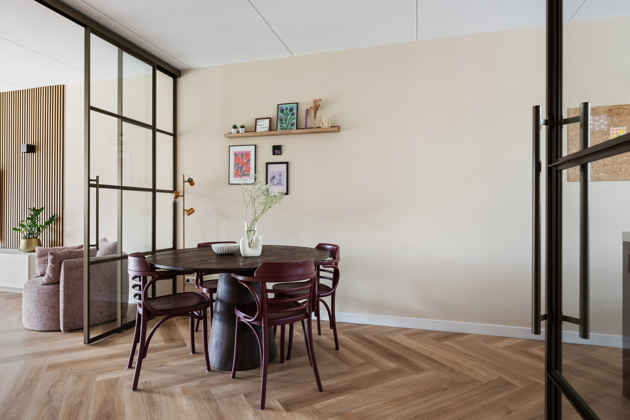Wat deze leefruimte extra bijzonder maakt, zijn de elegante koperkleurige stalen schuifdeuren die de woonkamer en keuken op subtiele en stijlvolle wijze van elkaar scheiden. Ze zorgen voor een speelse indeling, zonder het gevoel van ruimte en licht te verliezen.