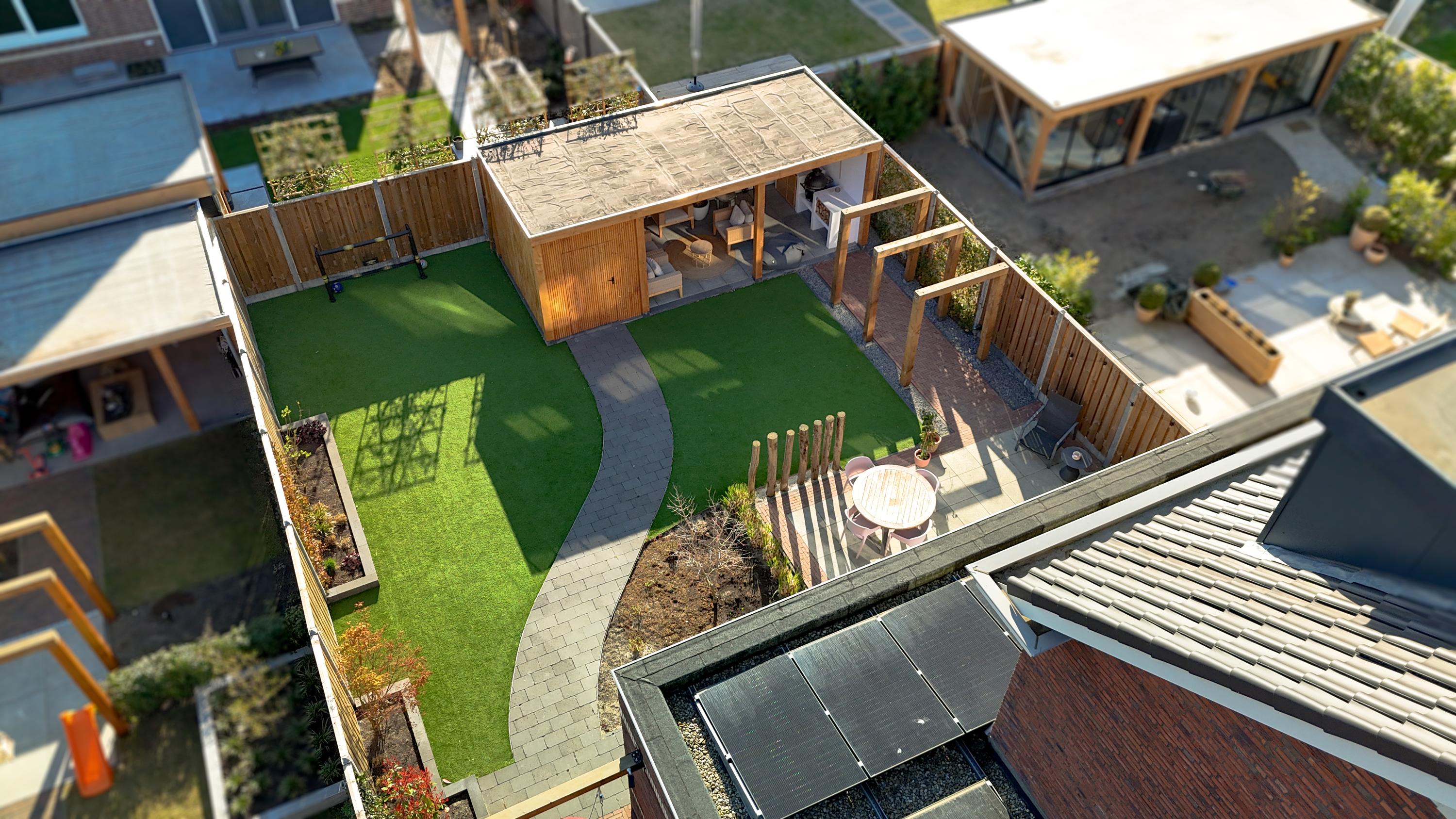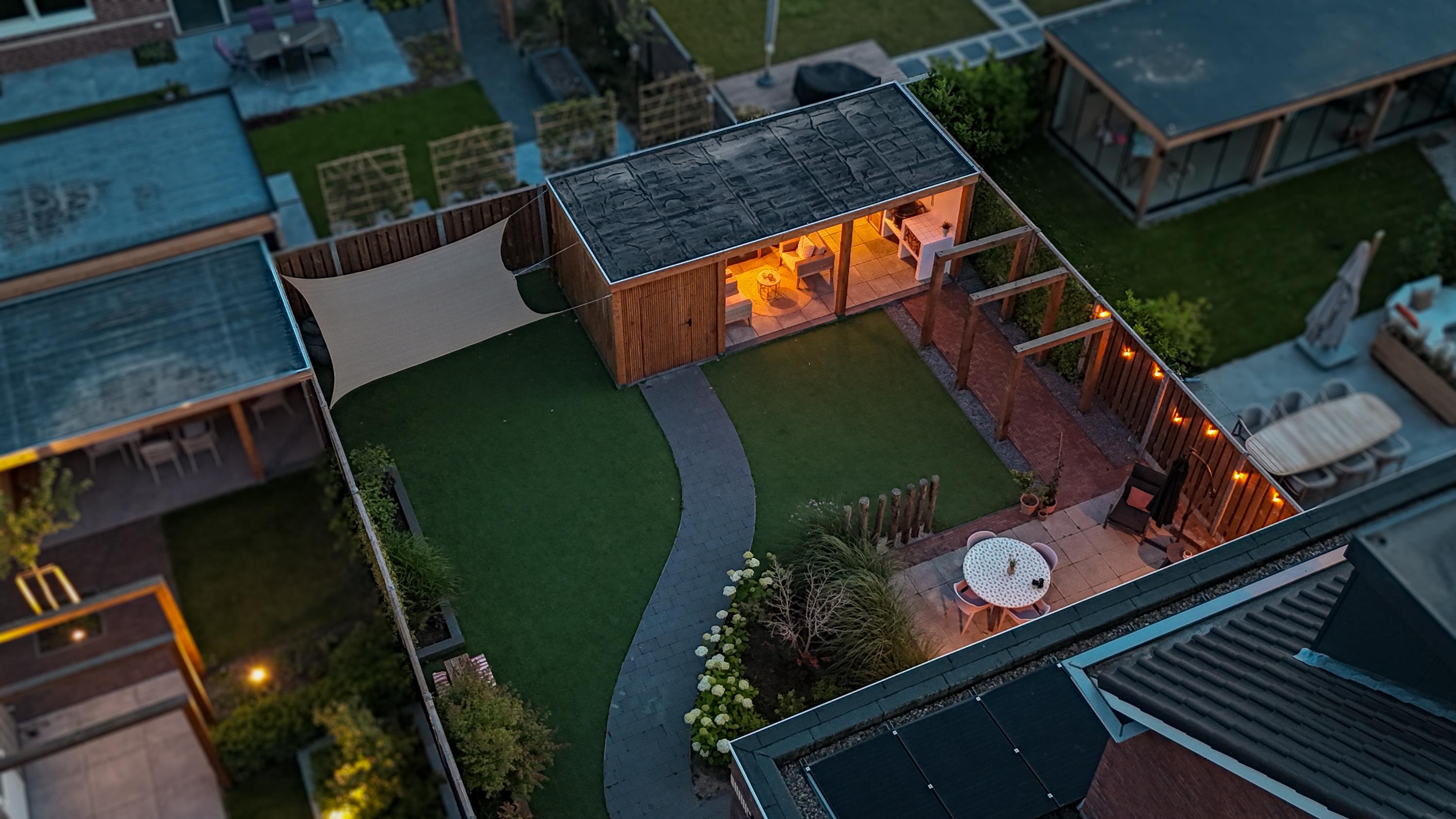 Via openslaande deuren stap je de fraai aangelegde achtertuin in, een oase van rust en privacy. Dankzij de gunstige ligging kun je hier op elk moment van de dag genieten van zowel zon als schaduw. De tuin is voorzien van een professioneel aangelegd drainagesysteem, waardoor ook na een regenbui alles netjes en droog blijft.