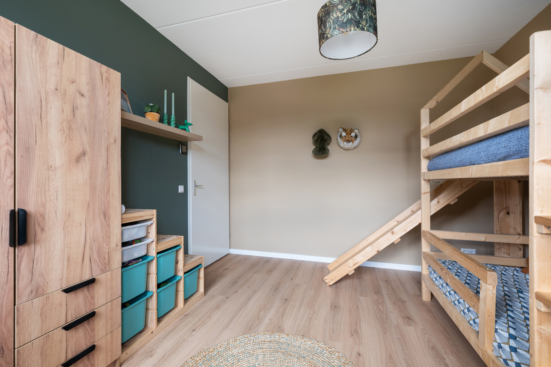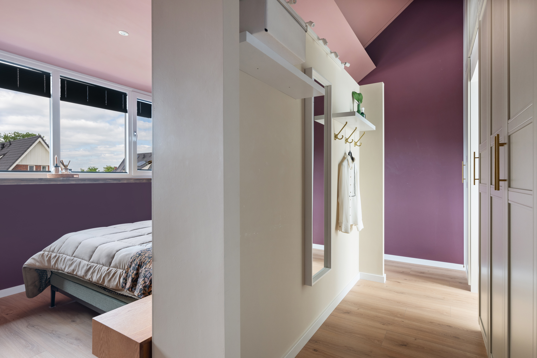 Wat deze kamer tevens bijzonder maakt, is de indrukwekkende hoeveelheid kastruimte die doorloopt tot aan de hoge nok van het huis. Deze op maat gemaakte oplossing biedt een zee aan opbergruimte, prachtig weggewerkt en toch altijd binnen handbereik. Bovendien is bovenin de kamer extra bergruimte slim verwerkt in een verhoogde nis — ideaal voor koffers en seizoensspullen.