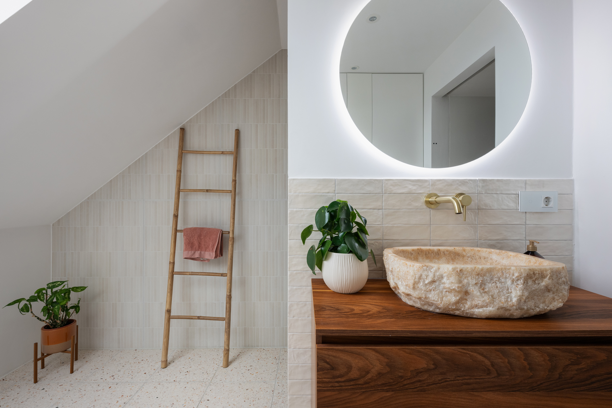 De moderne badkamer is een fijne, ontspannende plek met een luxe ligbad, een ruime inloopdouche en een dubbele wastafel. Alles is tot in detail afgewerkt, zodat je hier elke dag in alle rust kunt opstarten of afsluiten.