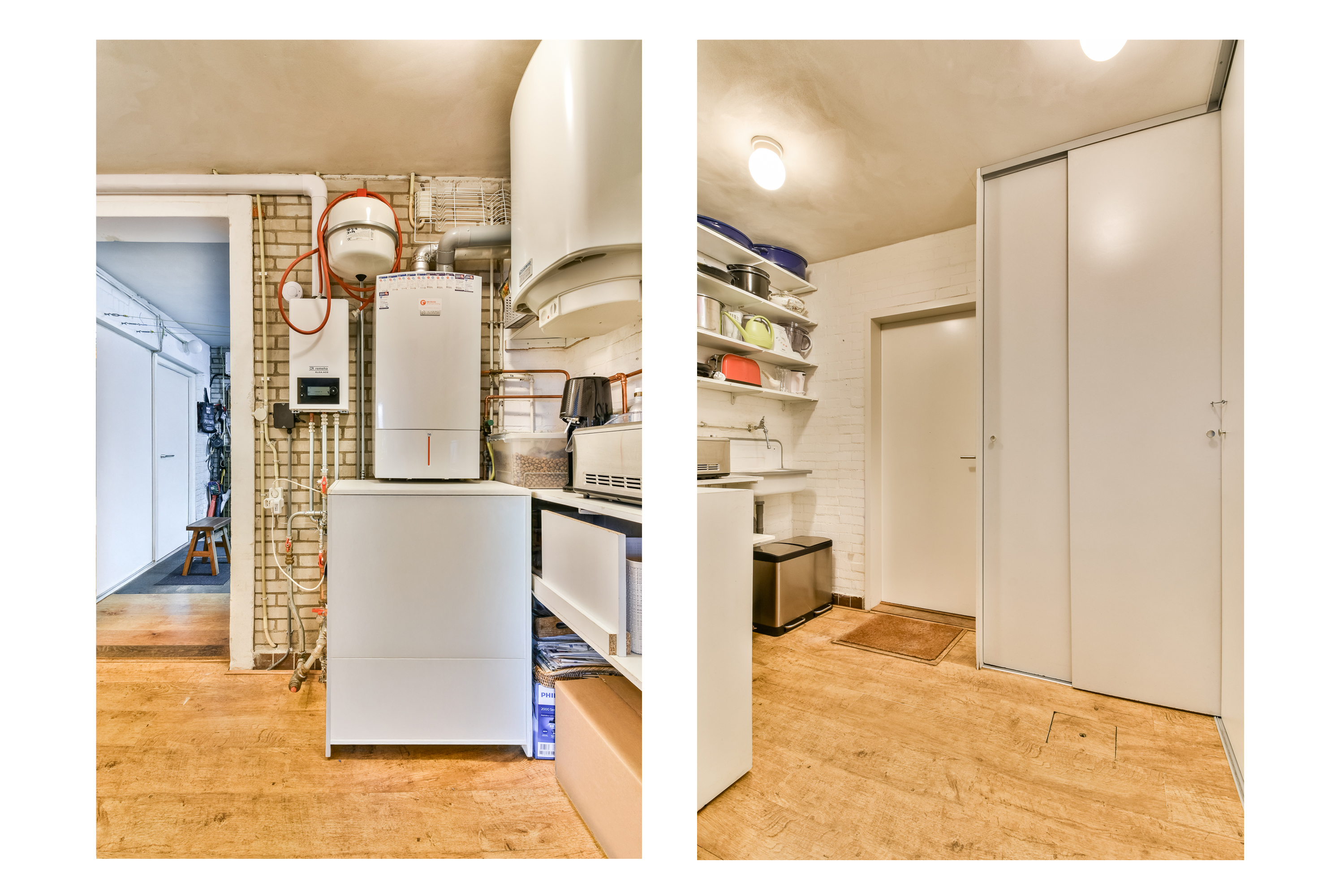 Aansluitend aan de keuken bevindt zich een bijkeuken met ingebouwde kasten, cv-ketel, boiler en de binnen unit van de hybride warmtepomp. Vanuit deze ruimte is een ruime inpandige berging (voormalige garage), waar zich de aansluitingen voor de wasmachine en de droger bevinden.