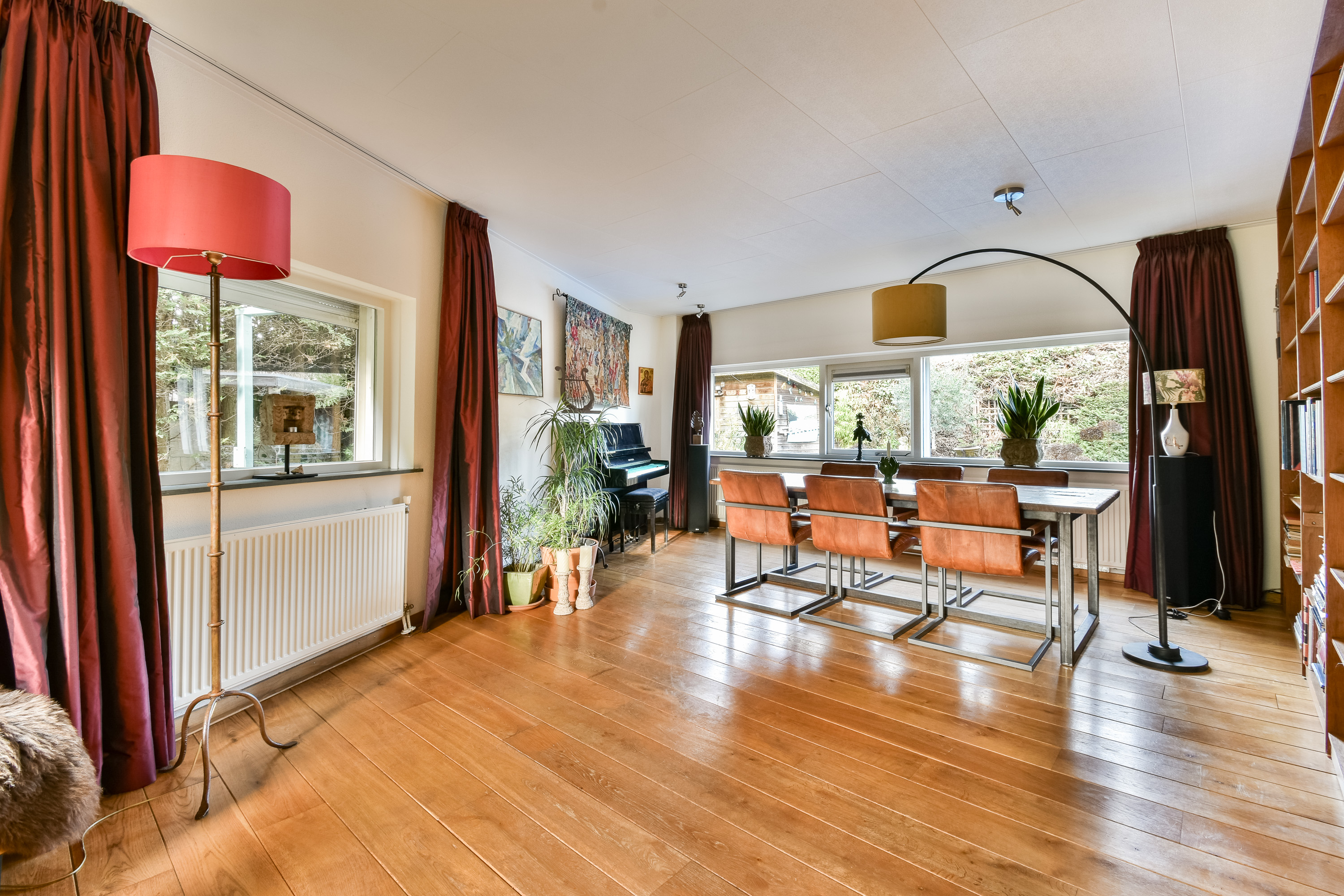 De gehele benedenverdieping, behoudens bijkeuken en berging, is voorzien van een fraaie massief eikenhouten vloer.