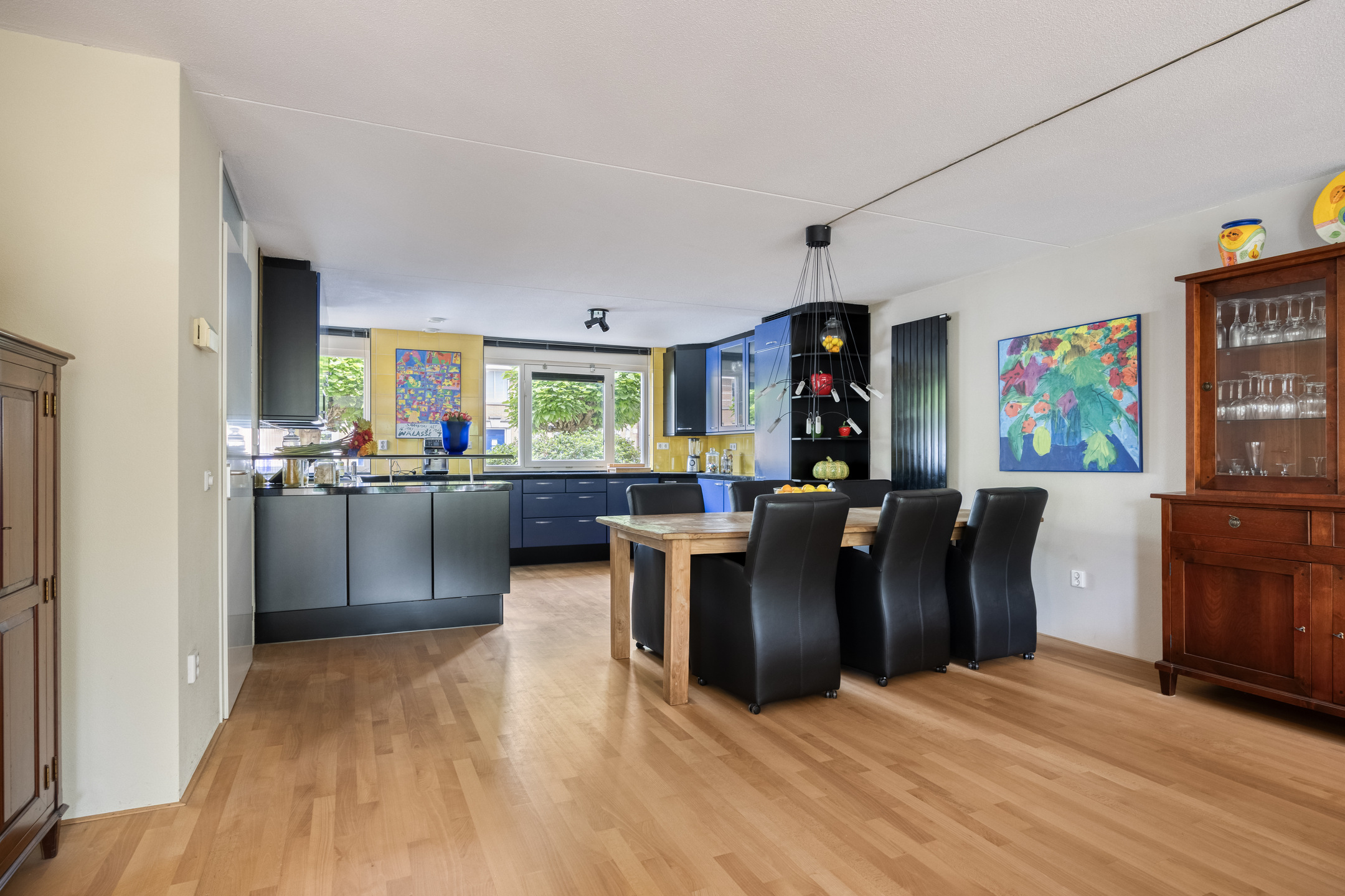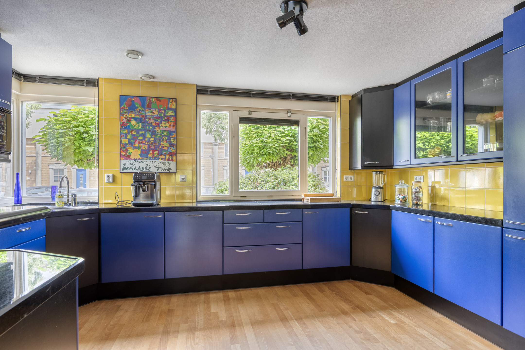 De royale woonkeuken ligt aan de voorzijde van de woning en is voorzien van veel kastruimte, een granieten aanrechtblad en diverse inbouwapparatuur, zoals een gasfornuis met afzuigkap, oven, magnetron,