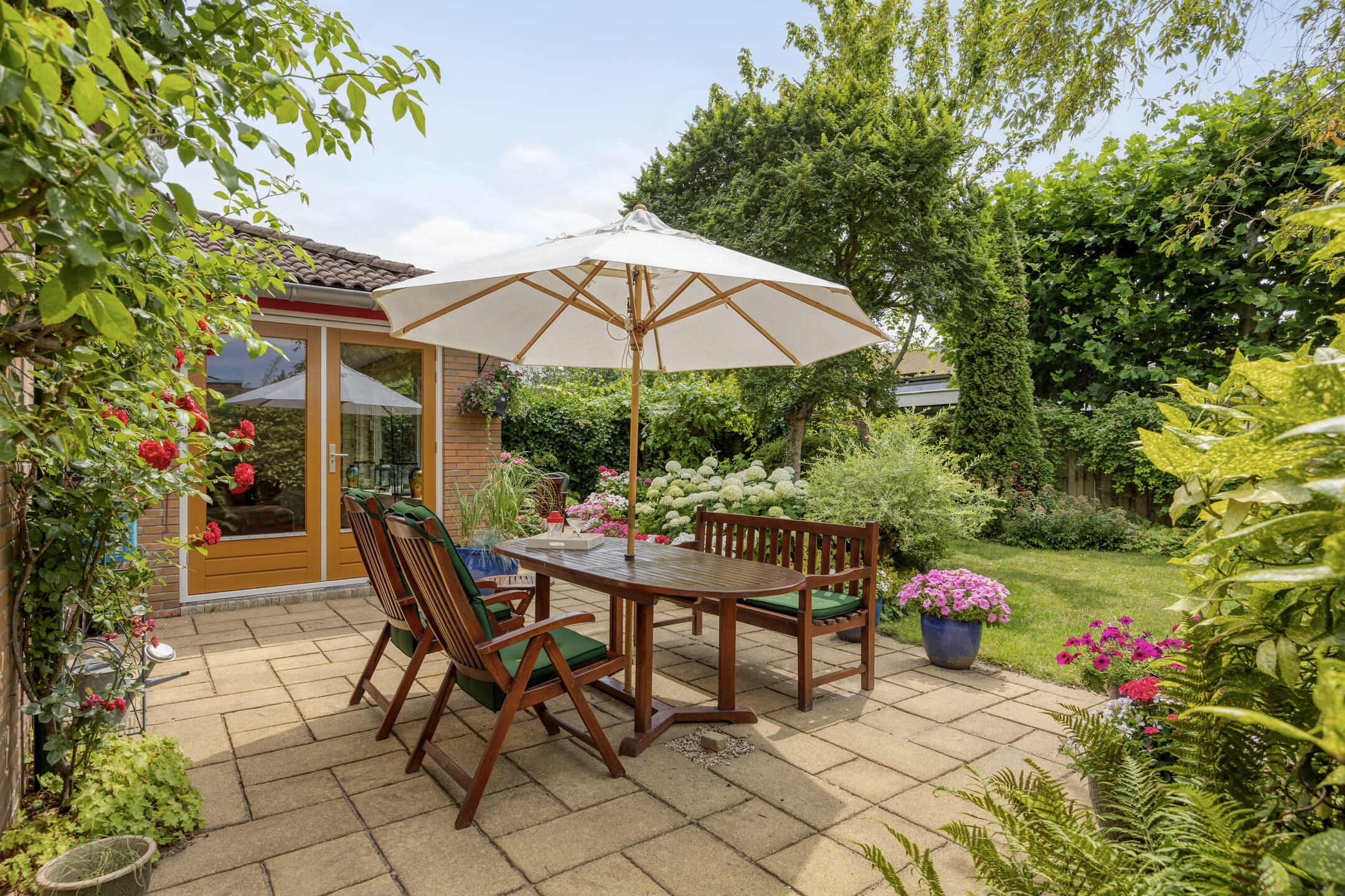 De fraai aangelegde achtertuin is gelegen op het zonnige zuidwesten en biedt volop privacy. Het gazon in combinatie met diverse planten, struiken en bomen zorgt voor een groene, rustige sfeer. Een heerlijke