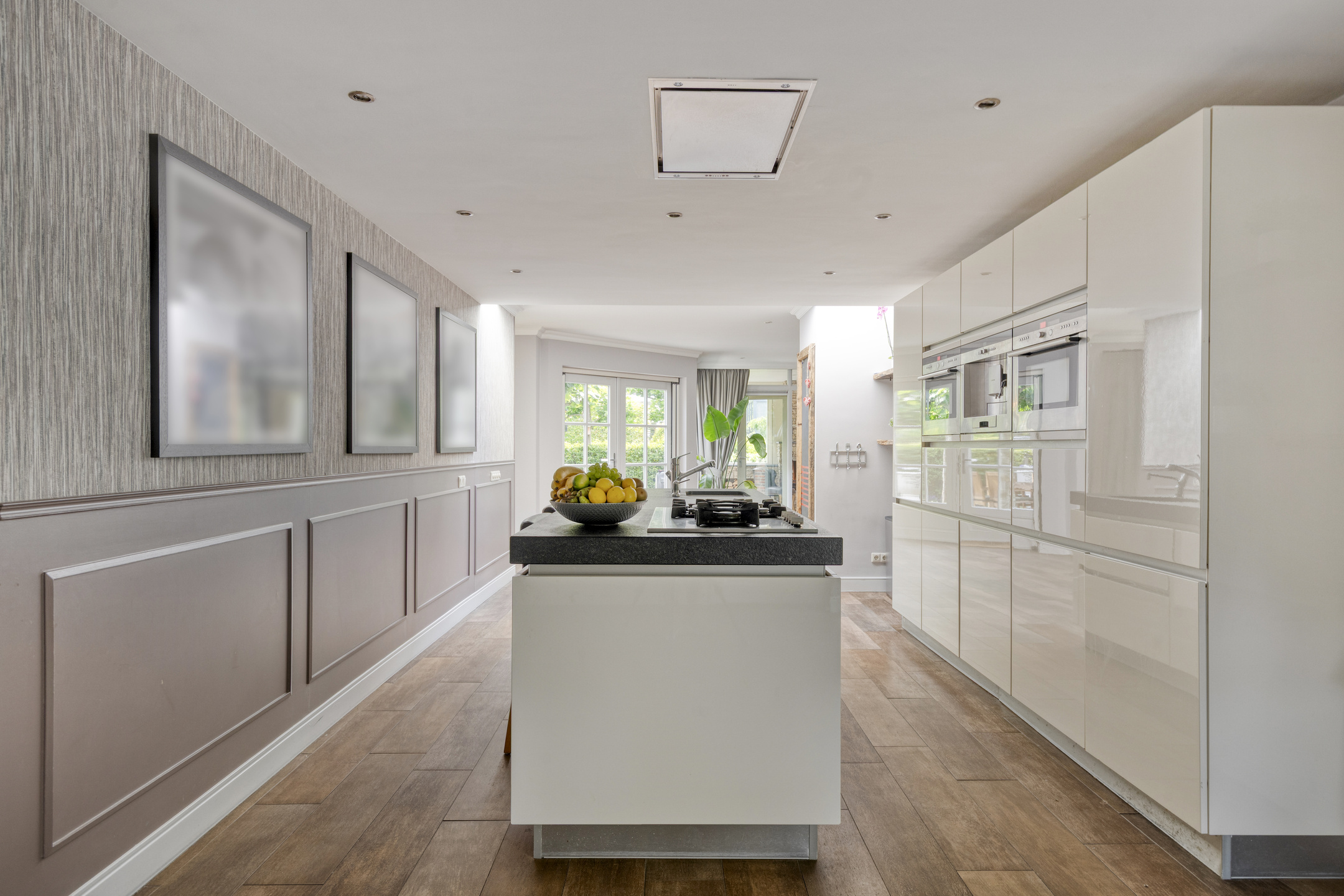 Binnenkomst in de open keuken met kookeiland en een uitgebreide kastenwand met apparatuur van Siemens. De volgende apparaten zijn hierin verwerkt: koffiezetapparaat, combi oven/magnetron, en een koel-vriescombinatie. In het kookeiland zitten naast de spoelbak en veel berglades, een vaatwasser, 5 pits gaskookplaat met daarboven een geïntegreerde afzuigkap. De in het dak verwerkte lichtstraat zorgt voor een prettige, natuurlijke lichtinval.