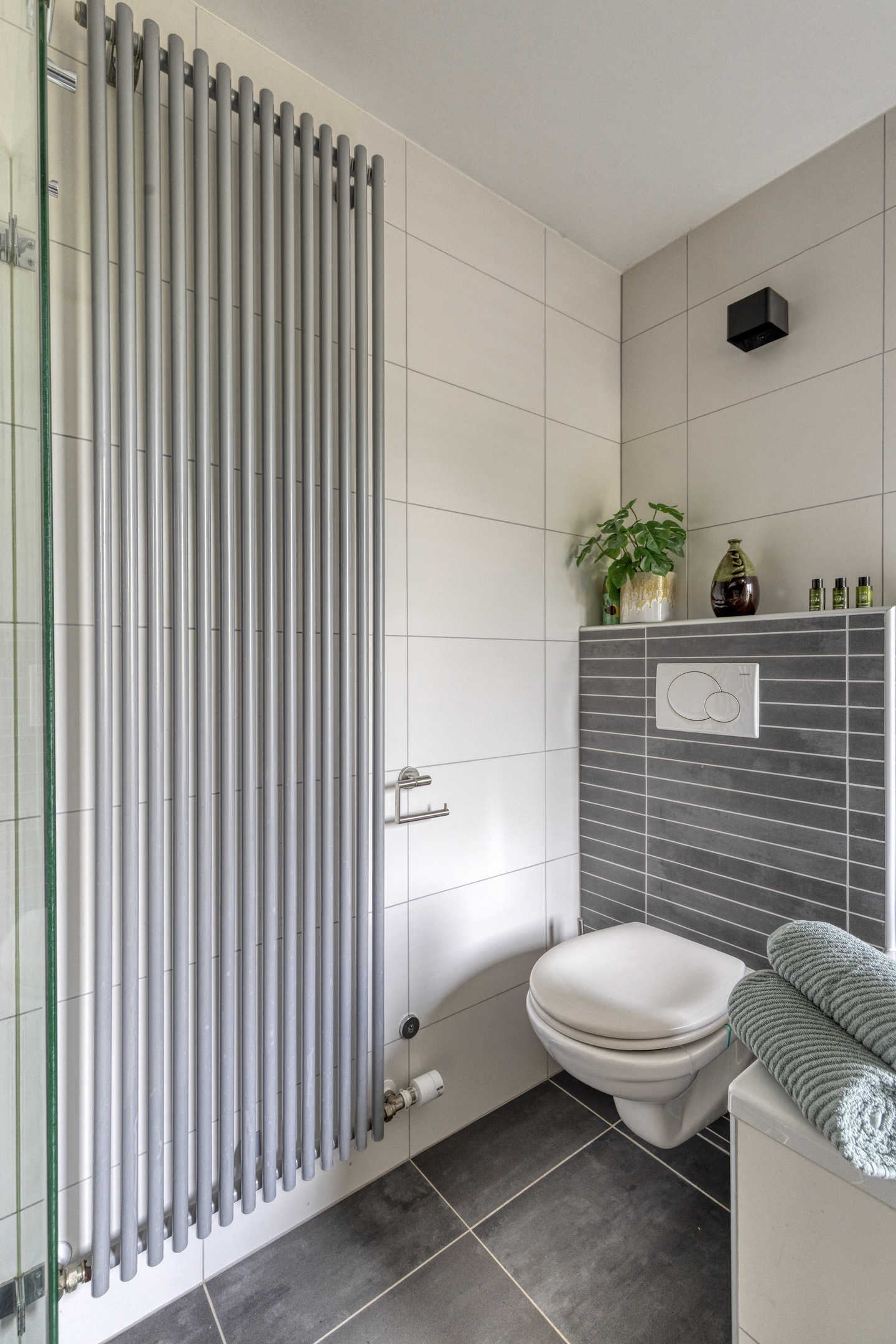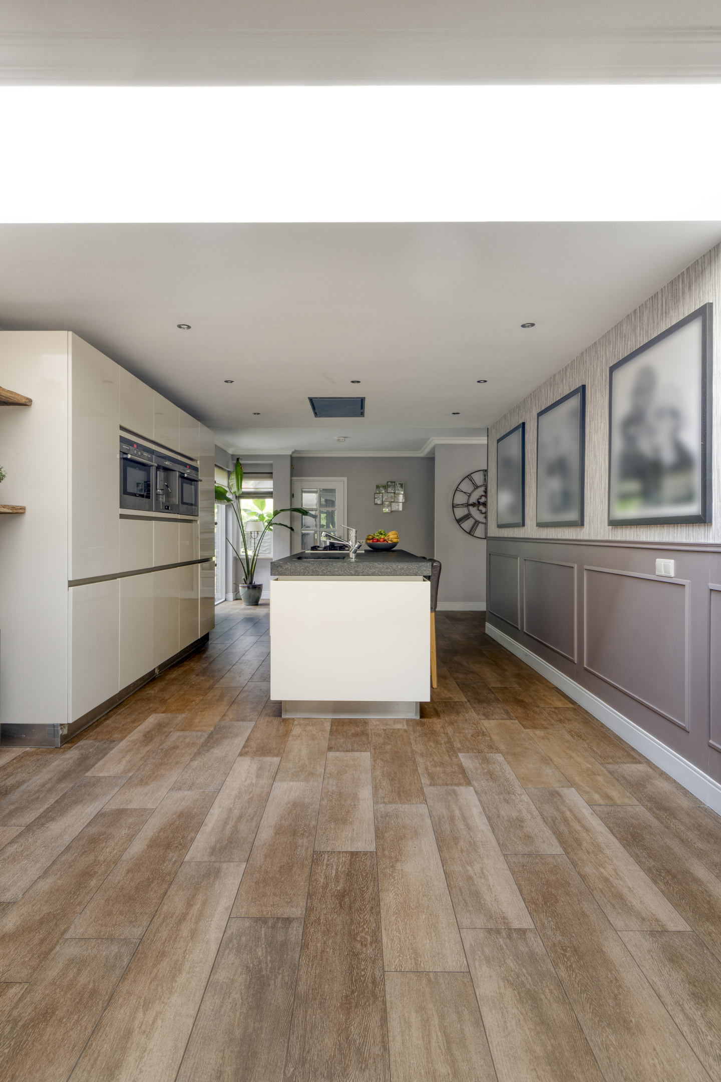 De gehele begane grond inclusief de veranda is voorzien van een houtlook tegelvloer met vloerverwarming.