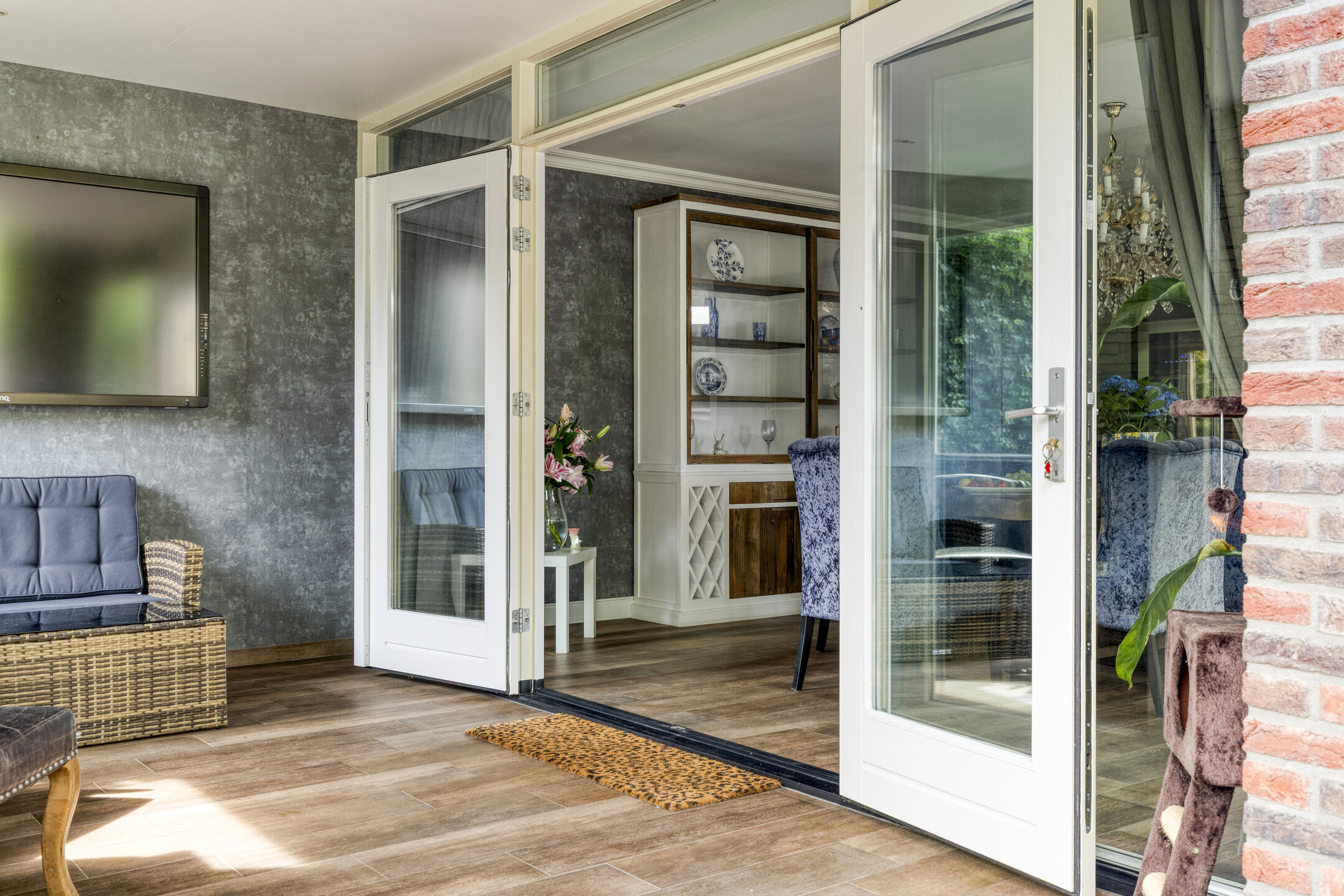 In het verlengde van de keuken bevindt zich de eetkamer met een extra keukenblok met onder andere een extra koelkast en een klimaatkast. Vanuit de eetkamer kom je via openslaande deuren in de veranda met openhaard en is er een deur naar de garage. Ook geven de openslaande deuren toegang geven tot de achtertuin.