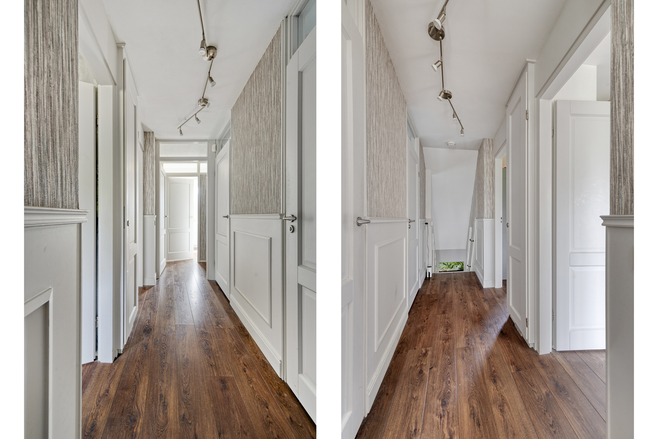 Overloop met laminaatvloer en toegang tot de slaapkamers, badkamer en trap naar 2e verdieping en bergkast.