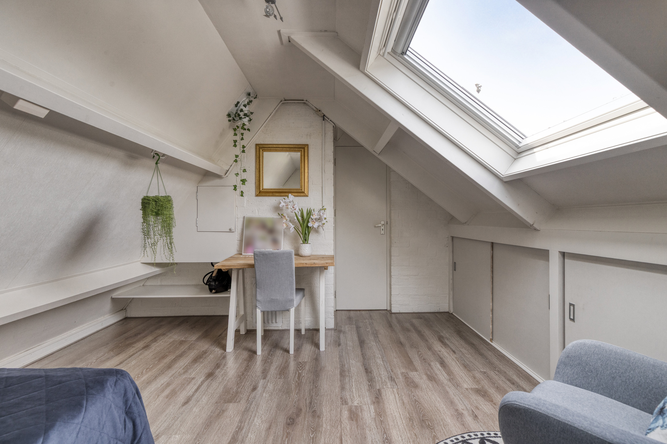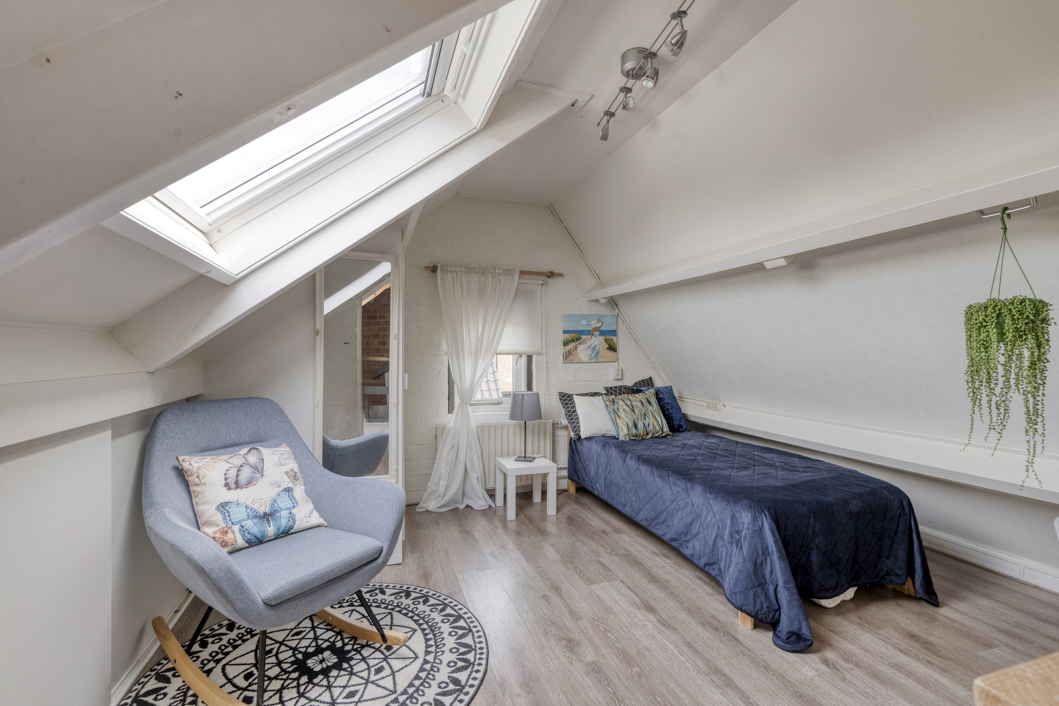 Slaapkamer met dakraam en zijraam en vaste kast. Extra bergruimte is er te vinden achter knieschotten onder het schuine dak.
