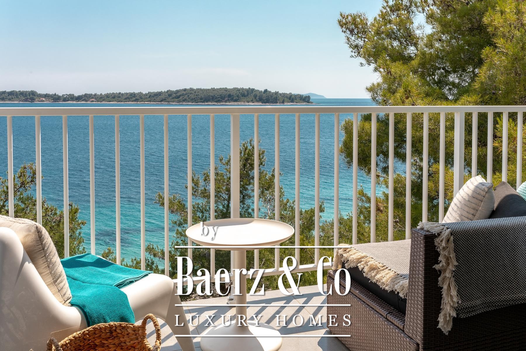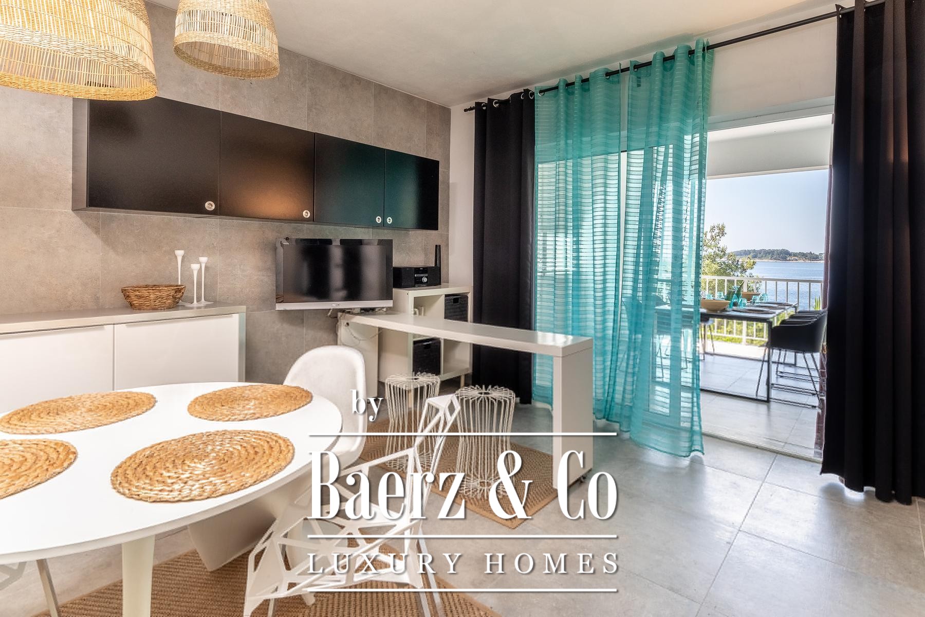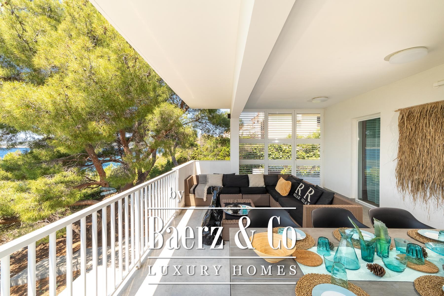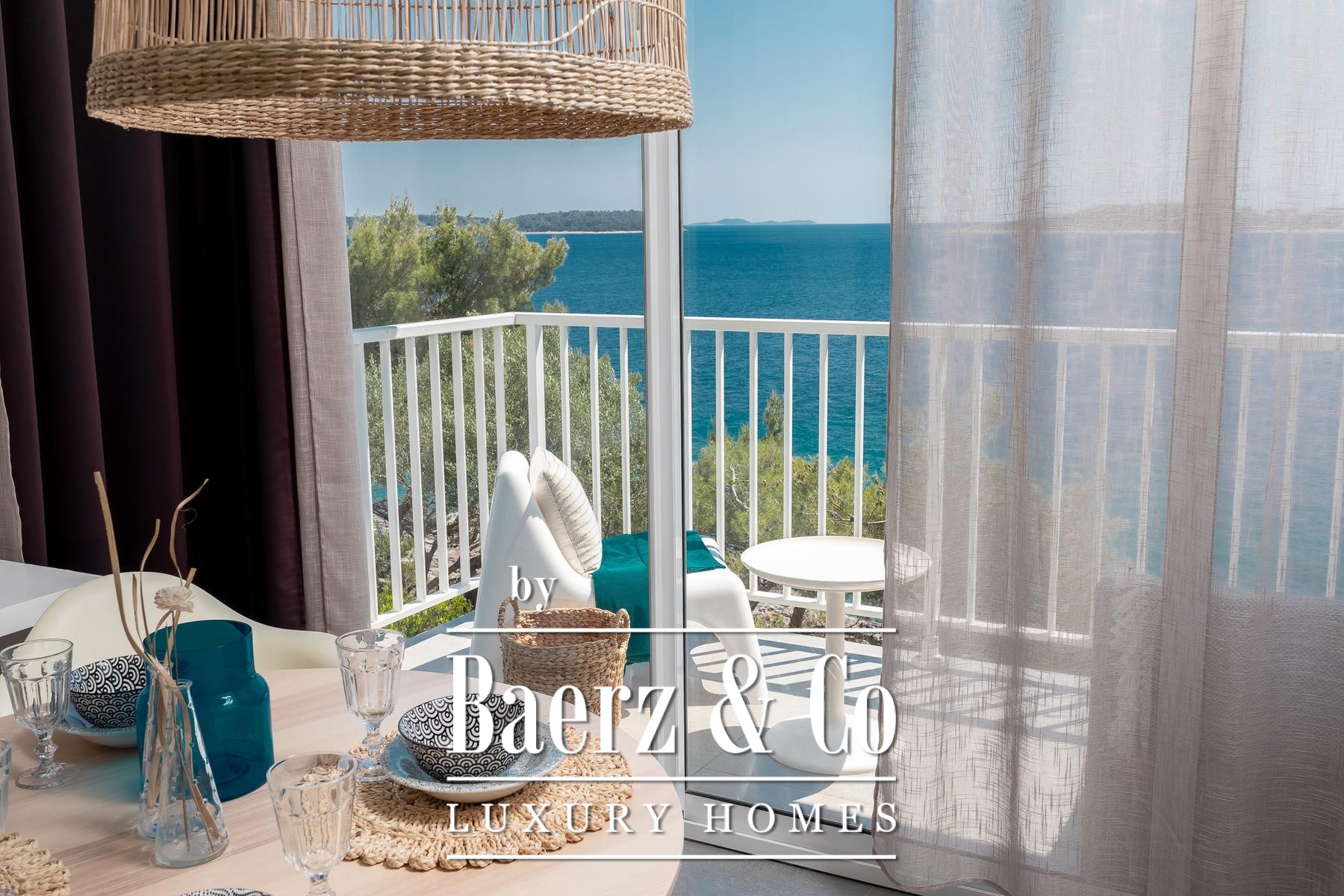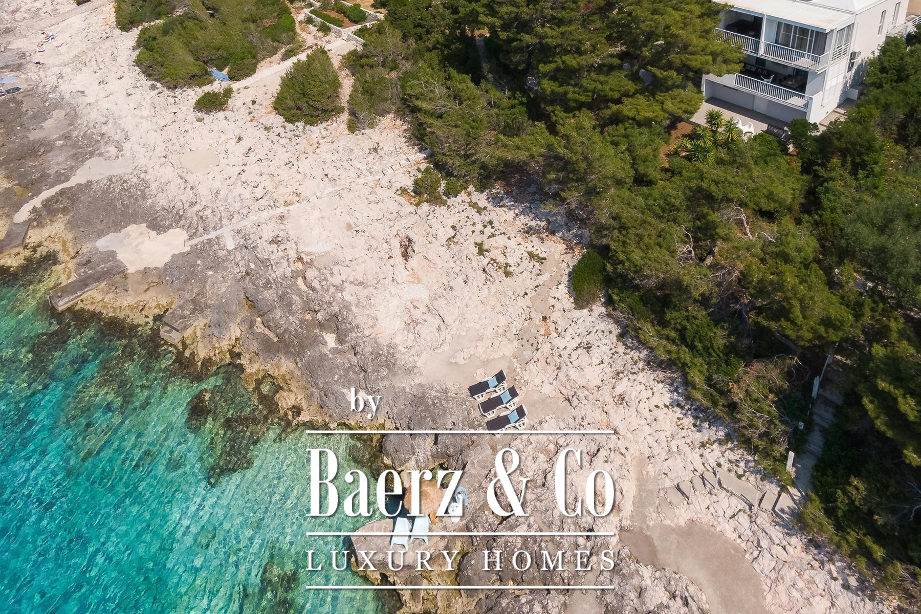 room with a kitchen, dining room, living room and bathroom. The apartment has panoramic sliding doors leading to a terrace with a sea view. This apartment is connected to the lower floor by an internal staircase that has a door so that the lock can be isolated. The second apartment is a studio apartment that has a kitchen connected to the living room and a bathroom. It also has panoramic sliding doors leading to a loggia with a panoramic sea view.Around the villa there is a landscaped yard and gardens and parking for several cars, and in the basement there is an additional storage room in front of which there is a landscaped terrace.The sea, where there is a natural pebble beach on the rocky coast, can be reached by a landscaped path and the entire area around the house is in the natural shade of pine trees.The villa is fully furnished, has a carefully designed interior dominated by light colors and turquoise tones, terraces with a fantastic view that also provide privacy, the beach is just a few steps away and much more that makes this property an unusual opportunity on the island of Korčula.We remain at your disposal for any additional information.