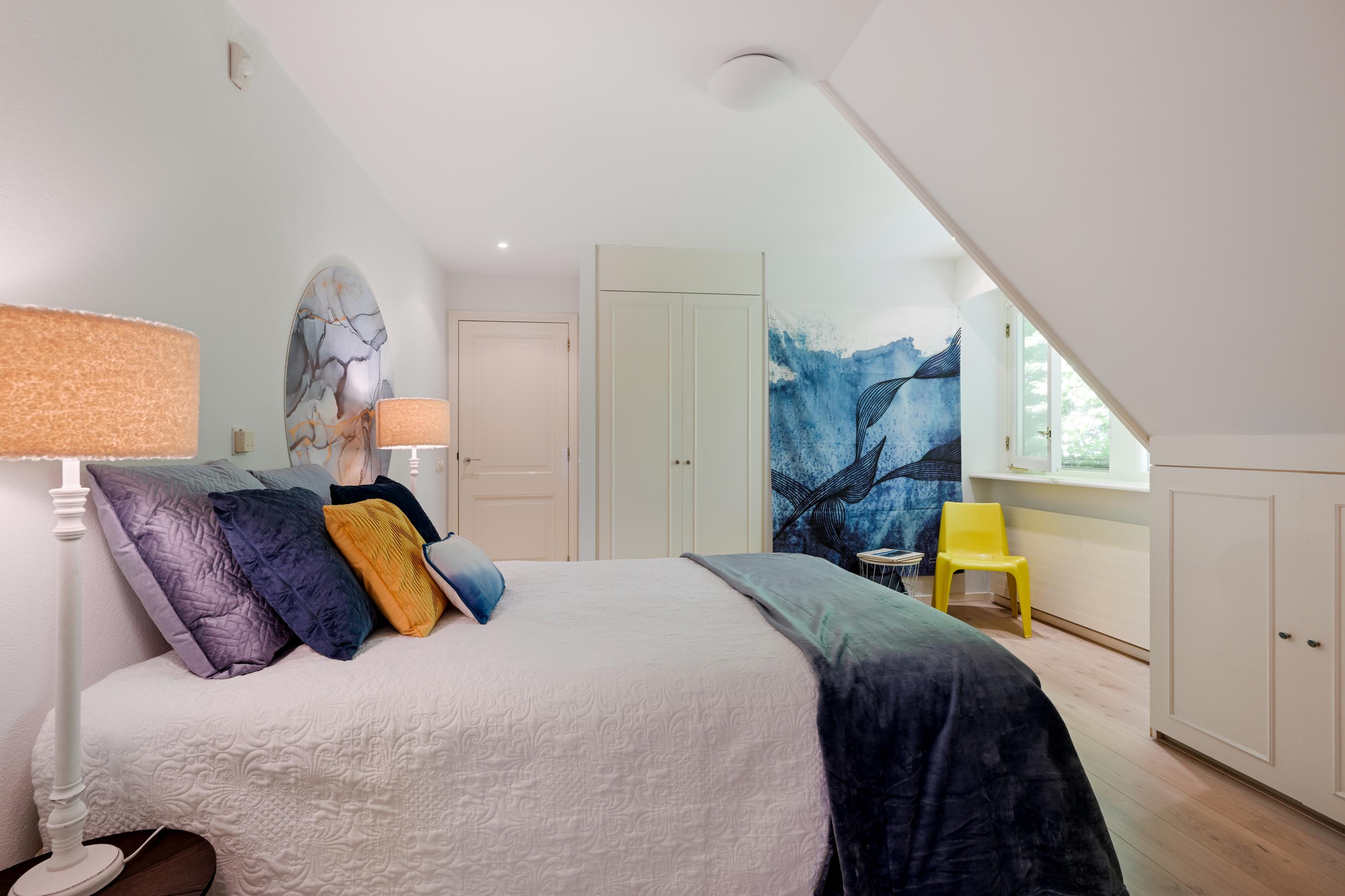 Hal met bordestrap en lift, werkkamer met ronde erker met prachtig uitzicht, ruime slaapkamer met toegang tot balkon, tweede grote (ouder-)slaapkamer met beschut balkon met fraai uitzicht over de tuin, gang naar kleedkamer en eigen badkamer met ligbad, douche, dubbele wastafel in meubel, urinoir en toilet, vloerverwarming. Derde slaapkamer en vierde slaapkamer beide met dakkapel en beide met toegang naar badkamer met bad, douche, toilet, urinoir, wastafelmeubel en vloerverwarming.