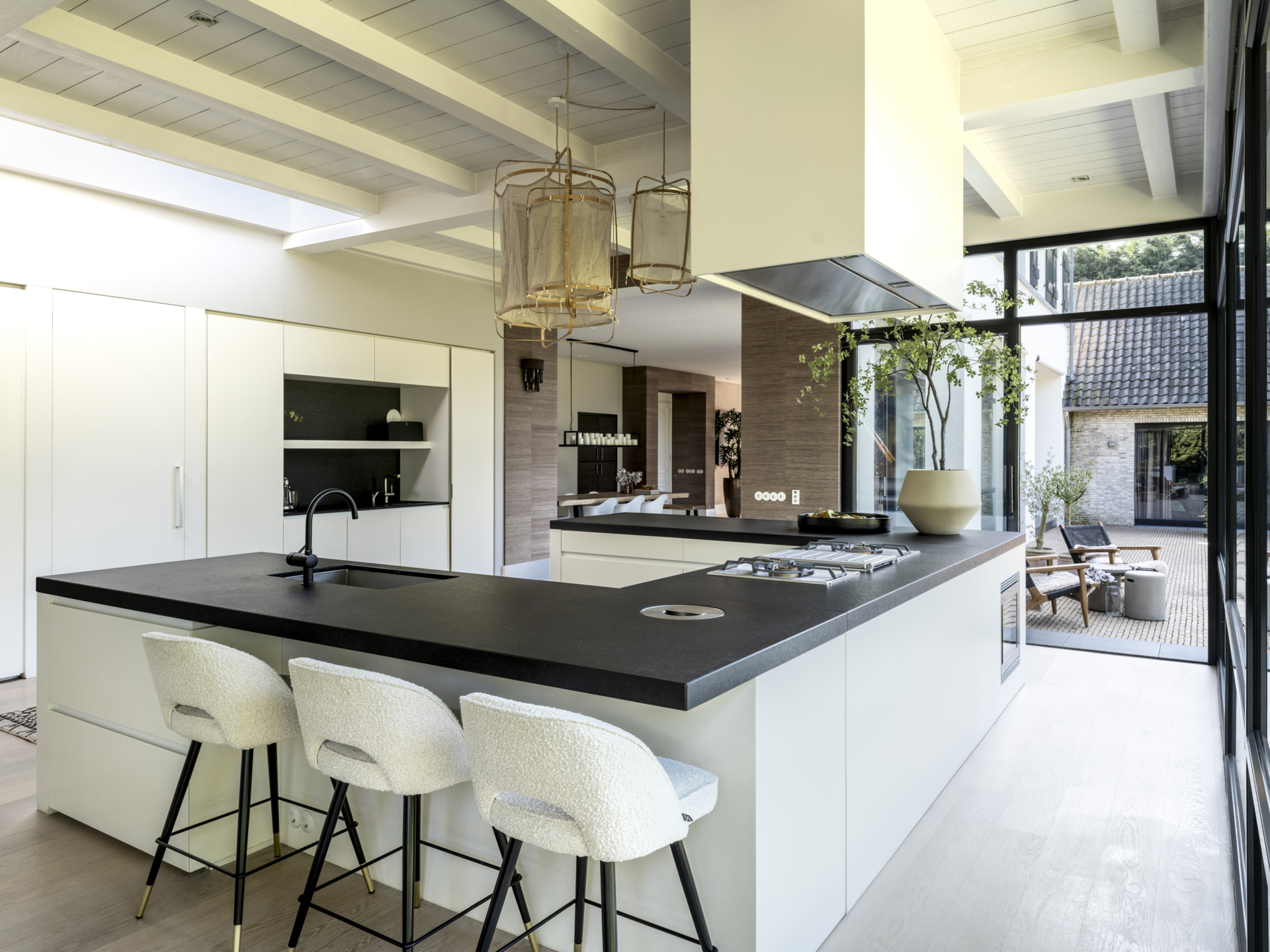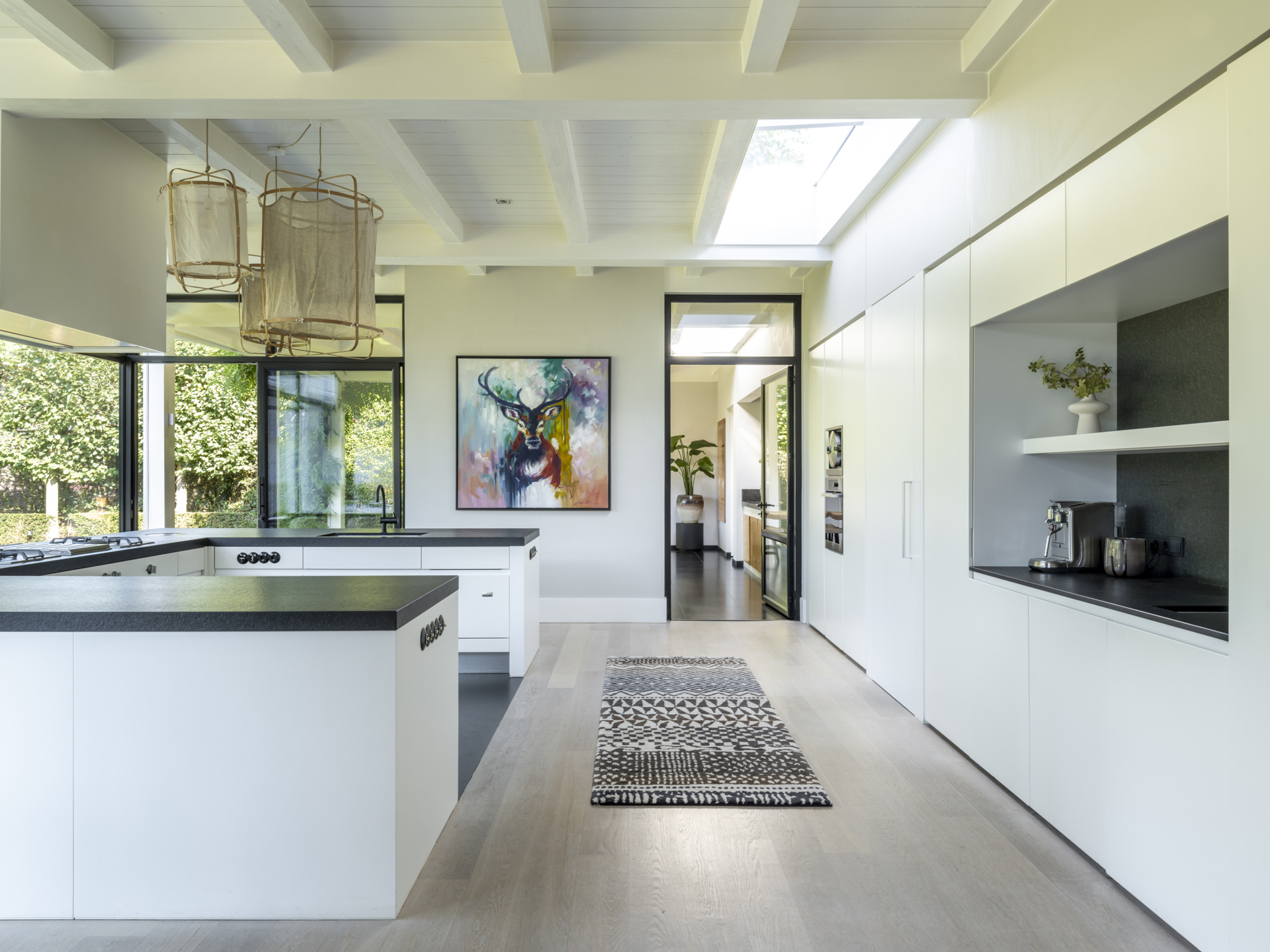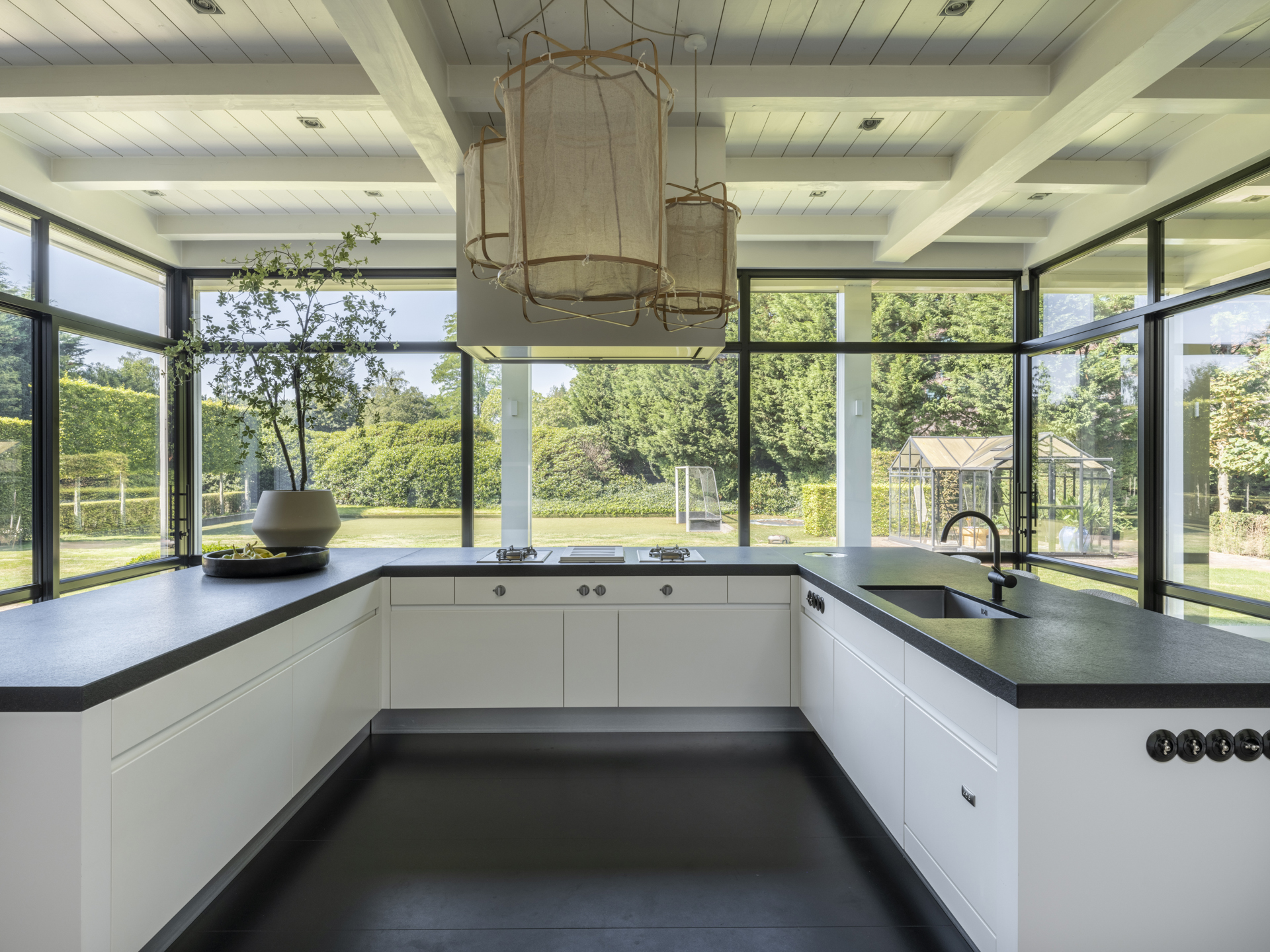 De keuken is uitgevoerd met een zeer luxe inrichting, uiteraard van alle gemakken en apparatuur voorzien. Door de glaspartij rondom kookt u als het ware ’in de tuin’.
