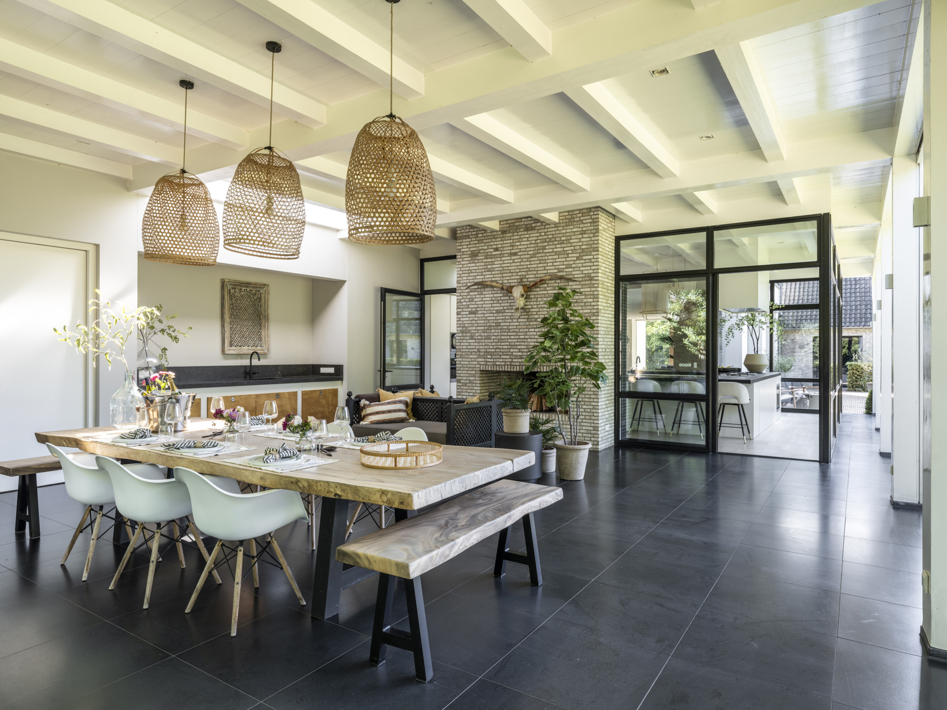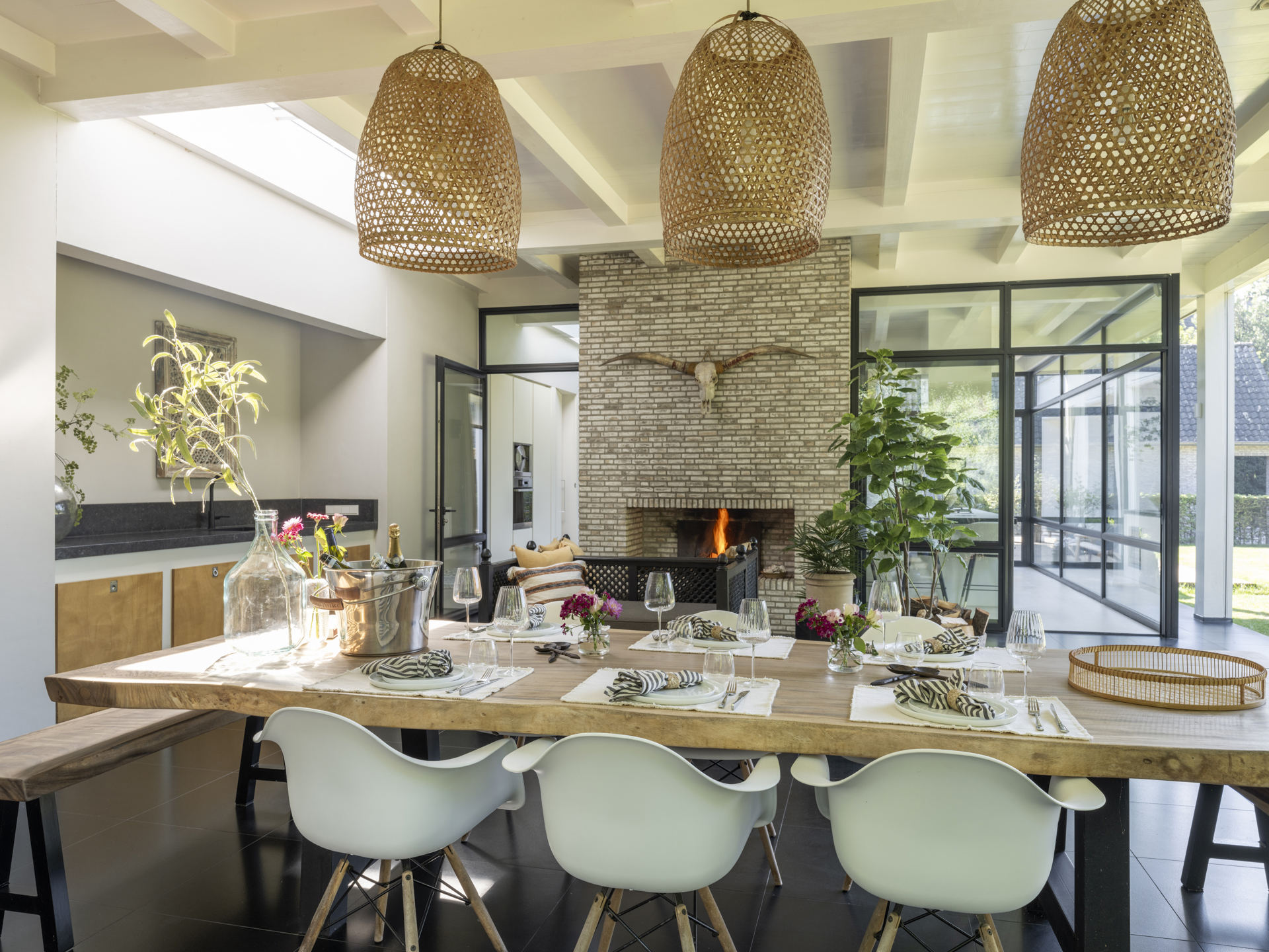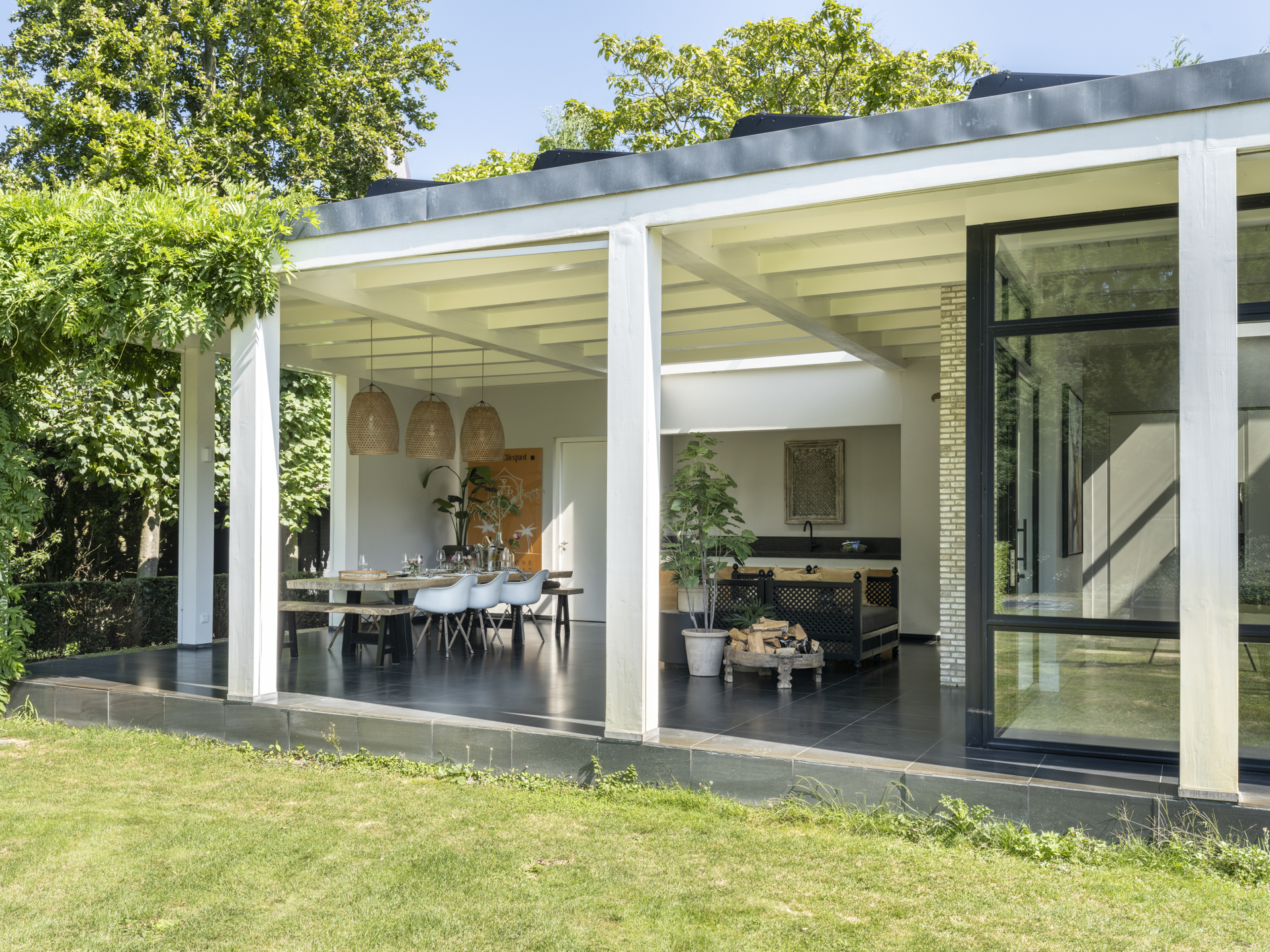 Aan de keuken grenst het riante, geheel overdekte terras, de veranda. Deze veranda, net als de keuken voorzien van screens, is feitelijk een verlengstuk van de leefruimte en is voorzien van een heerlijke open haard.