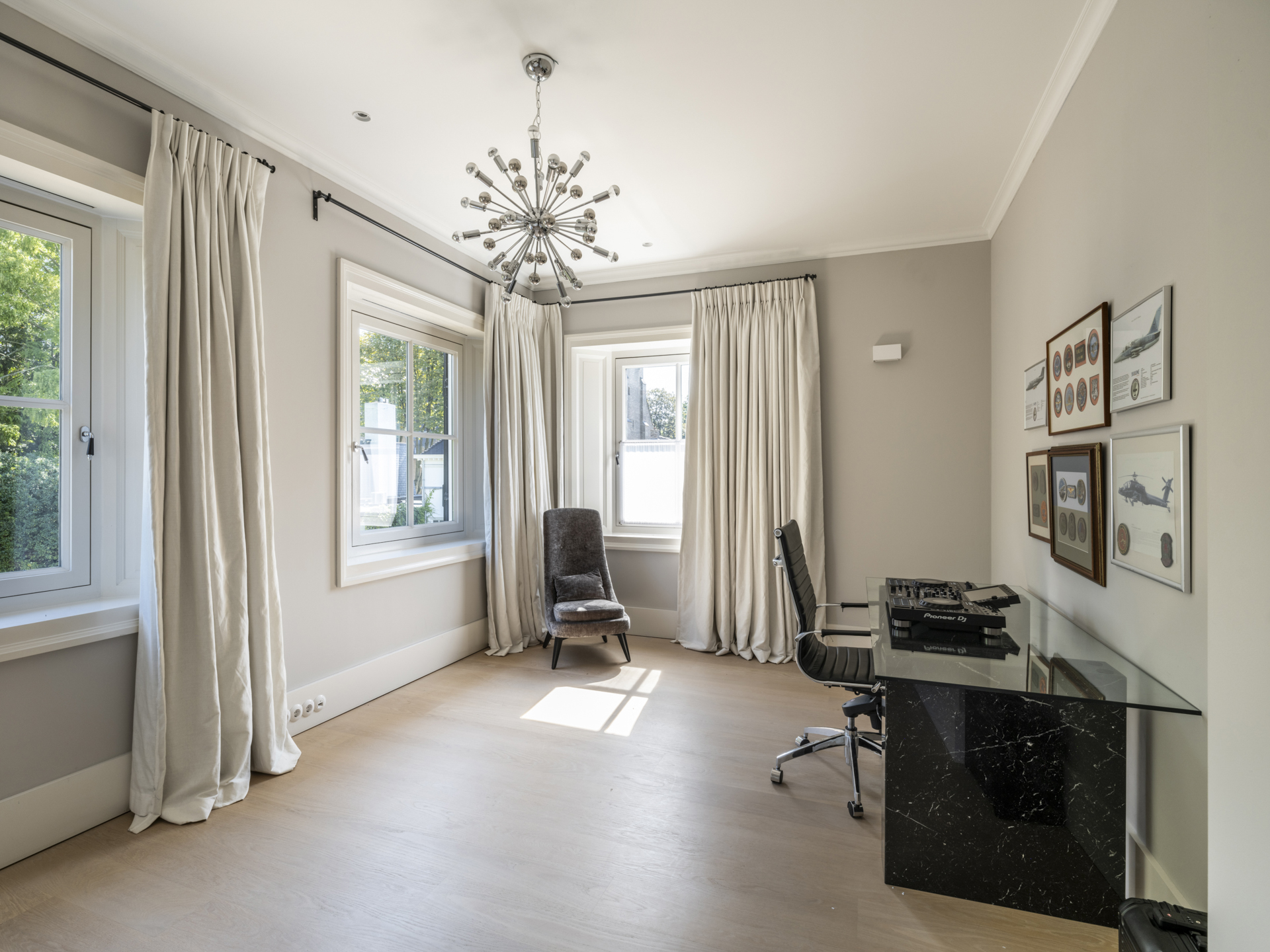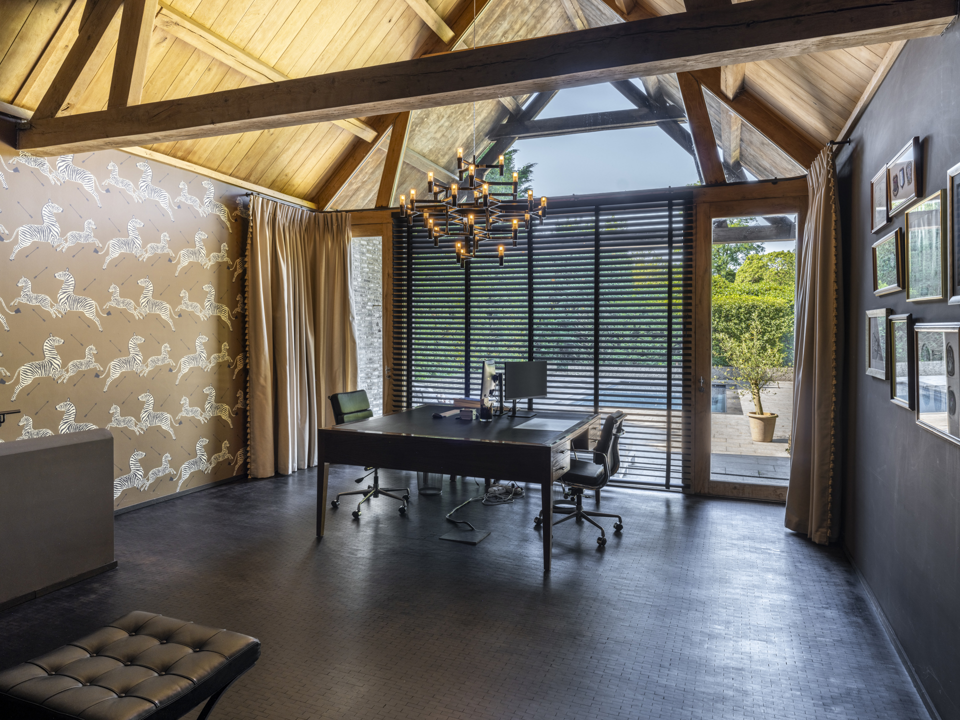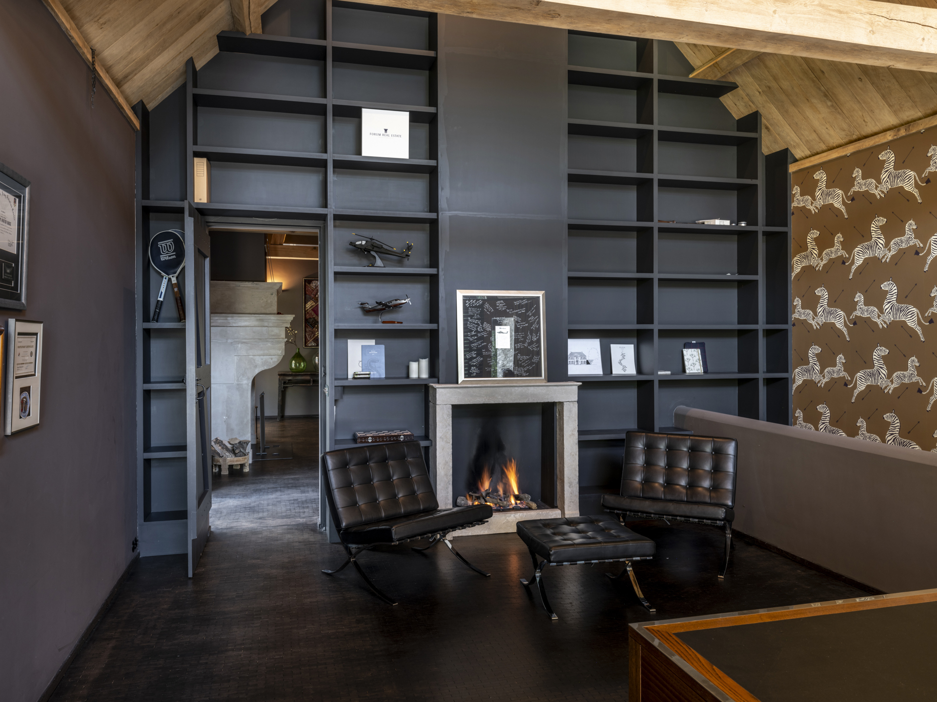 De linkervleugel is een plek om te werken en ontspannen, met een sfeervolle werkkamer aan de achterzijde van het huis. De hiervoor gelegen behaaglijk aandoende haardkamer verbindt de woonkamer en de werkkamer met elkaar.