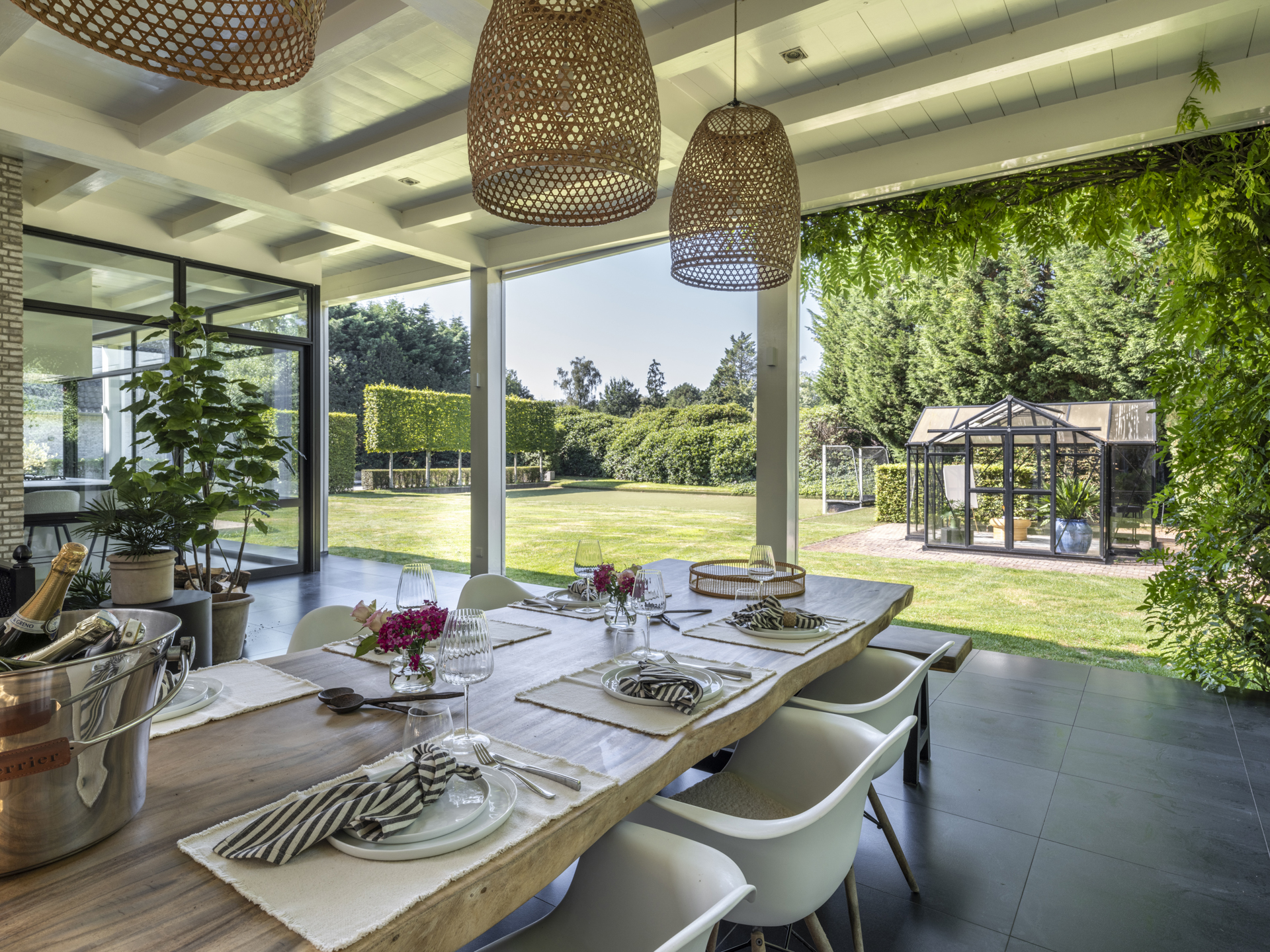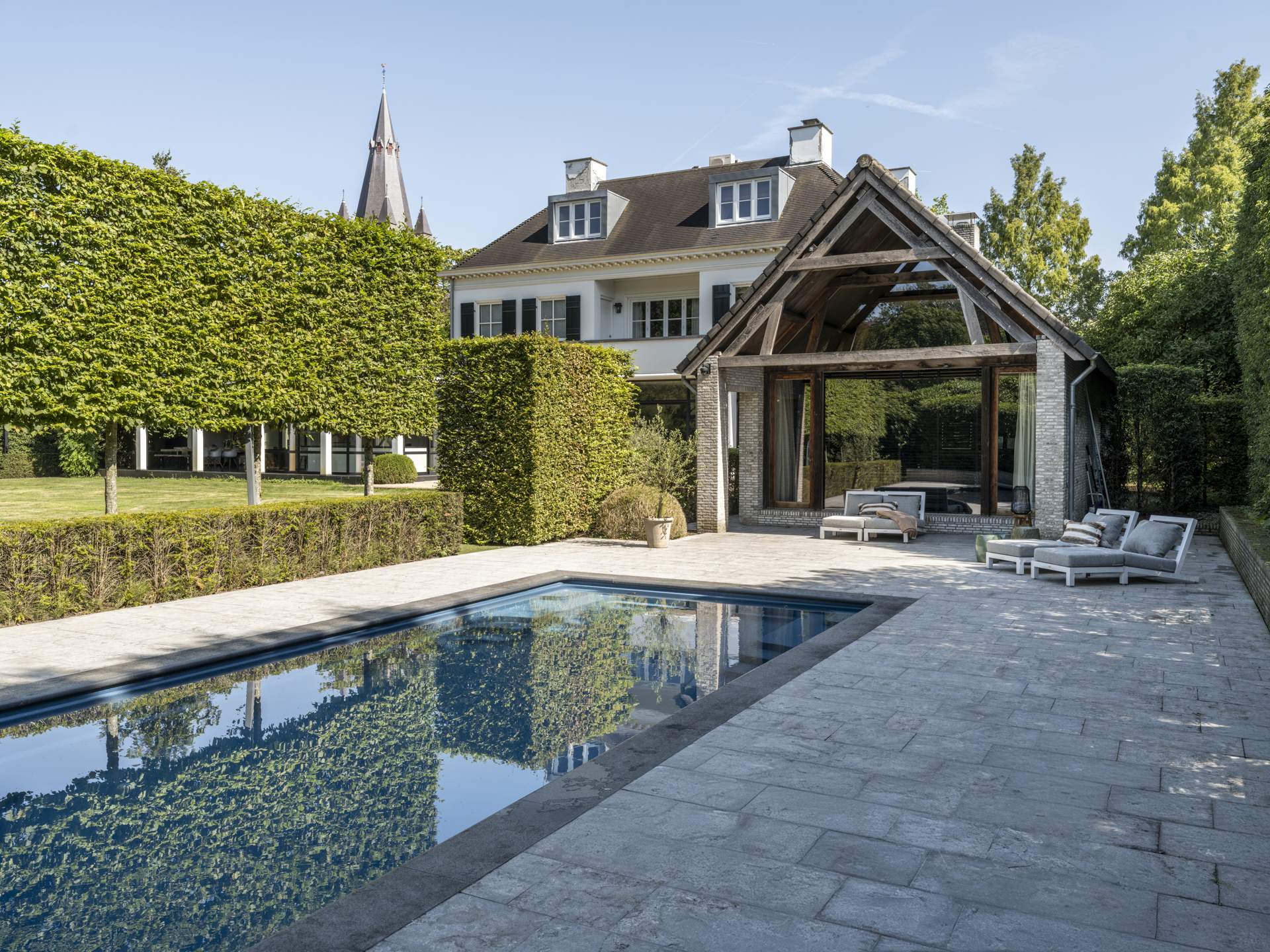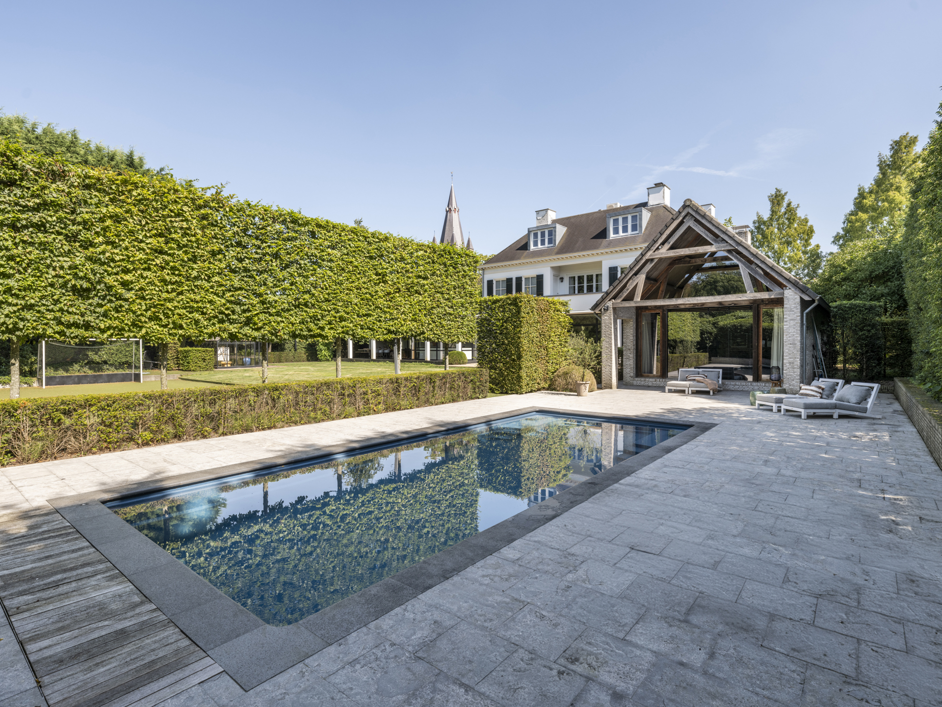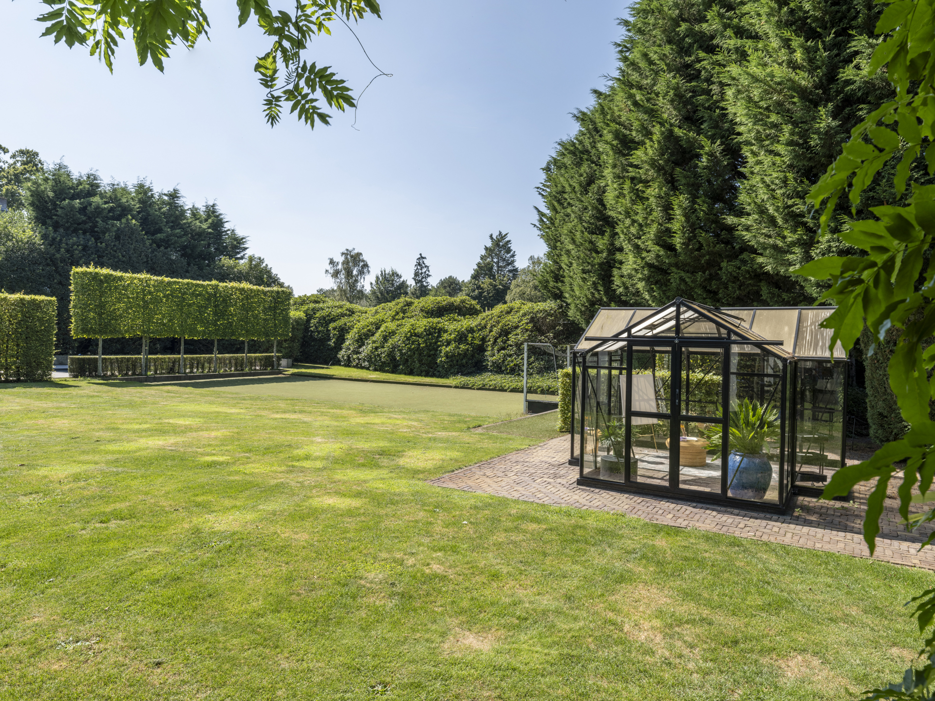 Het zwembad is door een haag ietwat aan het oog onttrokken. Vanuit de keuken bereikt u het royale overdekt terras, waar u zich in Zuid-Frankrijk waant. Beschut tegen regen ofwel hete zon kijkt u prachtig over de fraaie tuin uit, waar kinderen onder ander kunnen spelen op het kunstgras-hockeyveld.