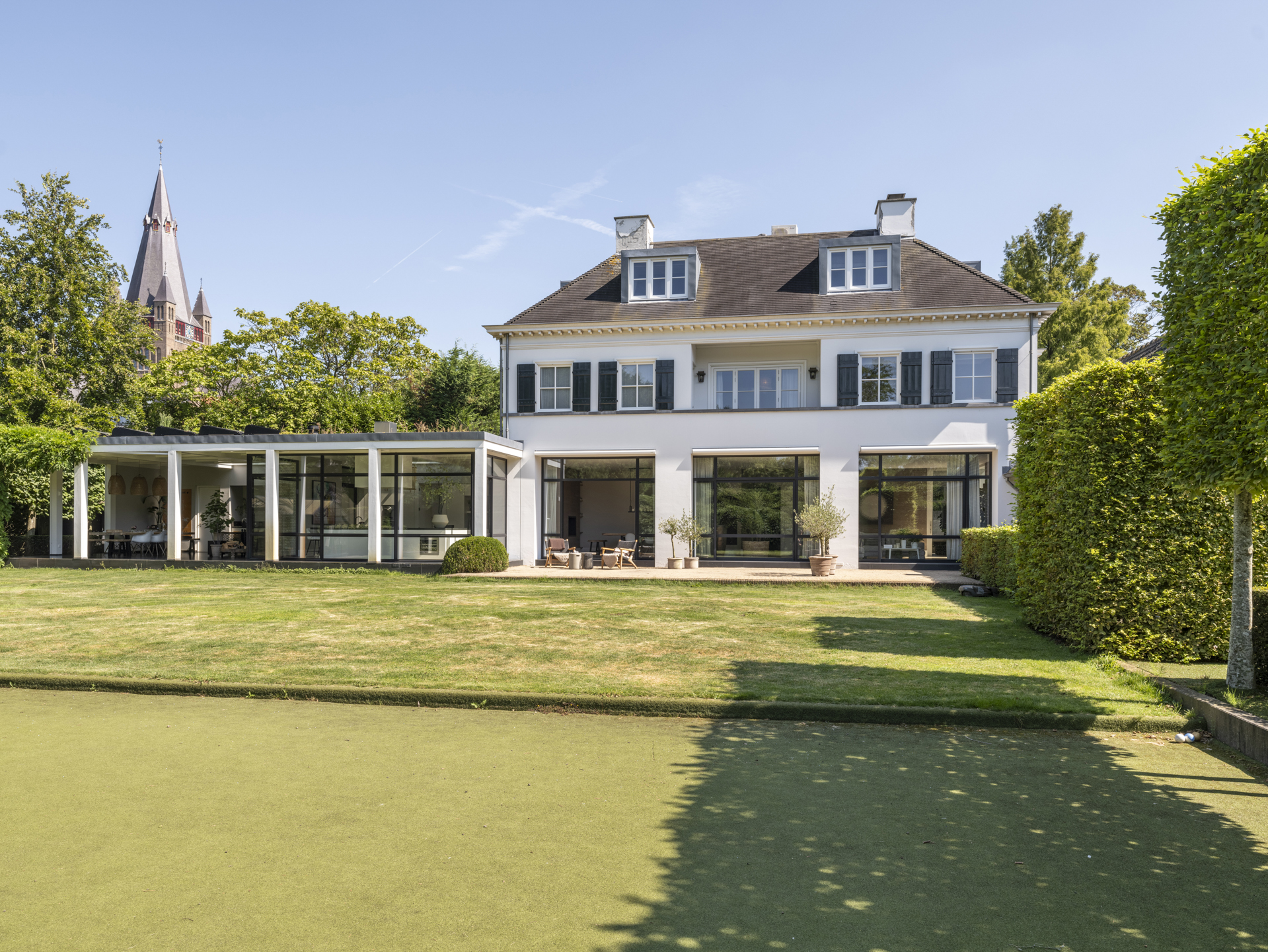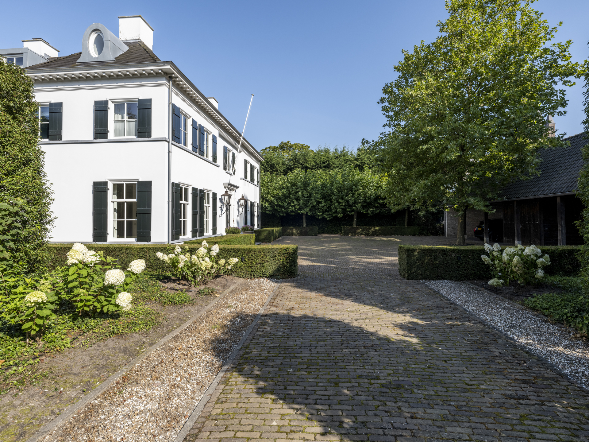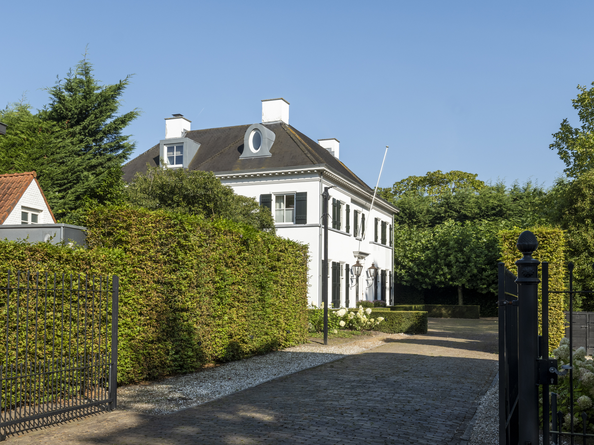 Achter de poort treft u de binnenplaats met platanen en een houten schuur voor 4 auto’s. Het 850m² grote landhuis werd in 2011 gebouwd en laat een combinatie van classicistische en moderne architectuur zien, die zich uit in statige allure en maximaal, modern wooncomfort. ‘s Zomers is het op het circa 3.200m² grote en beveiligde perceel genieten van het zwembad, de (overdekte) terrassen en het ruime grasveld, voor de kinderen is een hockeyveld in kunstgras aangelegd. ’s Winters bieden de lichte, op de tuin gerichte vertrekken een geborgen plek met rust en ruimte, midden in het gezellige Ginneken.