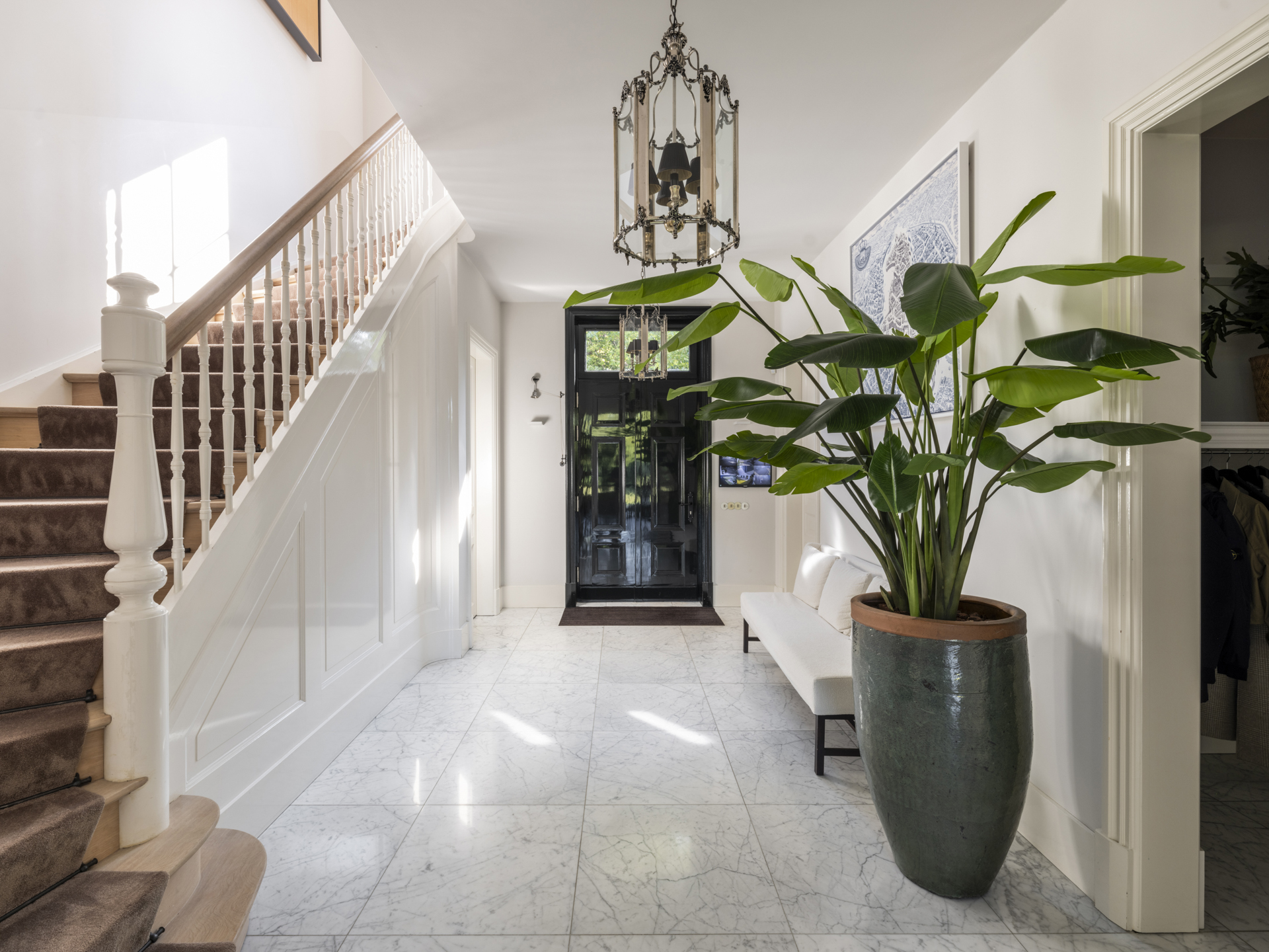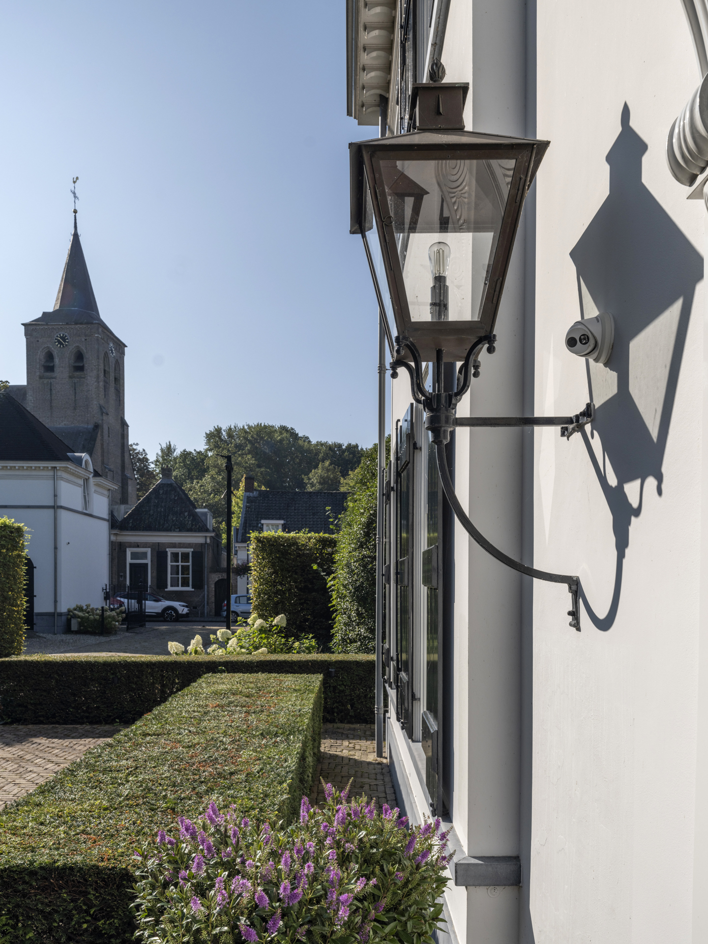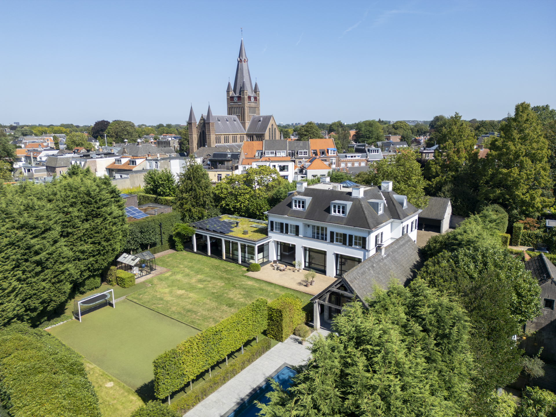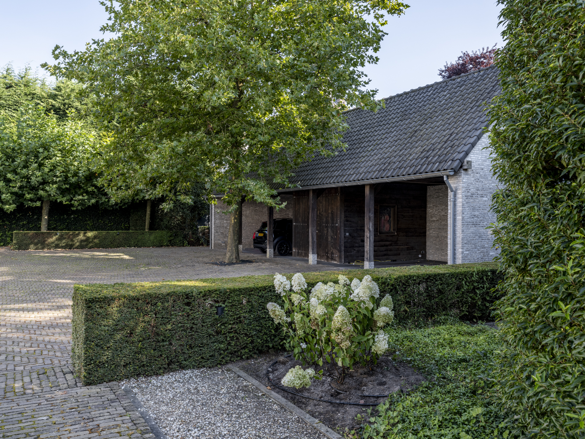 Achter de poort treft u de binnenplaats met platanen en een houten schuur voor 4 auto’s. Het 850m² grote landhuis werd in 2011 gebouwd en laat een combinatie van classicistische en moderne architectuur zien, die zich uit in statige allure en maximaal, modern wooncomfort. ‘s Zomers is het op het circa 3.200m² grote en beveiligde perceel genieten van het zwembad, de (overdekte) terrassen en het ruime grasveld, voor de kinderen is een hockeyveld in kunstgras aangelegd. ’s Winters bieden de lichte, op de tuin gerichte vertrekken een geborgen plek met rust en ruimte, midden in het gezellige Ginneken.