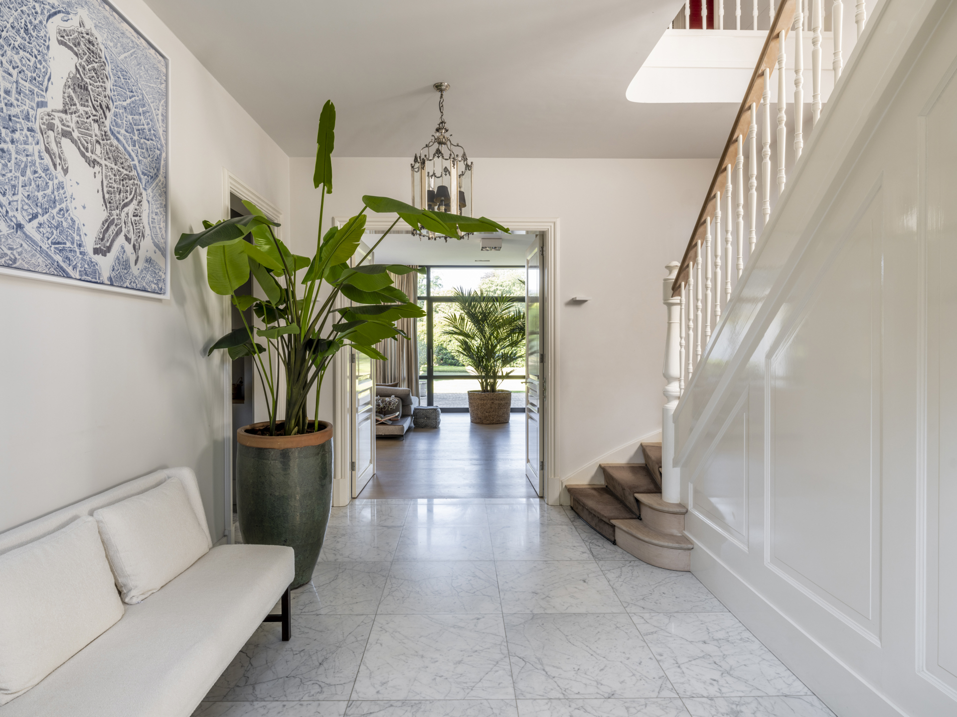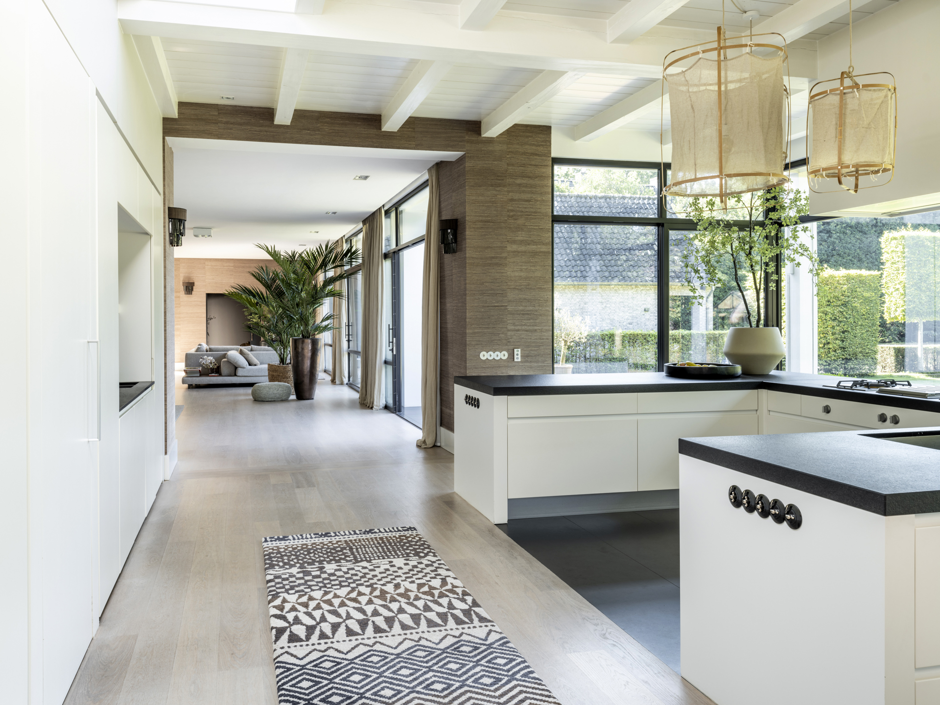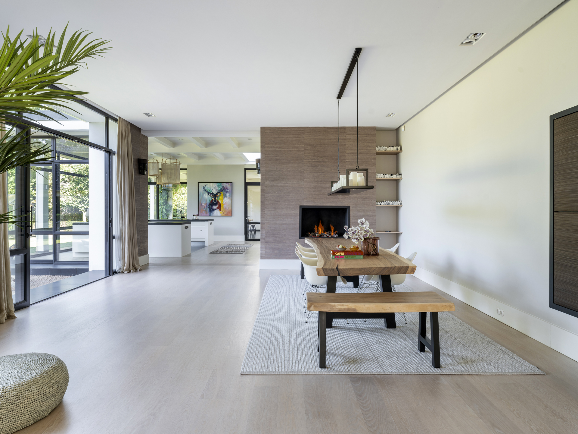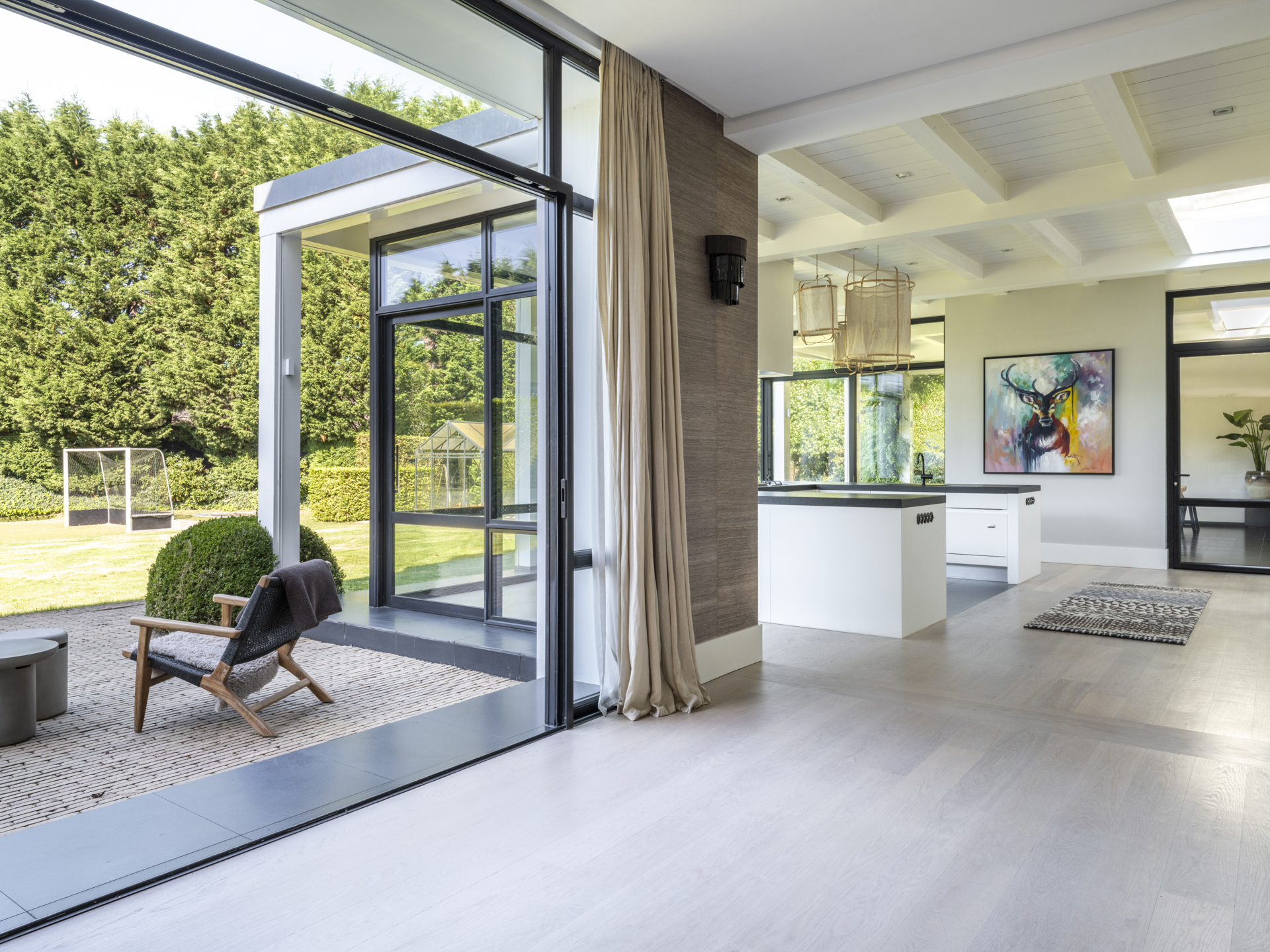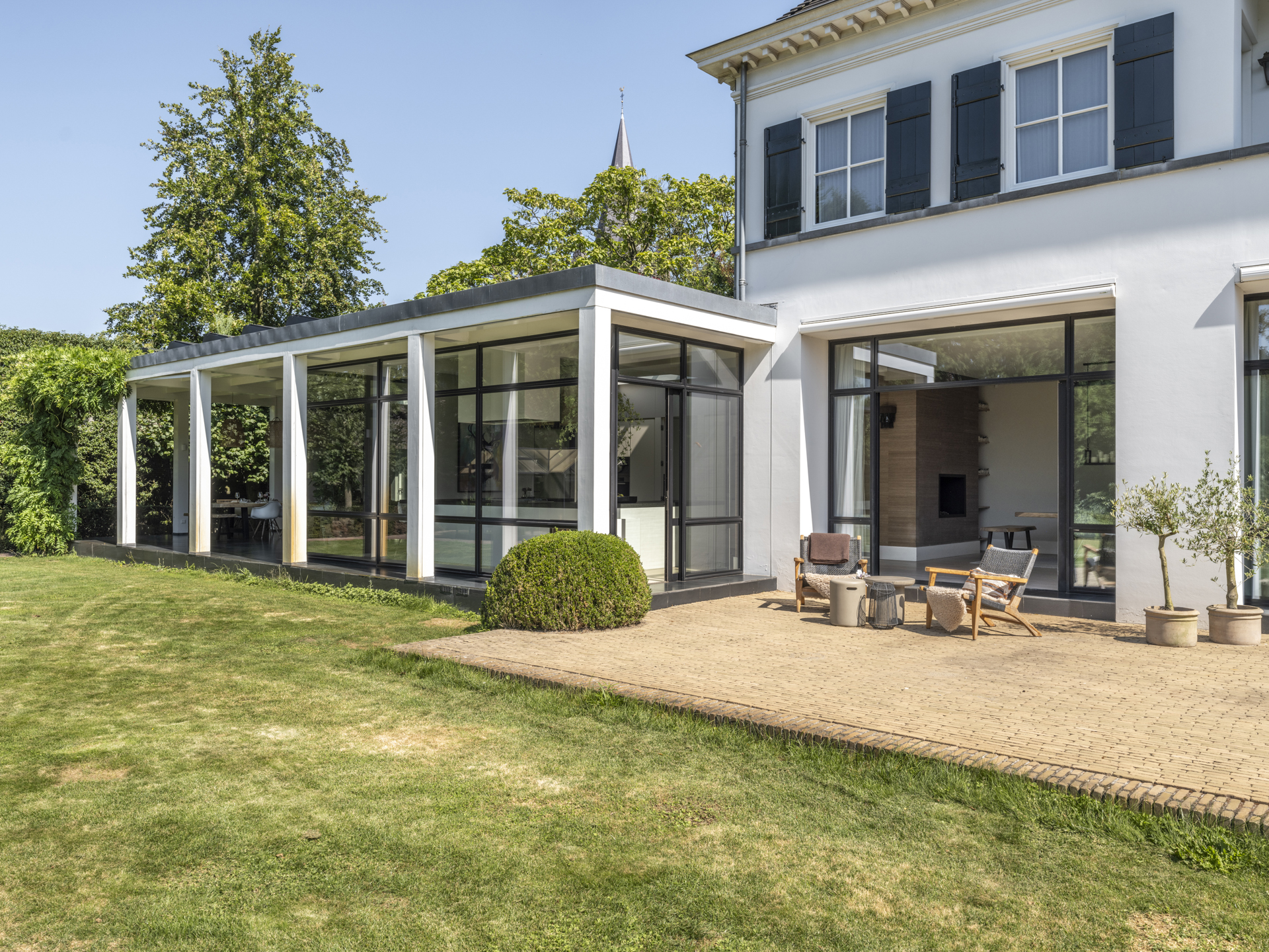 Vanuit de klassieke entree zijn de praktische mudroom met zijentree en de zit– en eetkamer te bereiken. Deze lichte en open living verbindt twee zijvleugels met elkaar en heeft bovendien een prachtige lichtinval en mooi zicht op de gehele tuin. Activiteit en gezelligheid zijn gecentreerd rondom de keuken (met aangrenzend een ruime en praktische bijkeuken) en het overdekte terras. Aan de voorzijde treft u, grenzend aan de living, een aparte televisie- c.q. werkkamer met zicht op het erf.