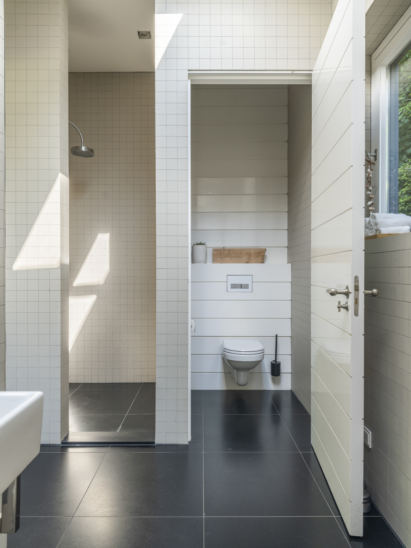 Aan de veranda grenst de (buiten)badkamer met onder andere een toilet en een douche.