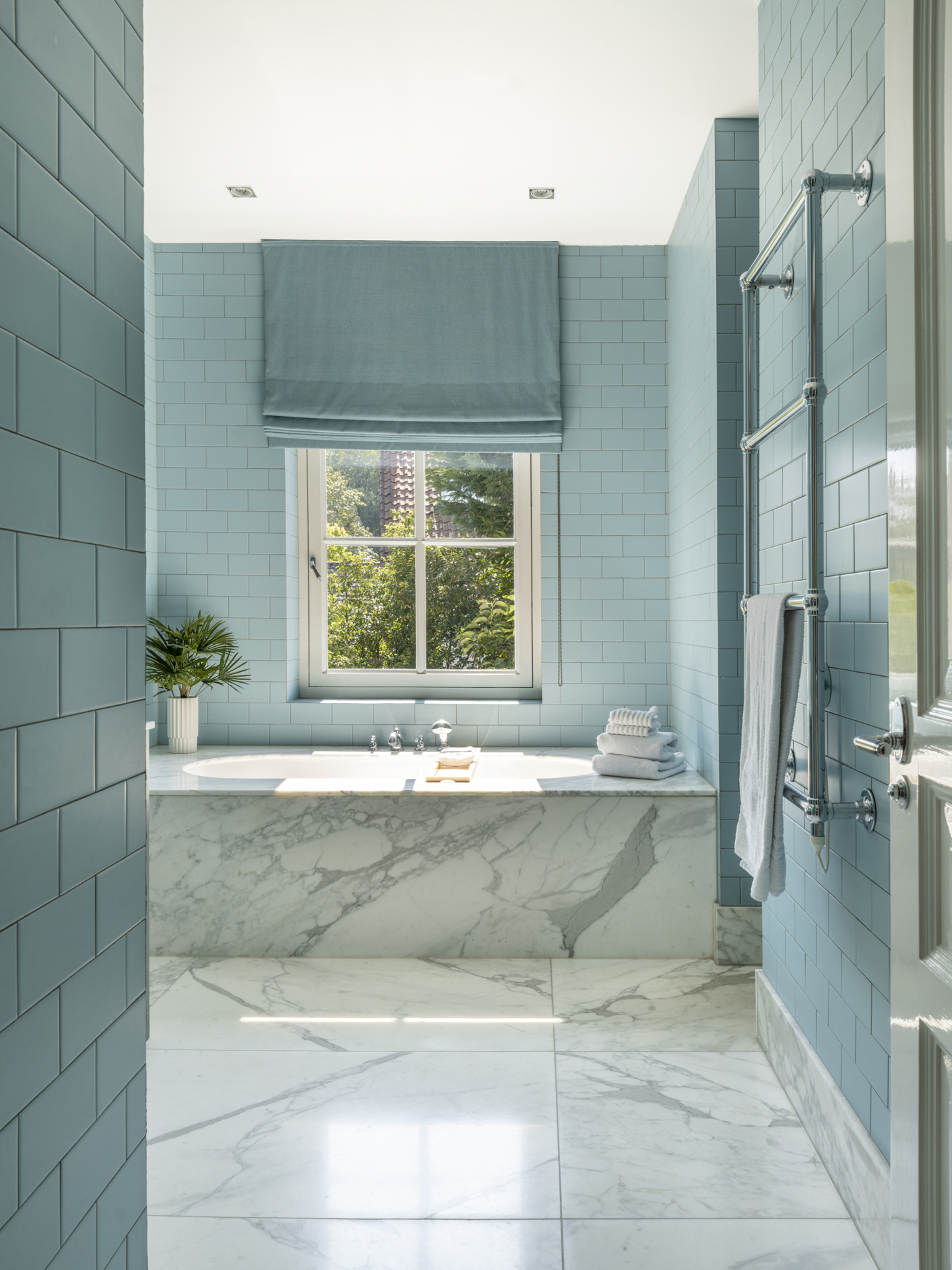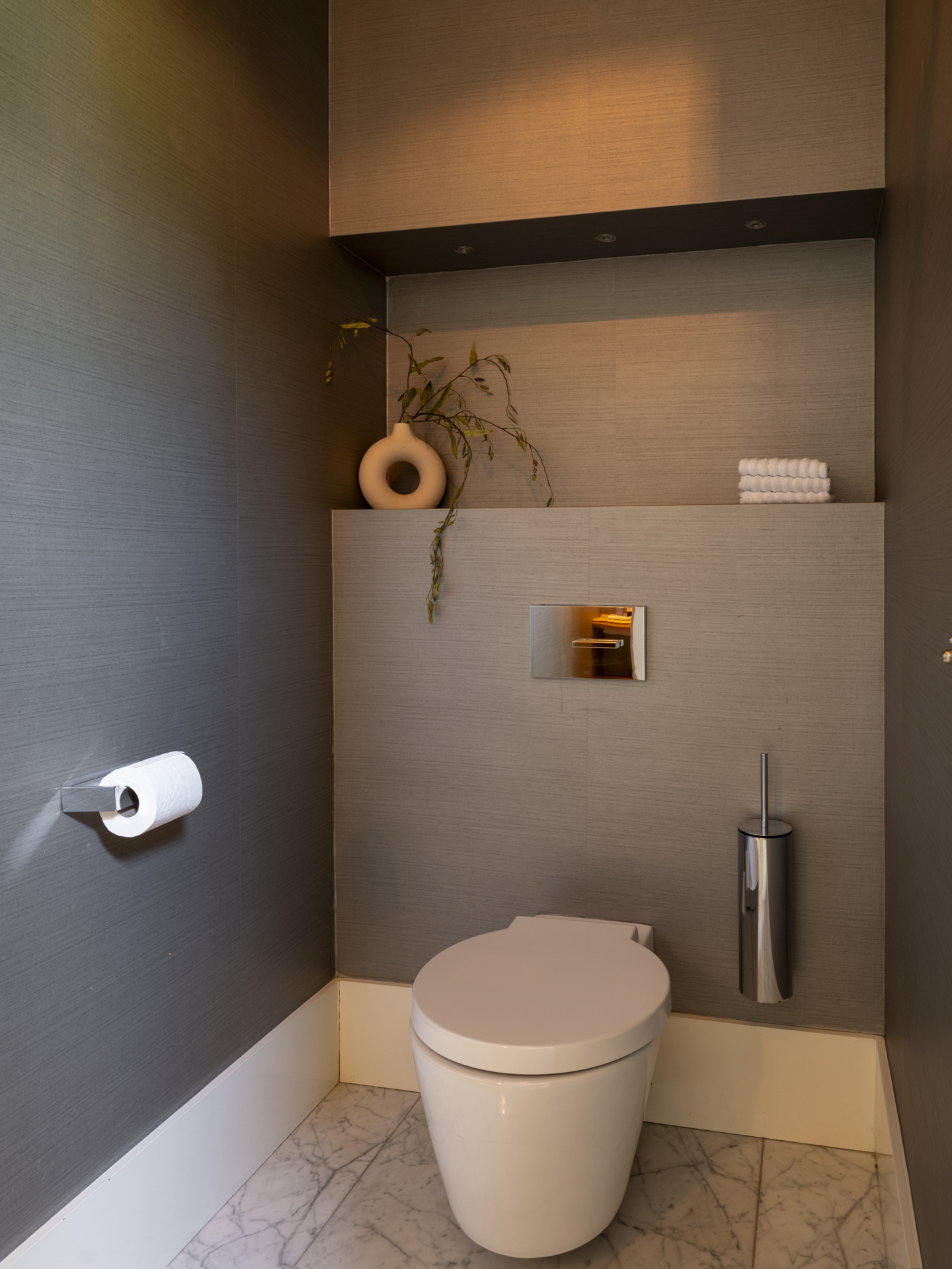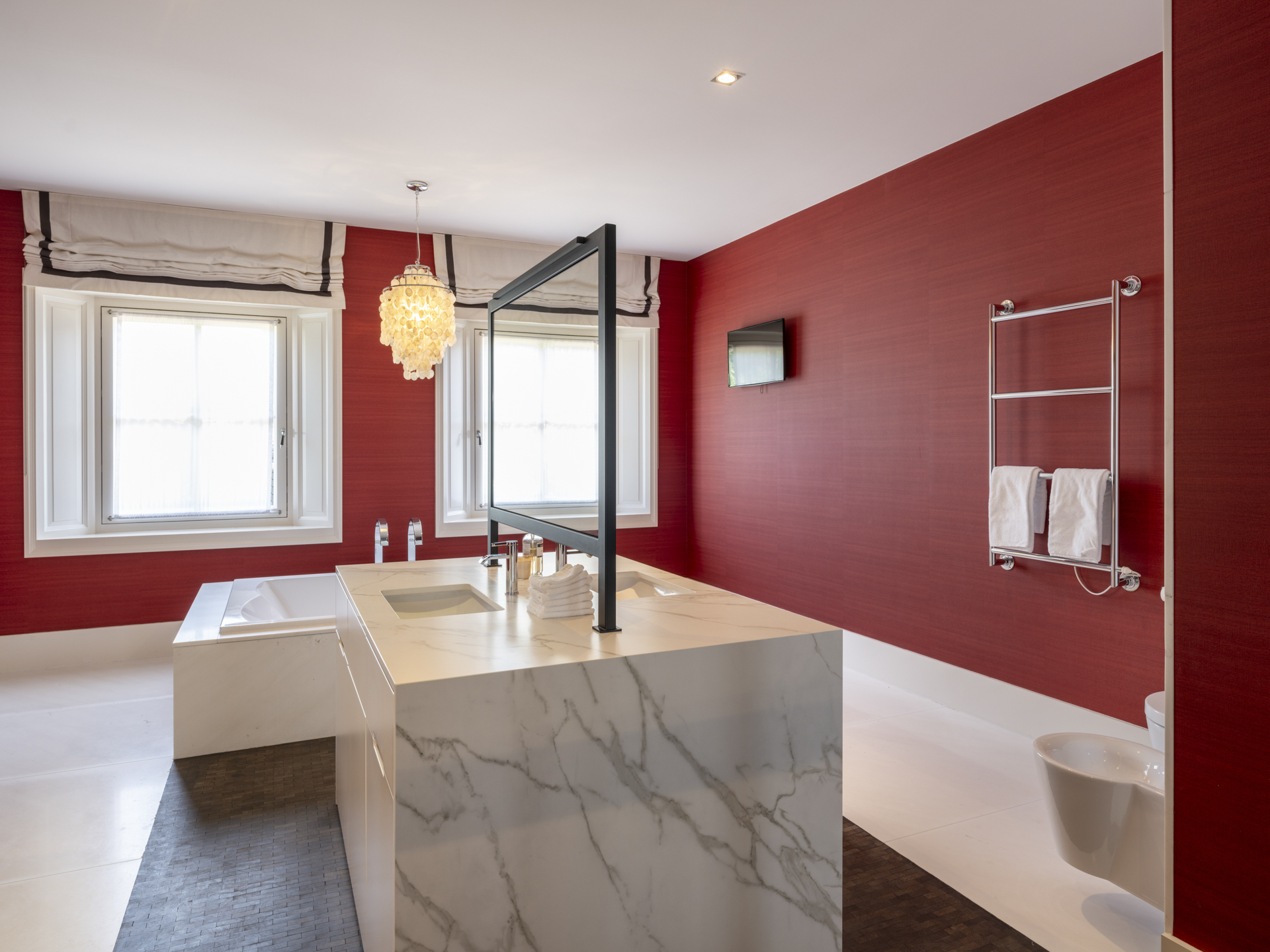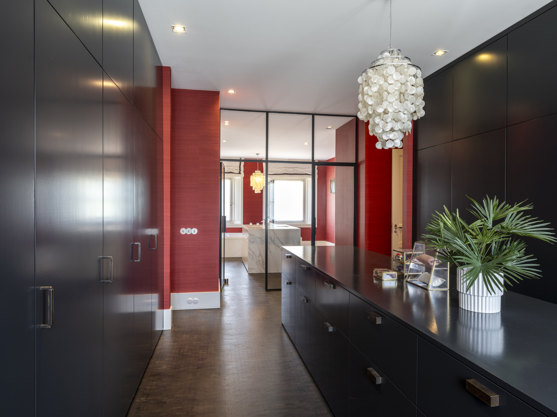 De dressingroom is uitgevoerd met prachtige (op maat gemaakte) meubelen met veel hang- en legruimte. De badkamer is zeer ruim en voorzien van onder andere een riant duo-ligbad, een grote inloopdouche, een toilet en een bidet.